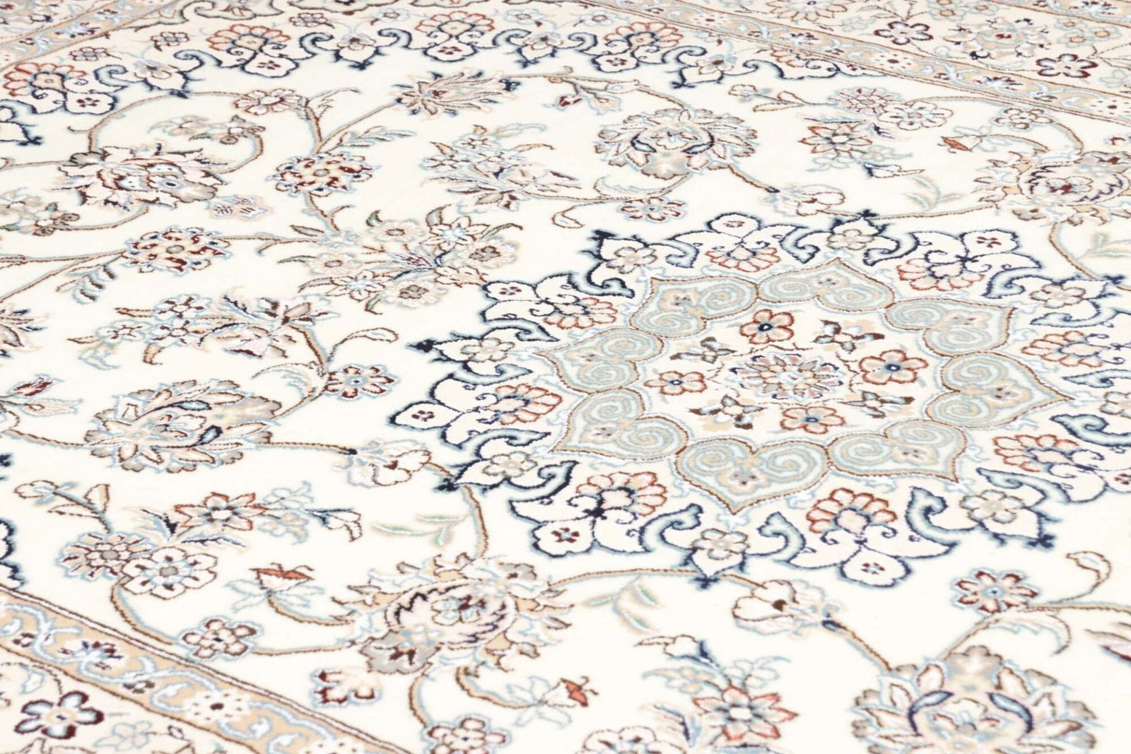 Der Nain Teppich wird aus hochwertigen Materialien hergestellt, die nicht nur für ihre Langlebigkeit, sondern auch für ihre ästhetischen Eigenschaften bekannt sind. Traditionell werden für die Herstellung von Perserteppichen, wie diesem Nain Teppich, Schafwolle und Seide verwendet. Die Wolle sorgt für Wärme und Strapazierfähigkeit, während die Seide Glanz und Eleganz verleiht. Ein handgeknüpfter Teppich zeichnet sich durch seine herausragende Knotendichte aus, was bedeutet, dass er nicht nur schön aussieht, sondern auch eine lange Lebensdauer hat. Die Knotendichte dieses Teppichs garantiert detailreiche Muster und eine weiche, angenehme Oberfläche.