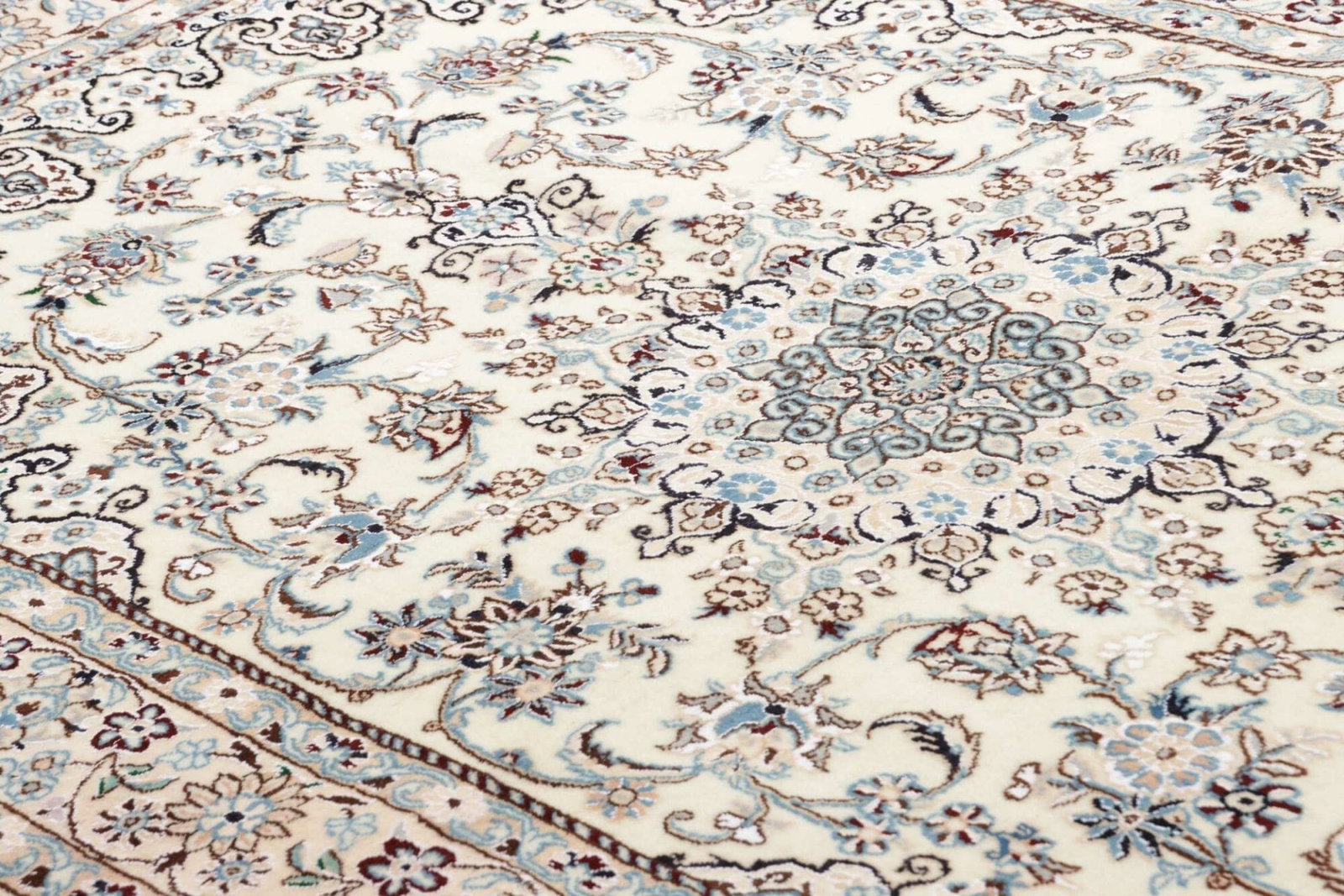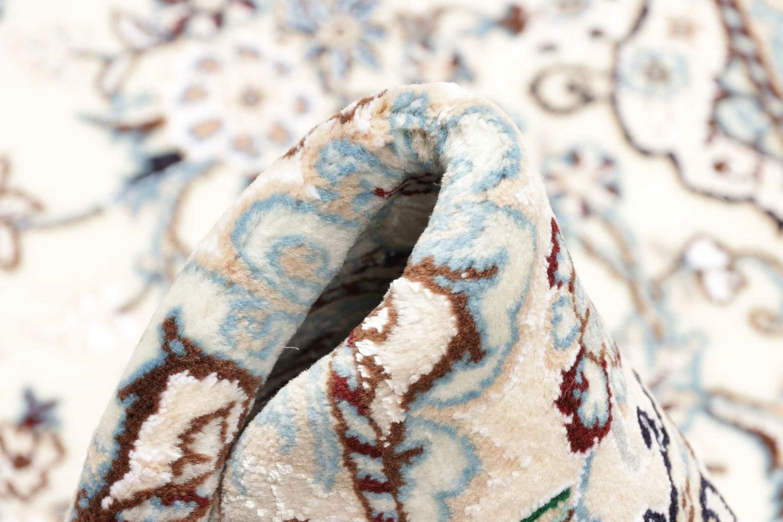 Der Nain Teppich wird aus qualitativ hochwertigen Materialien gefertigt, die seine Langlebigkeit und Weichheit garantieren. Die Verwendung von reiner Wolle und Seide sorgt nicht nur für einen angenehmen Komfort, sondern auch für eine außergewöhnliche Haptik. Ein herausragendes Merkmal dieses Teppichs ist die hohe Knotendichte, die eine detailreiche Musterung ermöglicht und die Strapazierfähigkeit des Teppichs erhöht. Diese handgeknüpfte Technik, die seit Jahrhunderten in der Teppichherstellung verwendet wird, sorgt dafür, dass jedes Stück ein Unikat ist.