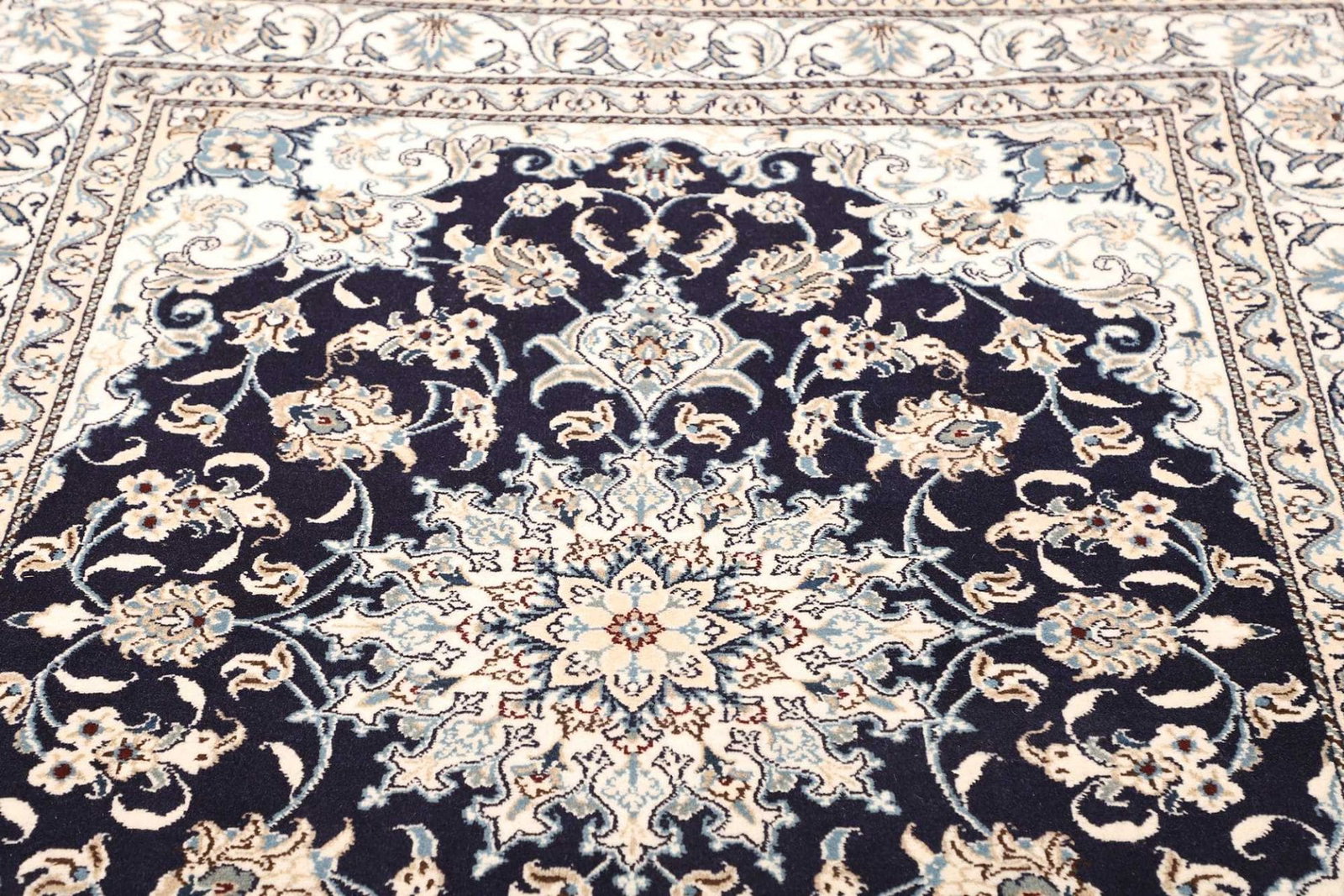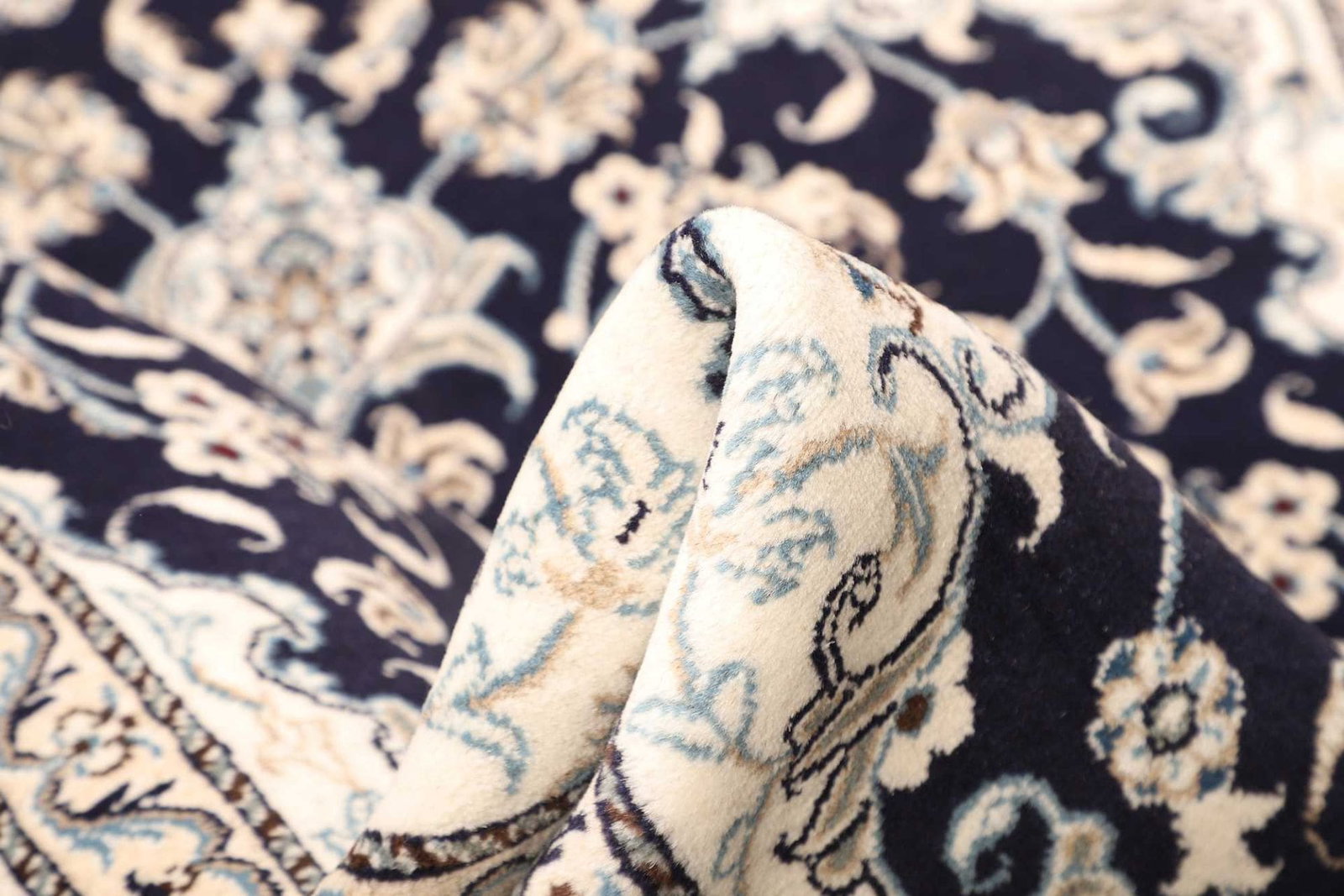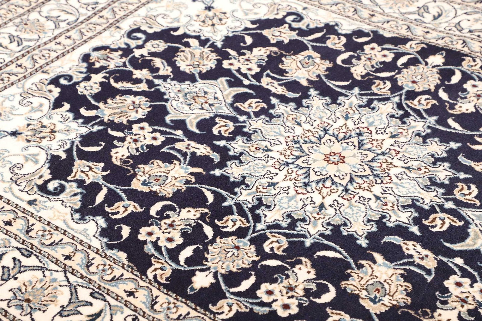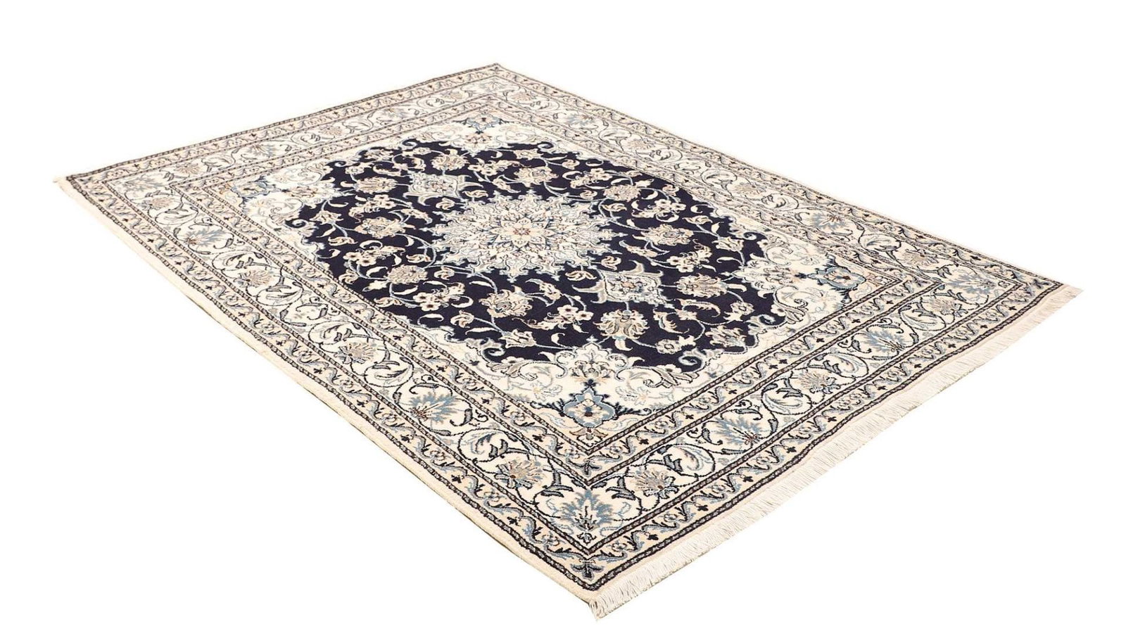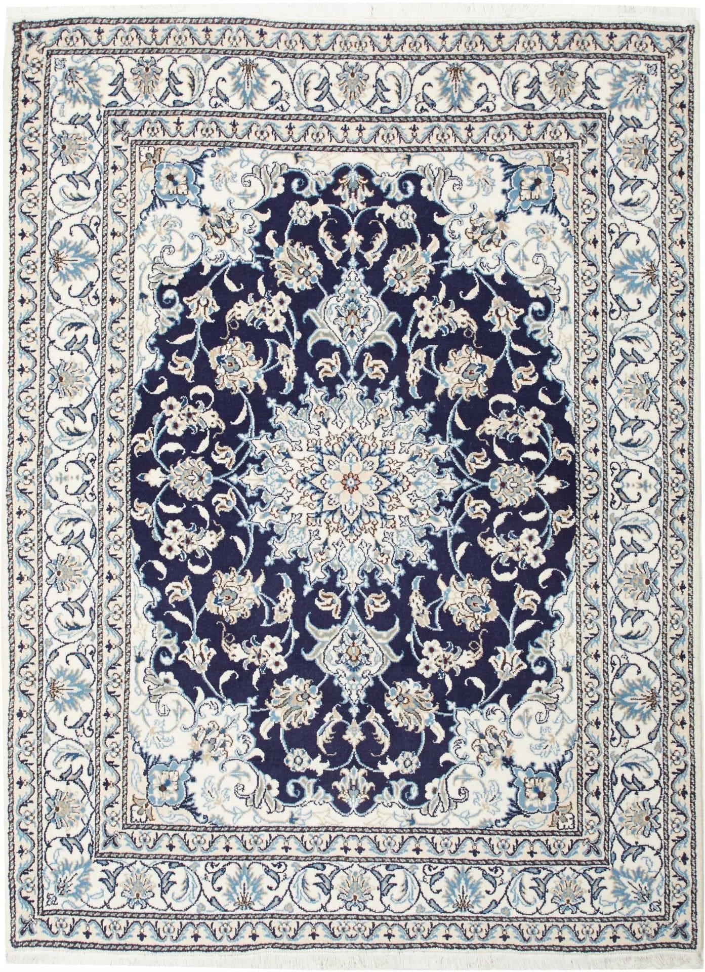 1121$Ursprünglicher Preis war: 1121$971$Aktueller Preis ist: 971$Nain Teppich | Knotendichte: ca. 200.000 Knoten/m² | Material: 100% Schurwolle (Flor), 100% Baumwolle (Kette) | Größe: 148 x 198 cm | Herkunft: Iran | Zustand: Handgeknüpft, exquisite Verarbeitung | Muster: Klassische florale Motive mit königsblauem Farbton