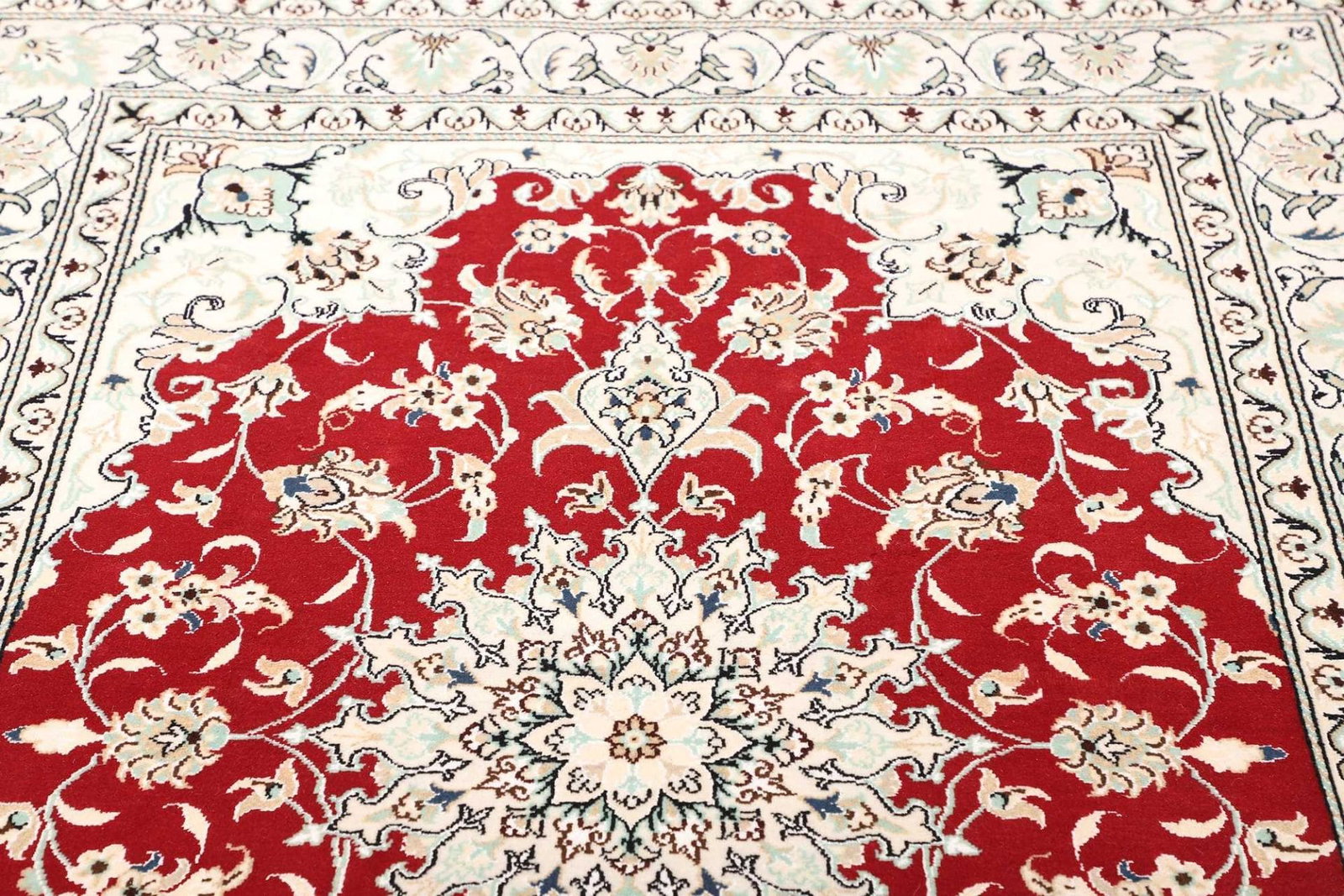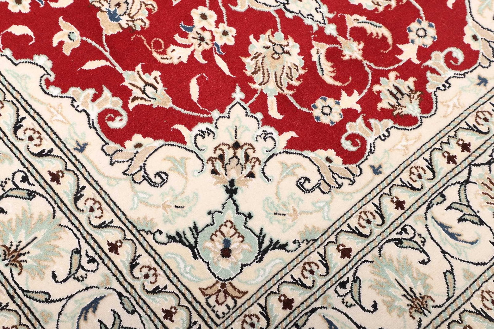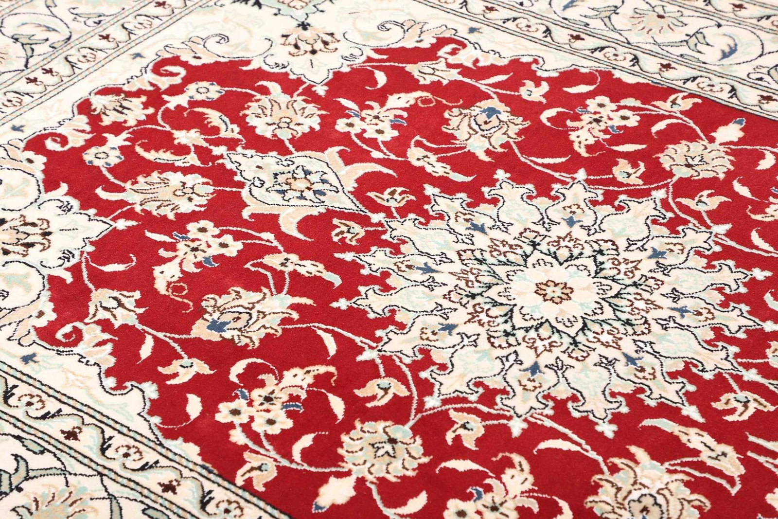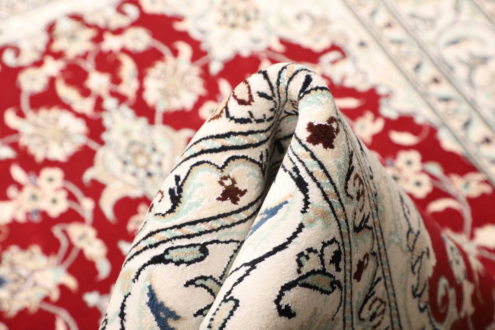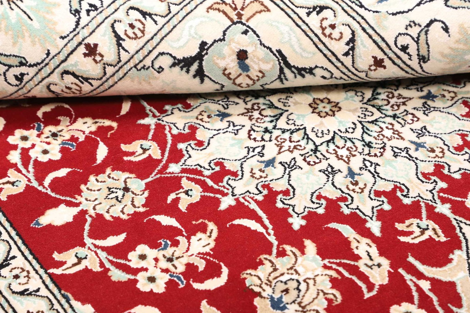 Der Nain Teppich wird aus 100 % Schurwolle gefertigt, die für ihre Weichheit und Langlebigkeit bekannt ist. Schurwolle ist ein natürliches Material, das sich besonders gut für Teppiche eignet, da es atmungsaktiv ist und Wärme speichert. Die handgeknüpfte Technik, die bei der Herstellung verwendet wird, ermöglicht es, komplexe und feine Muster zu kreieren, die sich durch eine hohe Detailgenauigkeit auszeichnen. Die Knotendichte ist ein wichtiger Faktor für die Qualität eines Teppichs: Je höher die Knotendichte, desto feiner und detailreicher sind die Muster, was bei diesem Nain Teppich in vollem Maße zutrifft.