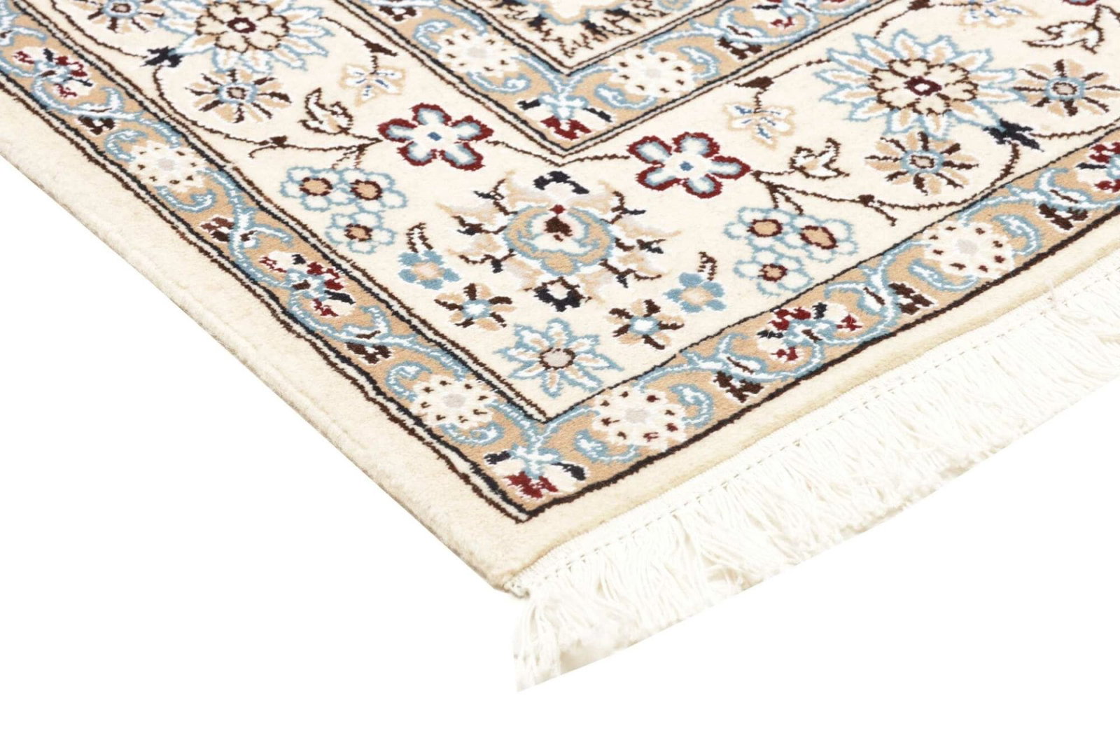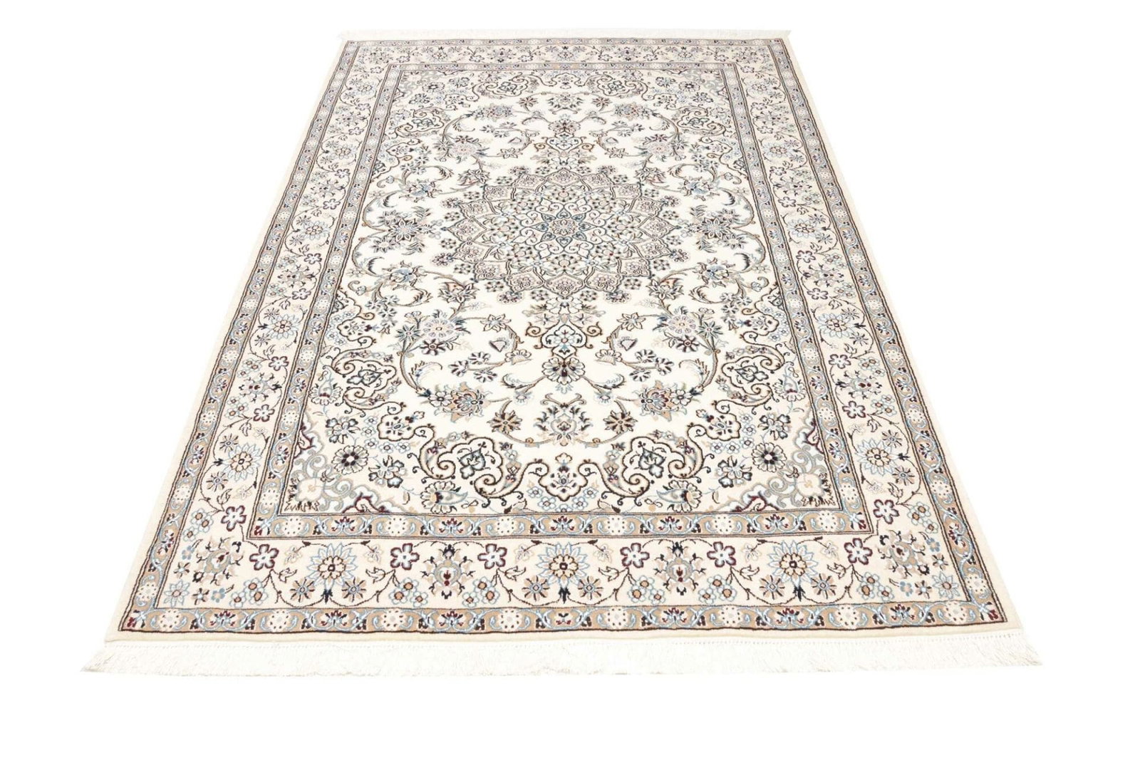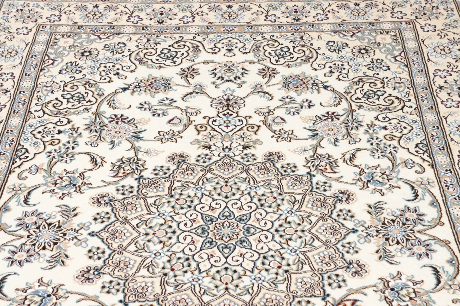 Nain ist eine kleine Stadt im Iran, die seit Jahrhunderten für die Herstellung von hochwertigen Perserteppichen bekannt ist. Die Teppichtradition in dieser Region geht auf das 19. Jahrhundert zurück, als die Stadt als Zentrum für feine Teppiche entstand. Nain Teppiche sind bekannt für ihre zarte Farbpalette, die häufig von sanften Cremetönen über sanfte Blau- und Rosatöne reicht, und ihre ausgeklügelten floralen und geometrischen Muster. Diese Designs sind oft inspiriert von der natürlichen Schönheit der umgebenden Landschaft und spiegeln die künstlerische Sensibilität der Region wider.