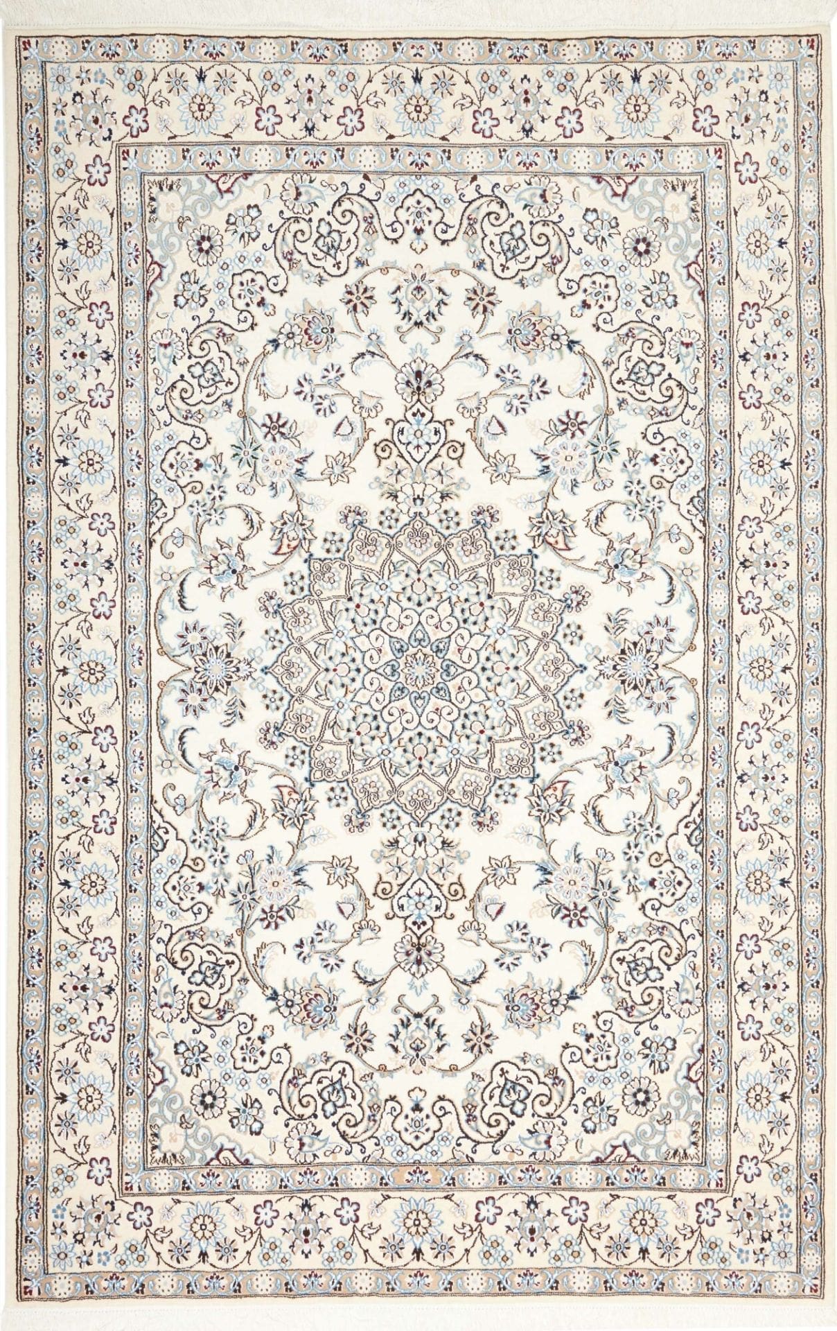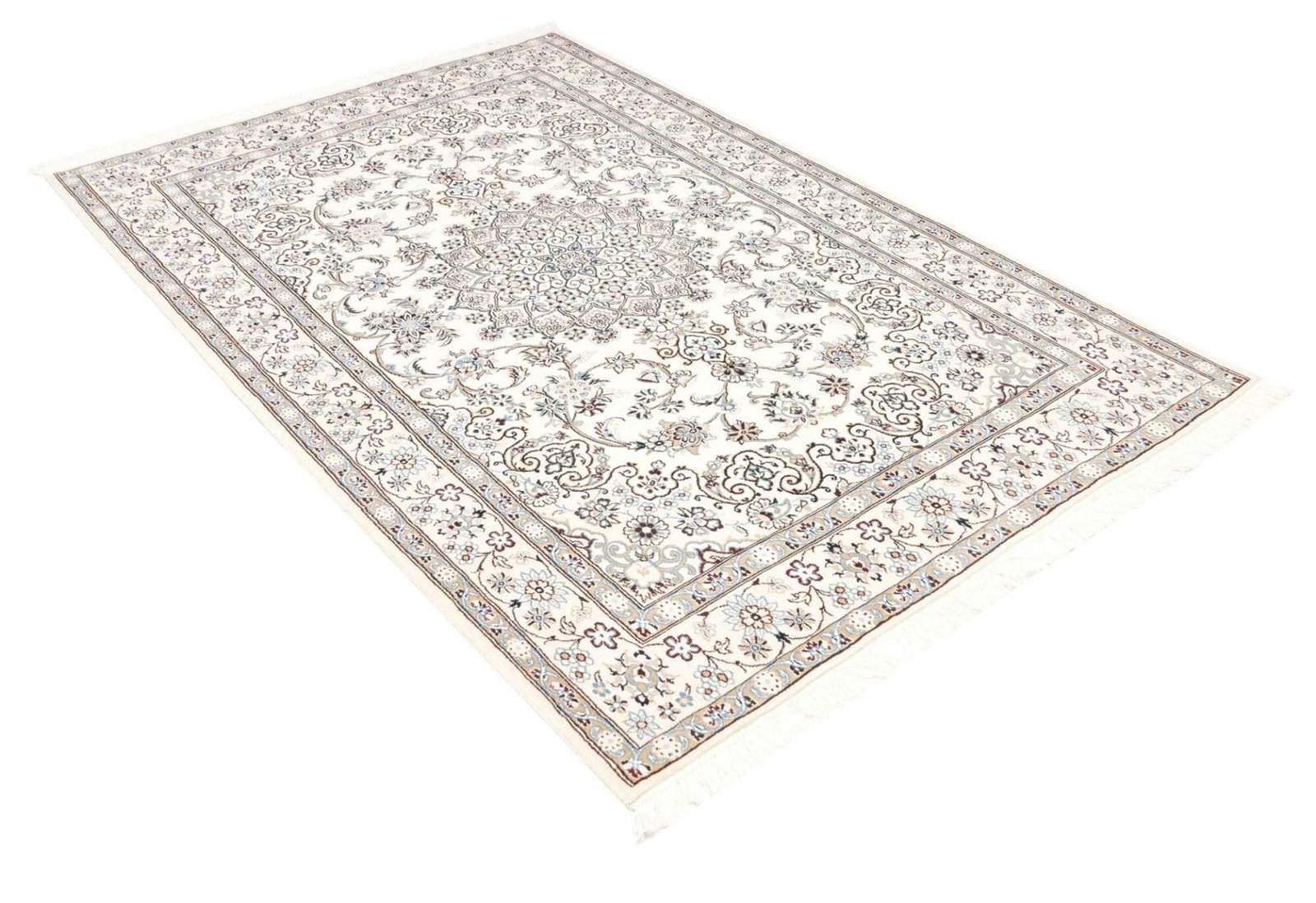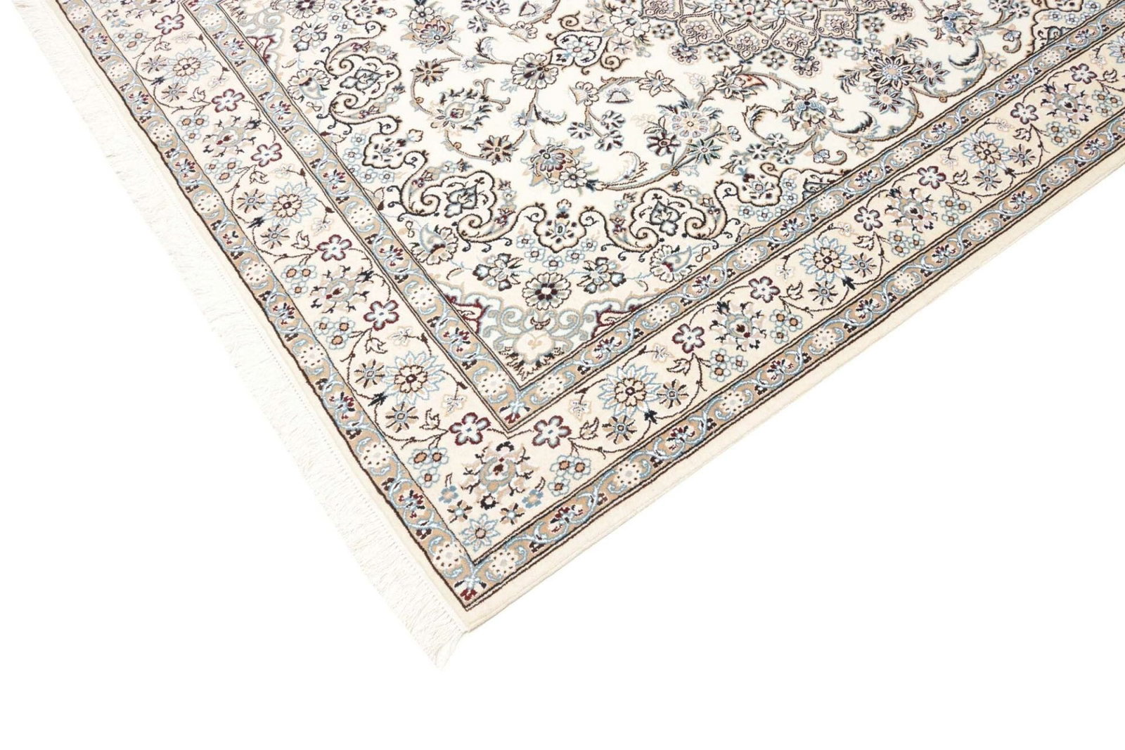 Nain ist eine kleine Stadt im Iran, die seit Jahrhunderten für die Herstellung von hochwertigen Perserteppichen bekannt ist. Die Teppichtradition in dieser Region geht auf das 19. Jahrhundert zurück, als die Stadt als Zentrum für feine Teppiche entstand. Nain Teppiche sind bekannt für ihre zarte Farbpalette, die häufig von sanften Cremetönen über sanfte Blau- und Rosatöne reicht, und ihre ausgeklügelten floralen und geometrischen Muster. Diese Designs sind oft inspiriert von der natürlichen Schönheit der umgebenden Landschaft und spiegeln die künstlerische Sensibilität der Region wider.