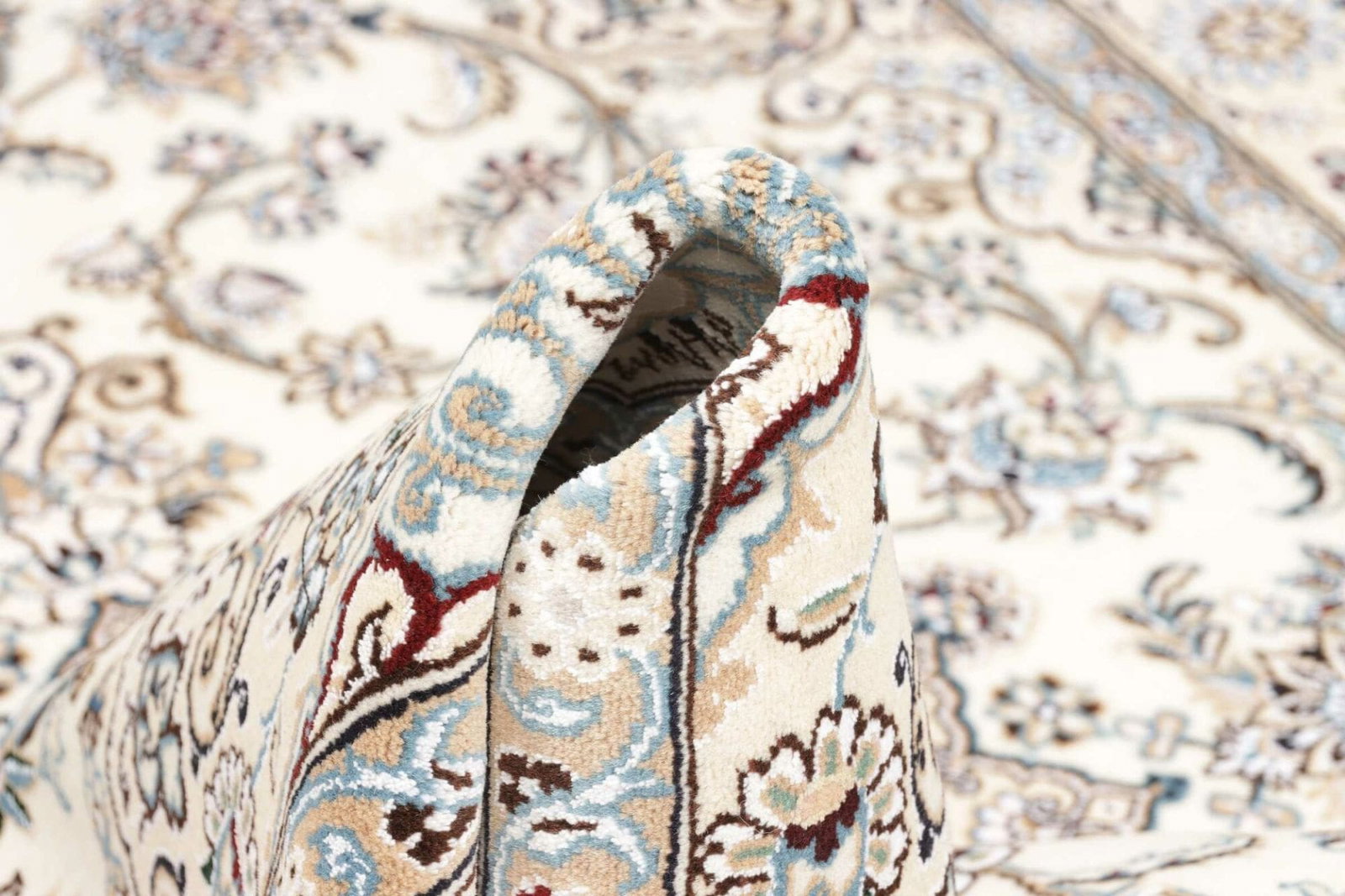 Das florale Design des Nain Teppichs ist ein kleines Meisterwerk. Er zeigt eine abwechslungsreiche Komposition von Blüten, Ranken und geschwungenen Formen, die den gesamten Teppich durchzieht. Diese floralen Motive sind nicht nur dekorativ, sondern haben auch eine tiefere symbolische Bedeutung: Blumen stehen oft für Leben, Wachstum und Schönheit in der persischen Kultur. Die zarte Farbharmonie und das filigrane Muster ergeben eine harmonische Atmosphäre, die sowohl klassisch als auch modern wirkt.