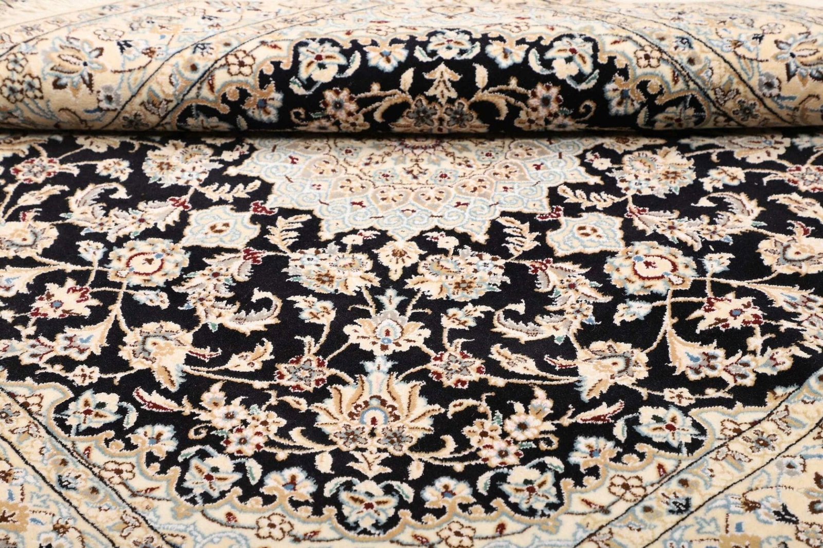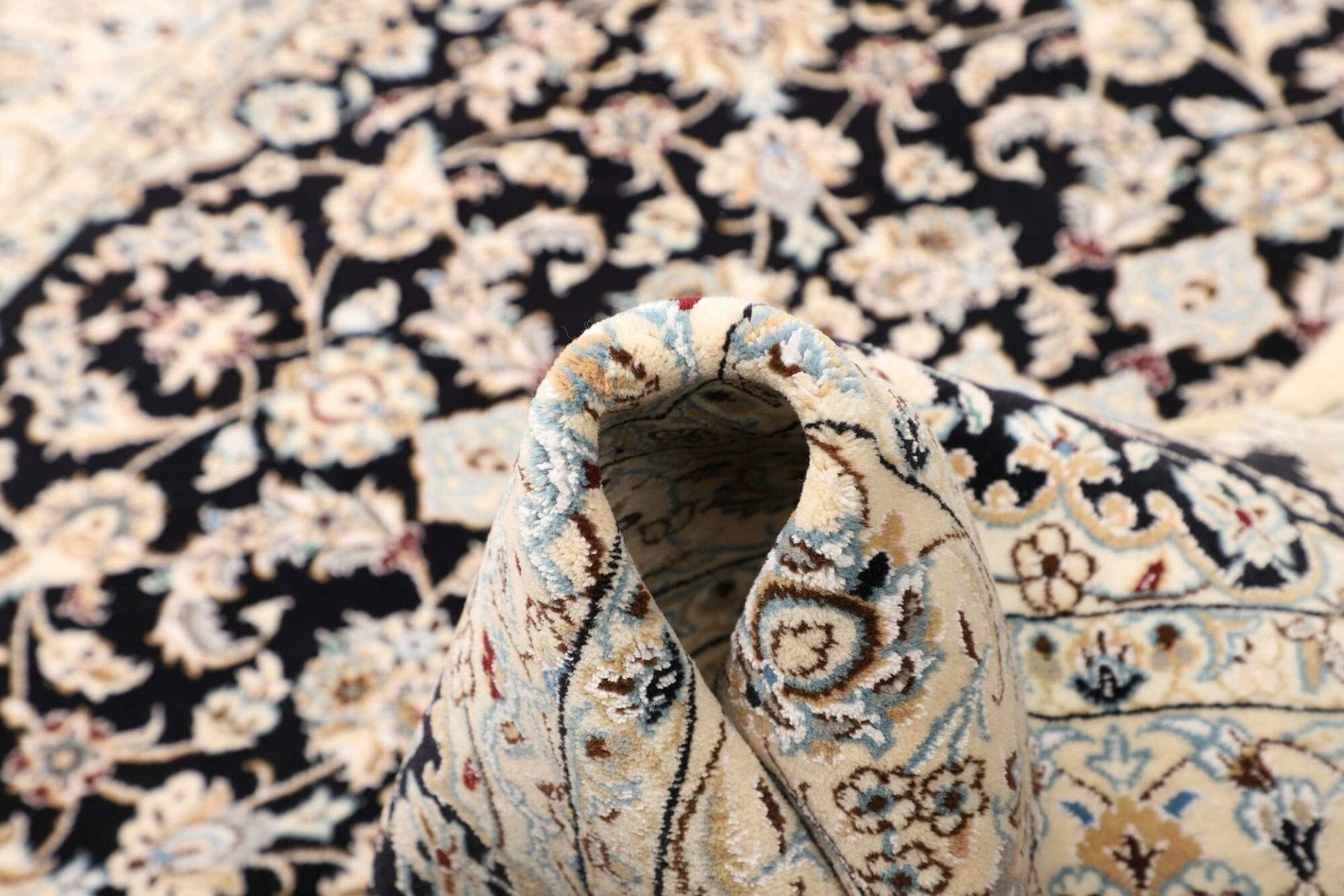 Dieser Nain Teppich wird aus hochwertigen Materialien hergestellt, was ihn besonders robust und gleichzeitig anschmiegsam macht. Traditionell werden für die Herstellung von persischen Teppichen Schurwolle und Seide verwendet, was diesem Teppich außergewöhnliche Weichheit und Glanz verleiht. Die Verwendung von hochwertigen Rohstoffen ist ein entscheidender Faktor für die Langlebigkeit und den eleganten Look des Teppichs. Handgeknüpfte Teppiche zeichnen sich durch ihre Präzision aus: Jeder Knoten wird mit Sorgfalt gesetzt, was zu einer dichten und stabilen Struktur führt. Diese Handarbeit kann mehrere Monate in Anspruch nehmen und unterstreicht den Wert und die Einzigartigkeit jedes einzelnen Stücks.