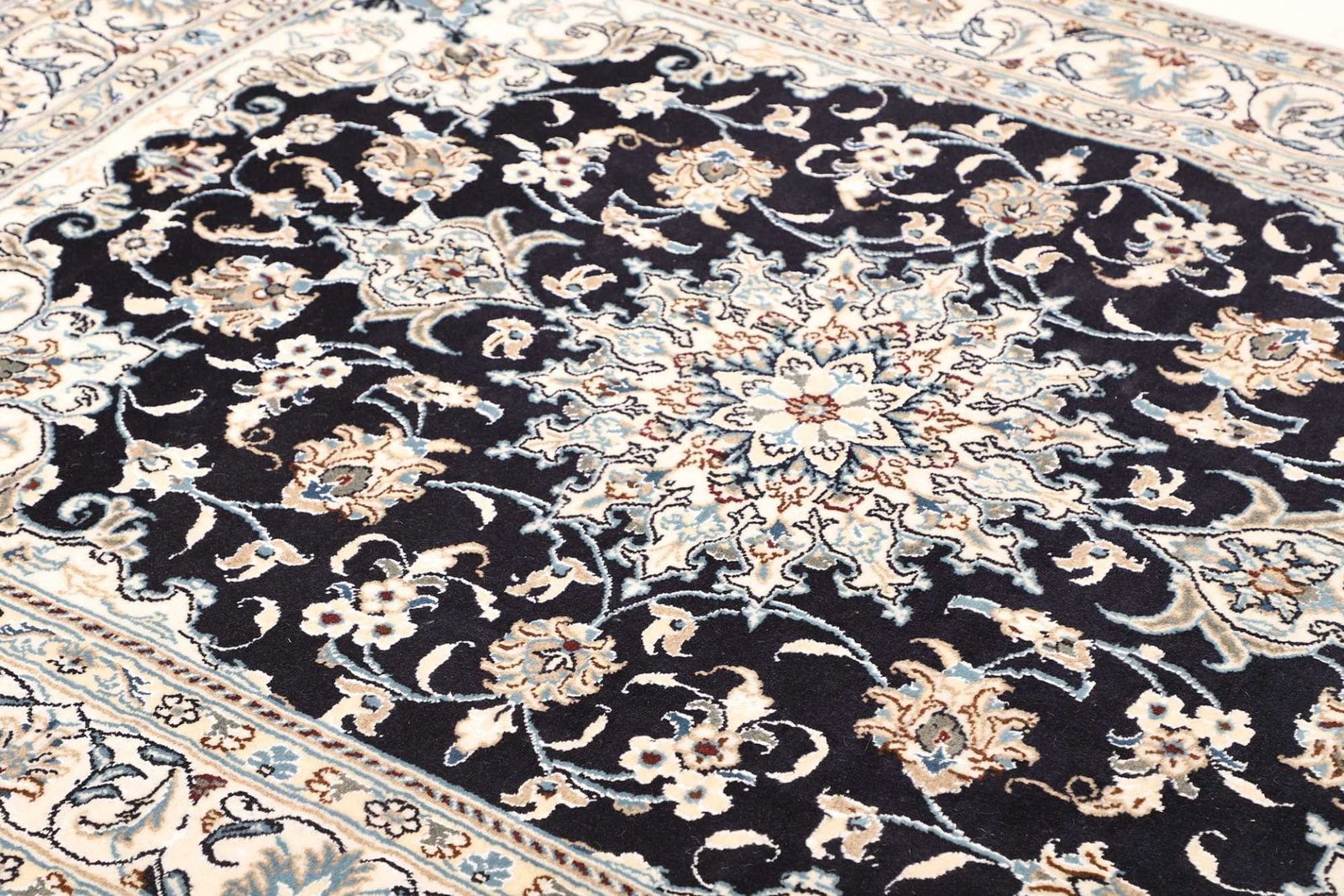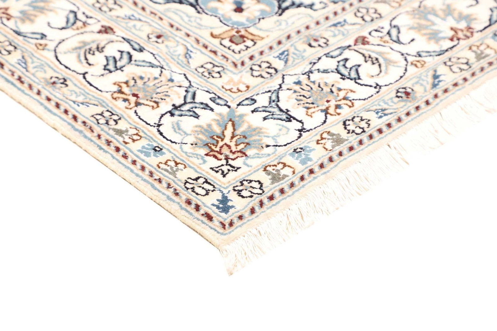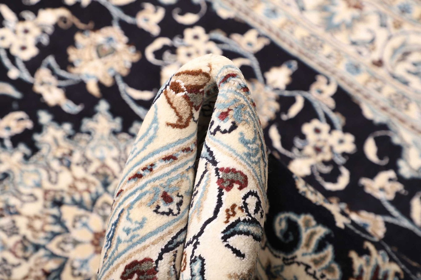 Ein Nain Teppich wird typischerweise aus feiner Wolle und Seide hergestellt. Diese Kombination sorgt nicht nur für eine angenehme Haptik, sondern verleiht dem Teppich auch eine außergewöhnliche Langlebigkeit und Widerstandsfähigkeit. Die handgeknüpfte Technik garantiert, dass jedes Stück ein Unikat ist, in dem man die Hingabe und das Können der Teppichknüpfer erkennen kann. Die Knotendichte ist besonders hoch, was sich in der Detailgenauigkeit des floralen Musters widerspiegelt und dem Teppich eine dichte, samtige Struktur verleiht.