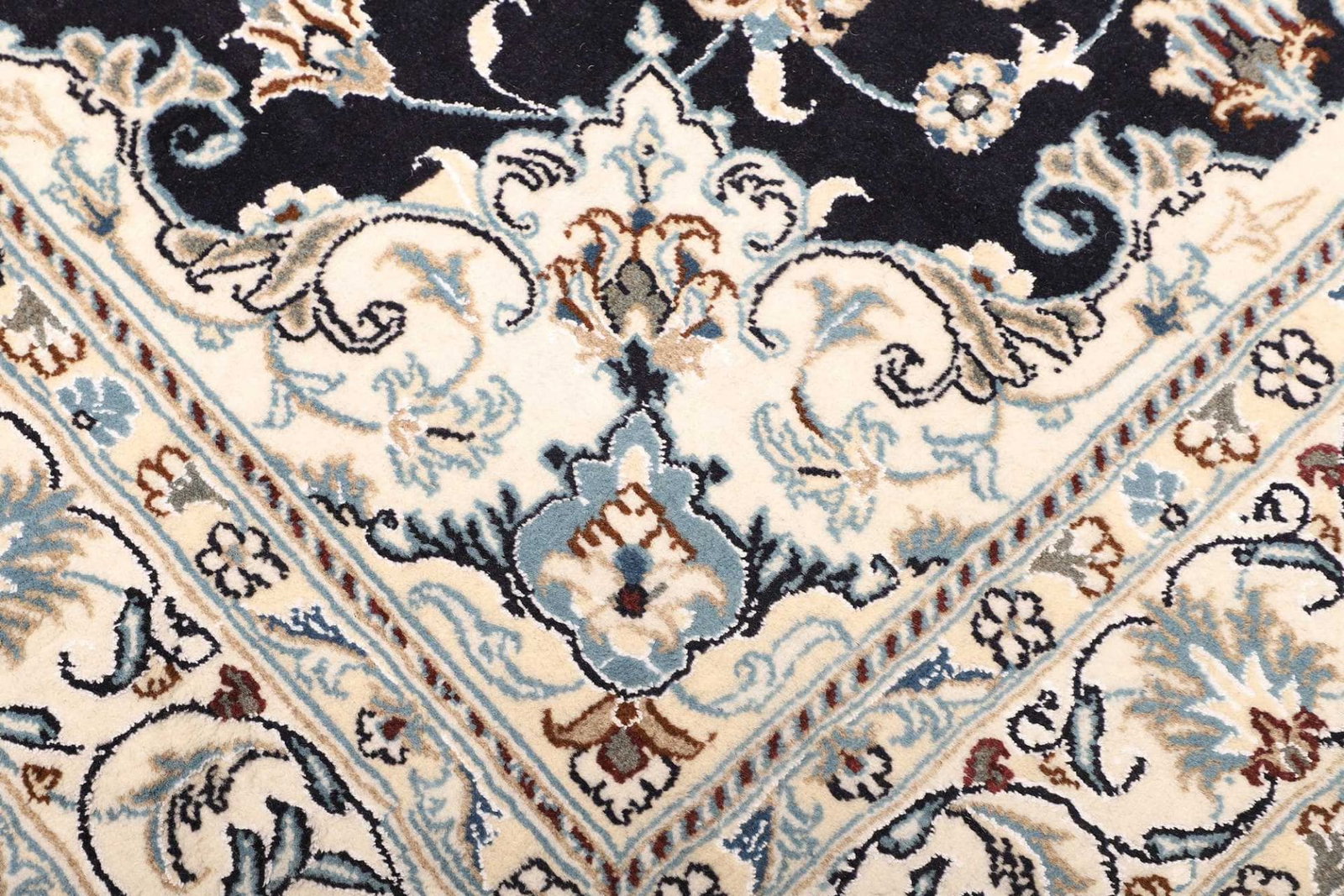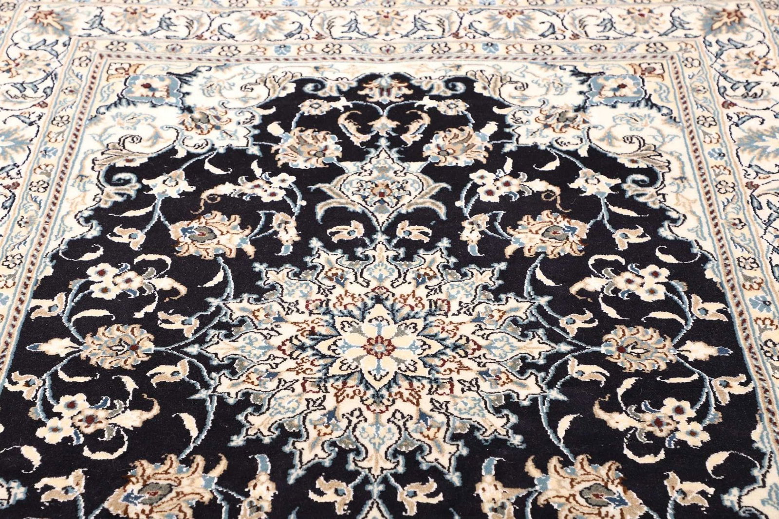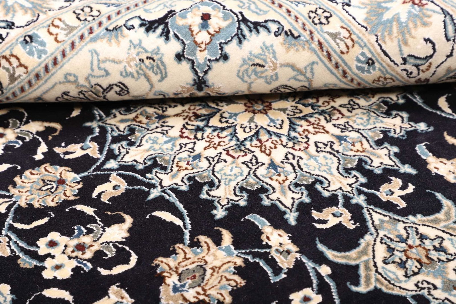 Ein Nain Teppich wird typischerweise aus feiner Wolle und Seide hergestellt. Diese Kombination sorgt nicht nur für eine angenehme Haptik, sondern verleiht dem Teppich auch eine außergewöhnliche Langlebigkeit und Widerstandsfähigkeit. Die handgeknüpfte Technik garantiert, dass jedes Stück ein Unikat ist, in dem man die Hingabe und das Können der Teppichknüpfer erkennen kann. Die Knotendichte ist besonders hoch, was sich in der Detailgenauigkeit des floralen Musters widerspiegelt und dem Teppich eine dichte, samtige Struktur verleiht.
