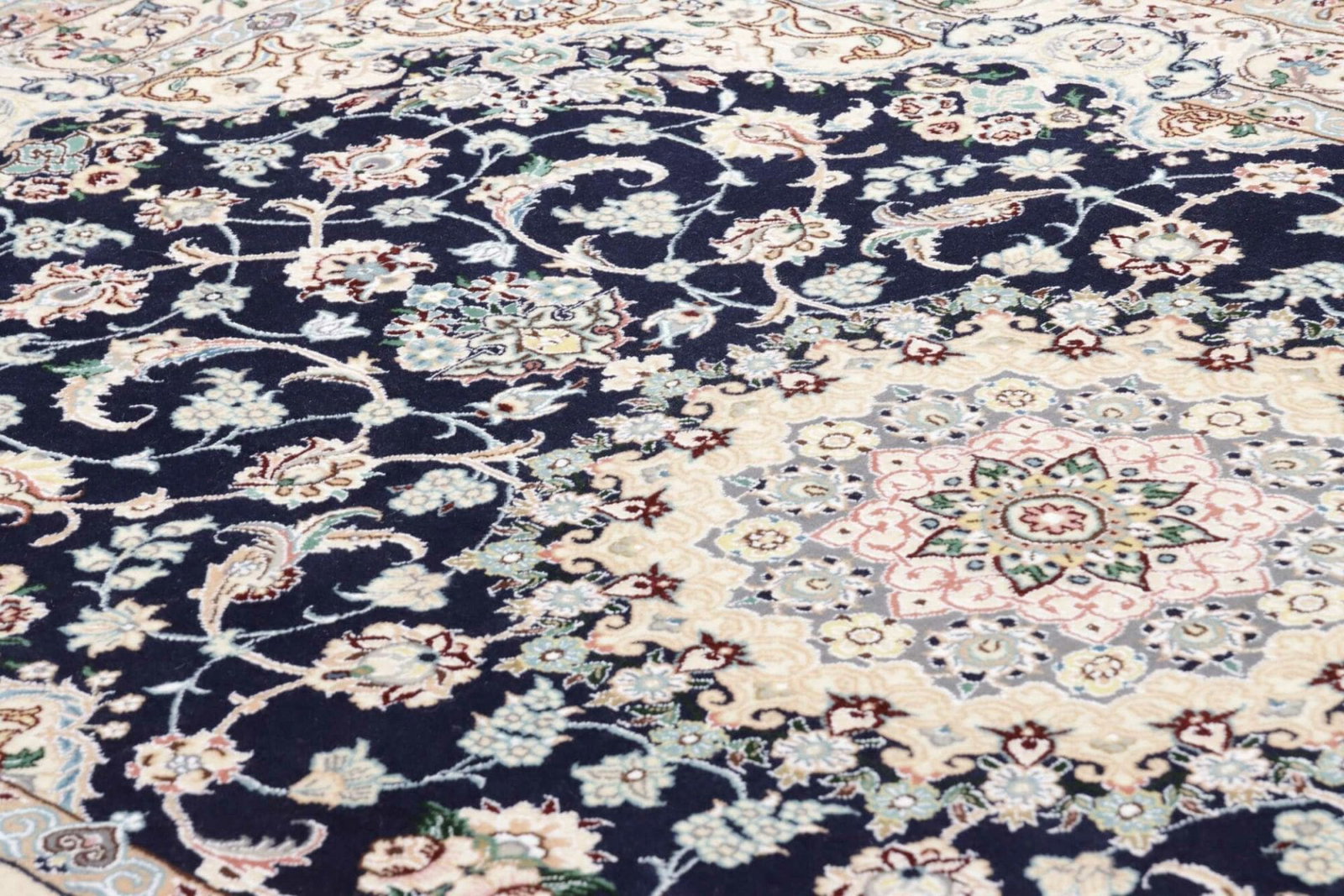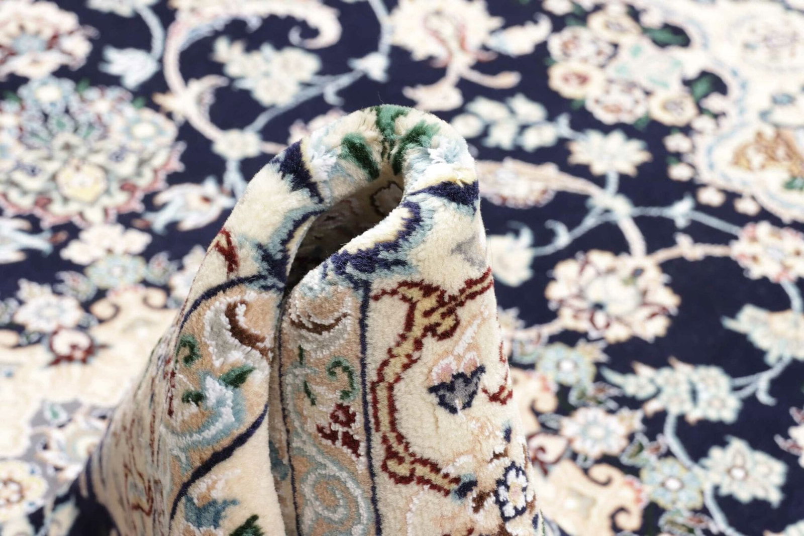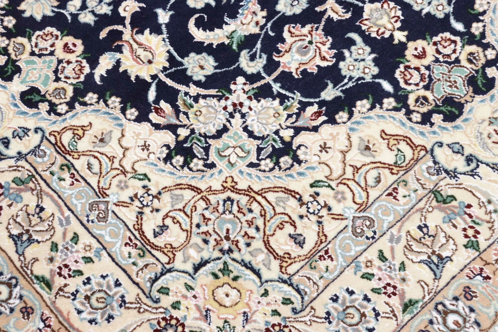 Der Nain Teppich zeichnet sich durch seine hochwertige Verarbeitung aus. Er wurde aus feinstem Wolle und Baumwolle hergestellt, was nicht nur für einen hohen Komfort sorgt, sondern auch die Langlebigkeit des Teppichs gewährleistet. Die Knotendichte ist außergewöhnlich hoch, was bedeutet, dass jedes Detail des Designs klar und präzise zur Geltung kommt. Diese Detailtreue ist ein Zeichen für die Meisterschaft und Geduld, die in die Herstellung dieses Teppichs geflossen sind.