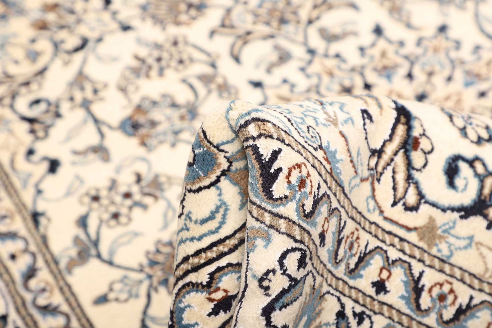 Die Knotendichte eines Nain Teppichs liegt typischerweise bei über 300.000 Knoten pro Quadratmeter, was bedeutet, dass die Teppiche nicht nur besonders fein gewebt, sondern auch äußerst langlebig sind. Diese Knotendichte ermöglicht es, auch die filigransten Details und Muster in die Teppiche einzubringen, was bei vielen anderen Teppichen nicht der Fall ist.
