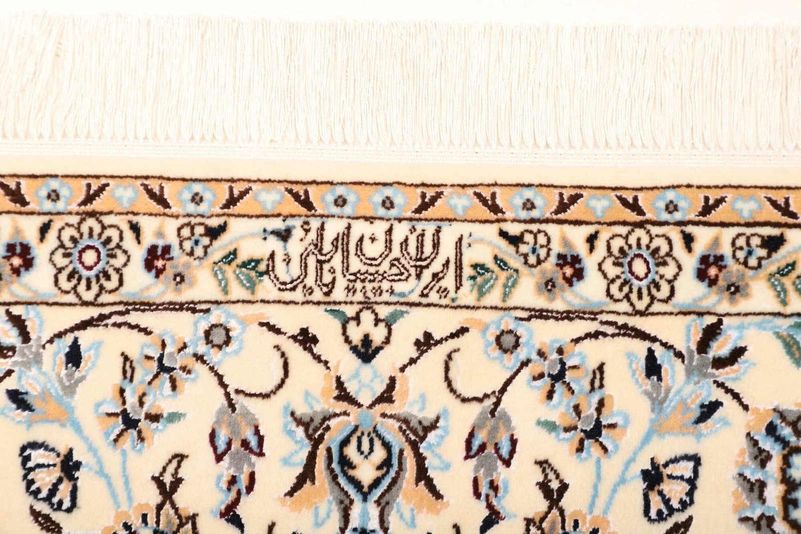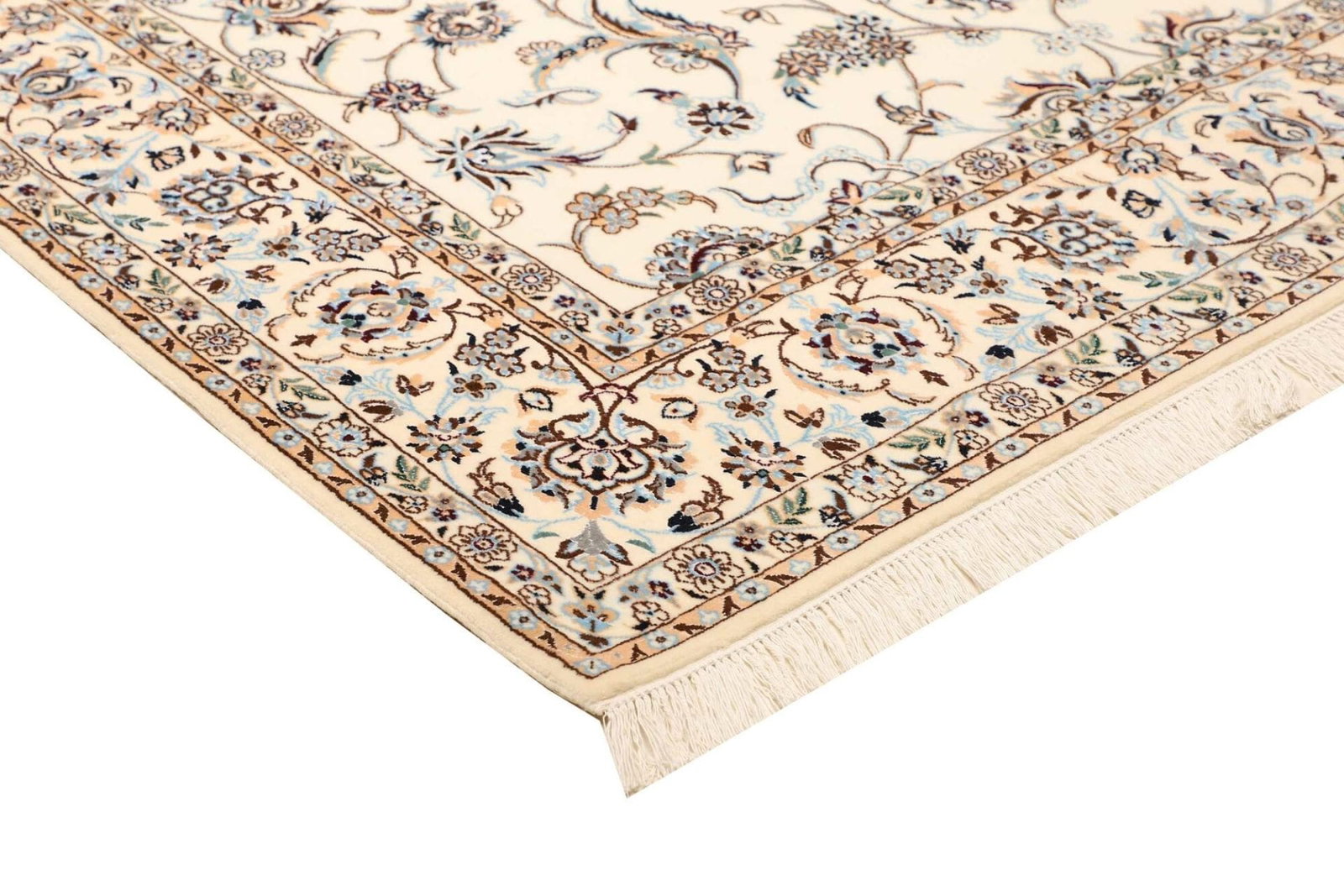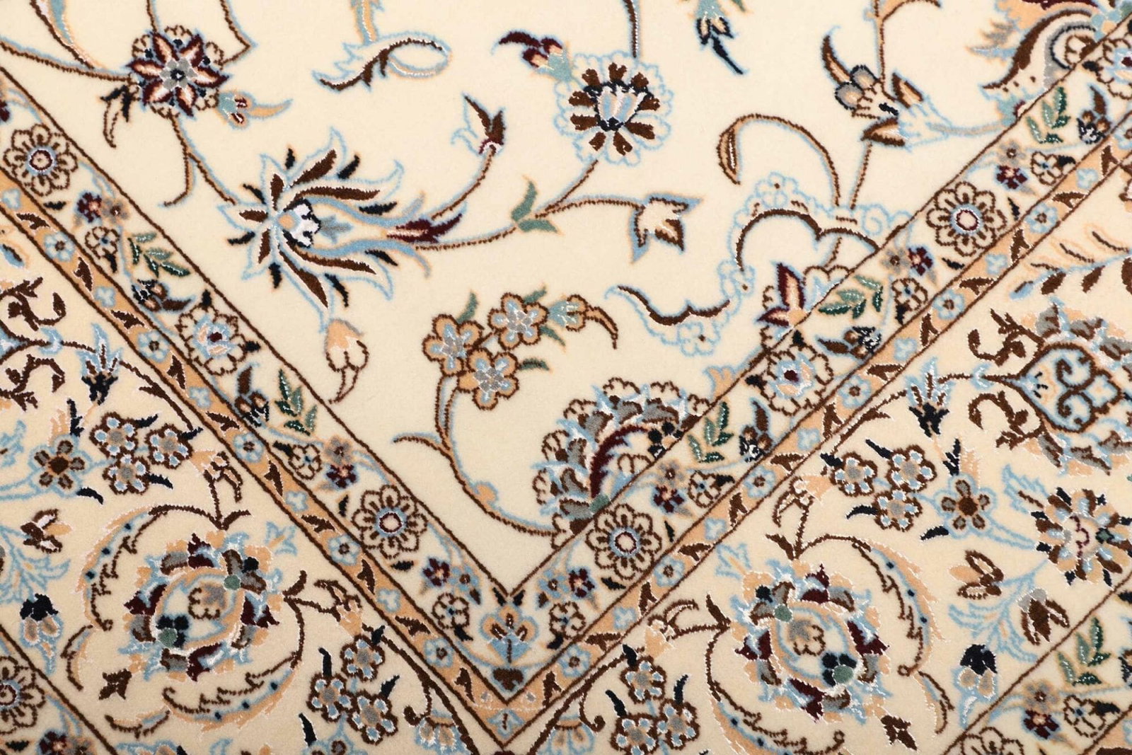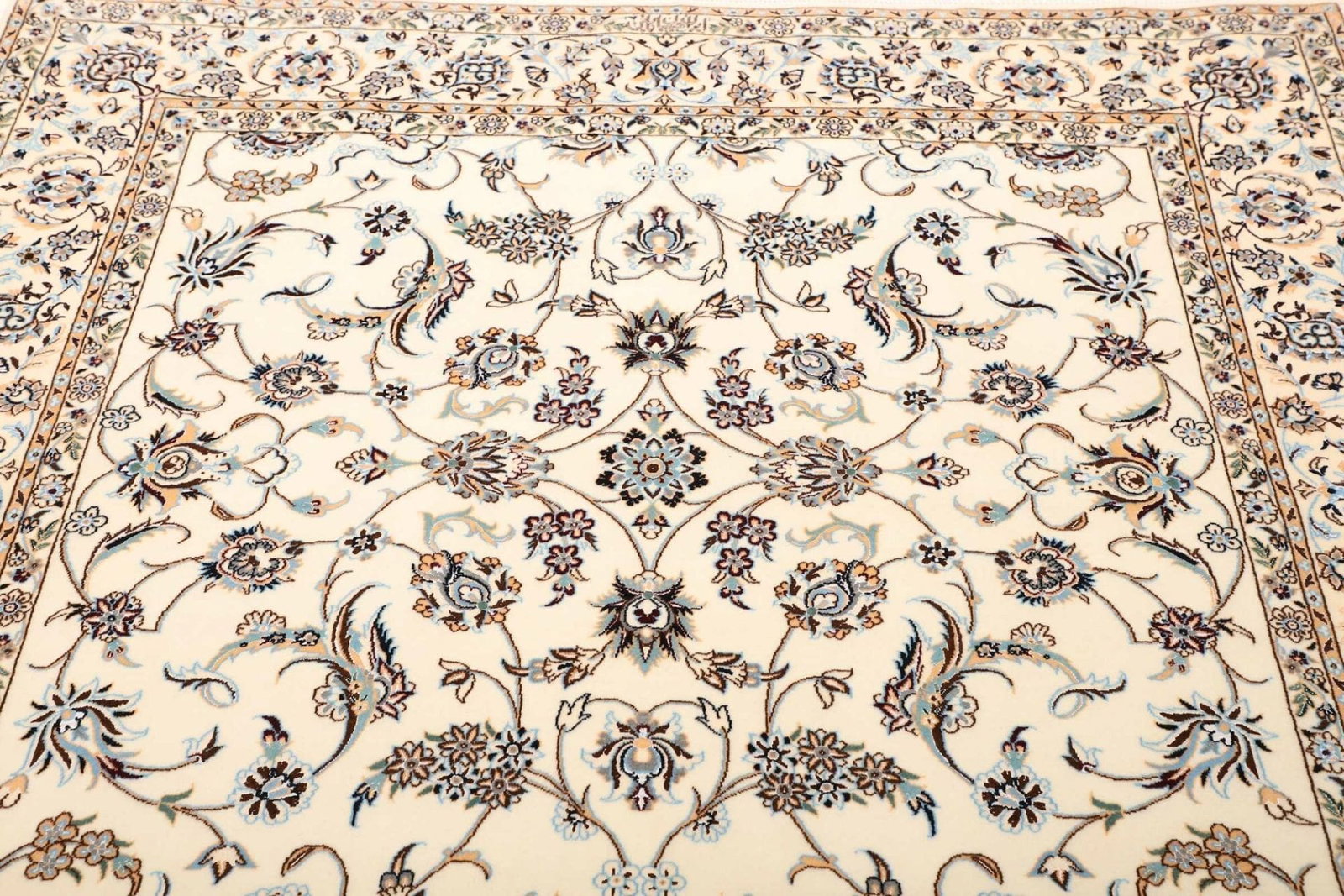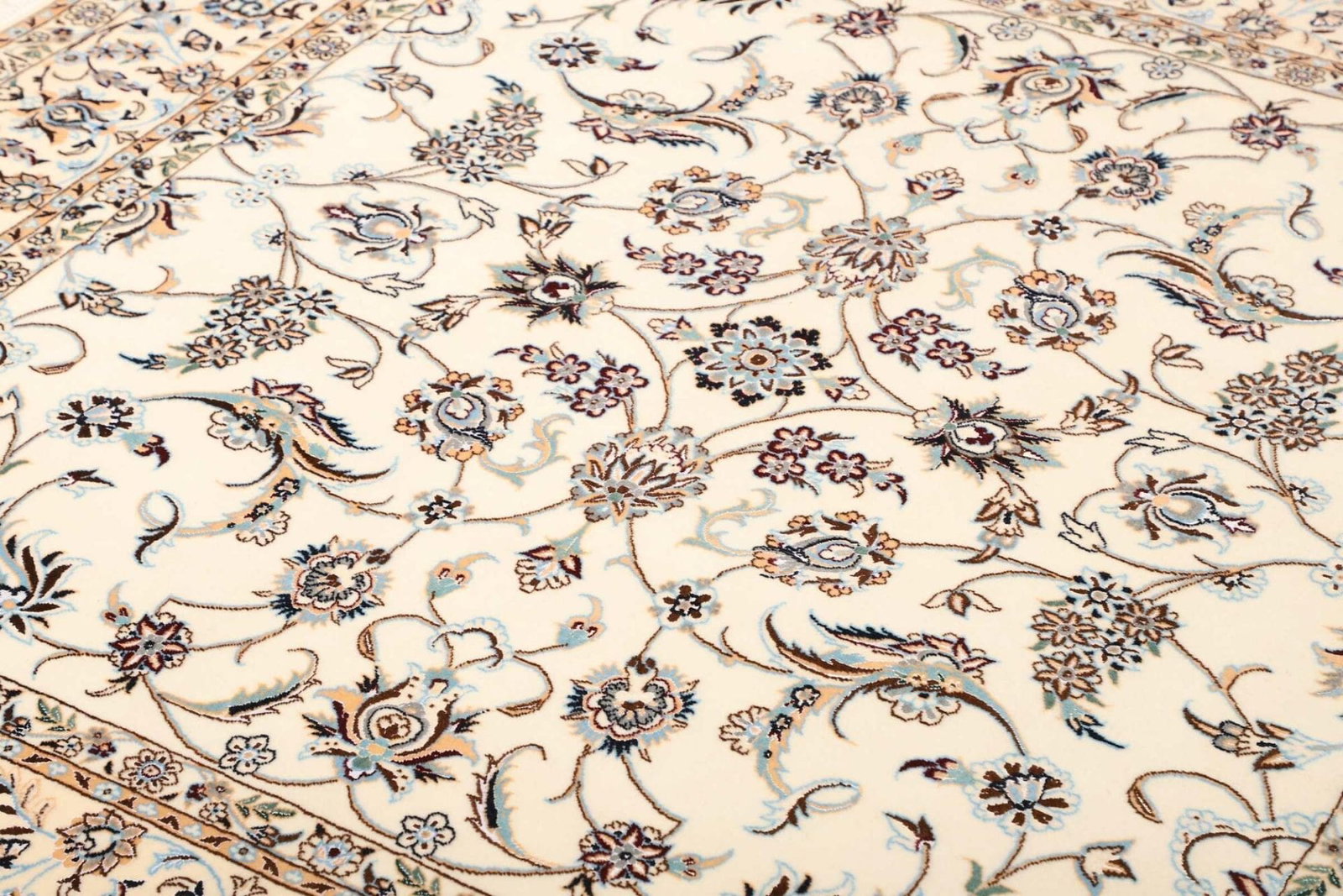 Nain Teppich | Knotendichte: ca. 900.000 Knoten/m² | Material: 100% Schurwolle (Flor), 100% Baumwolle (Kette) | Größe: 159 x 161 cm | Herkunft: Iran | Zustand: Handgeknüpft, in ausgezeichnetem Zustand | Muster: Klassische florale Motive mit königsblauem Akzent