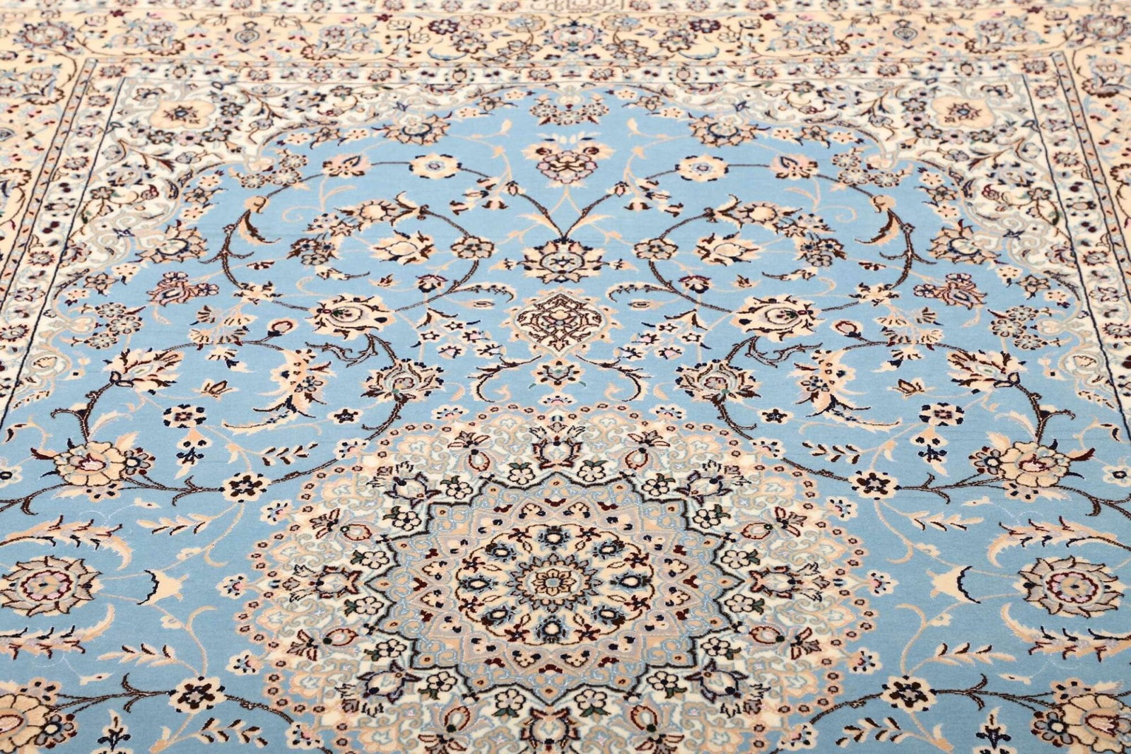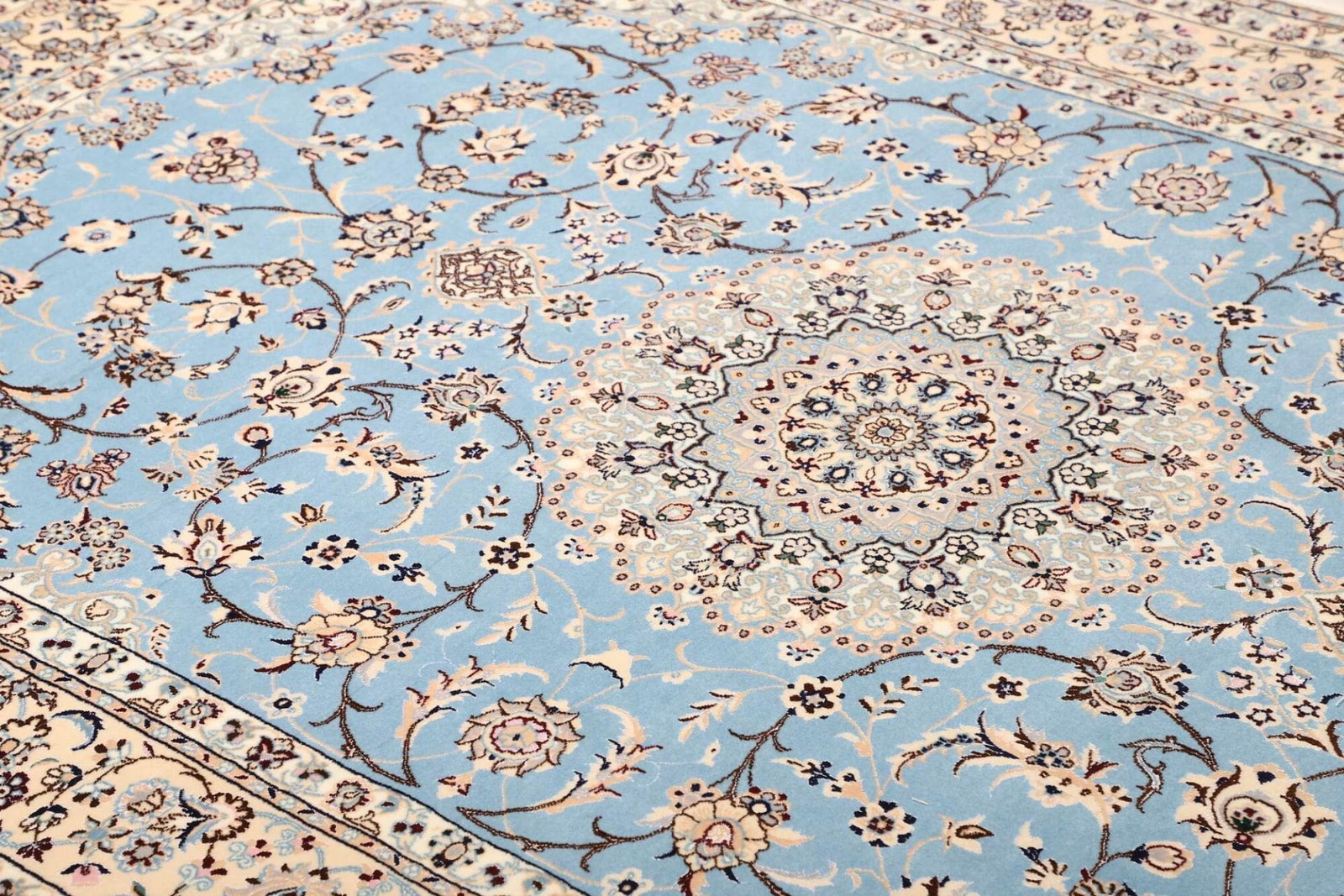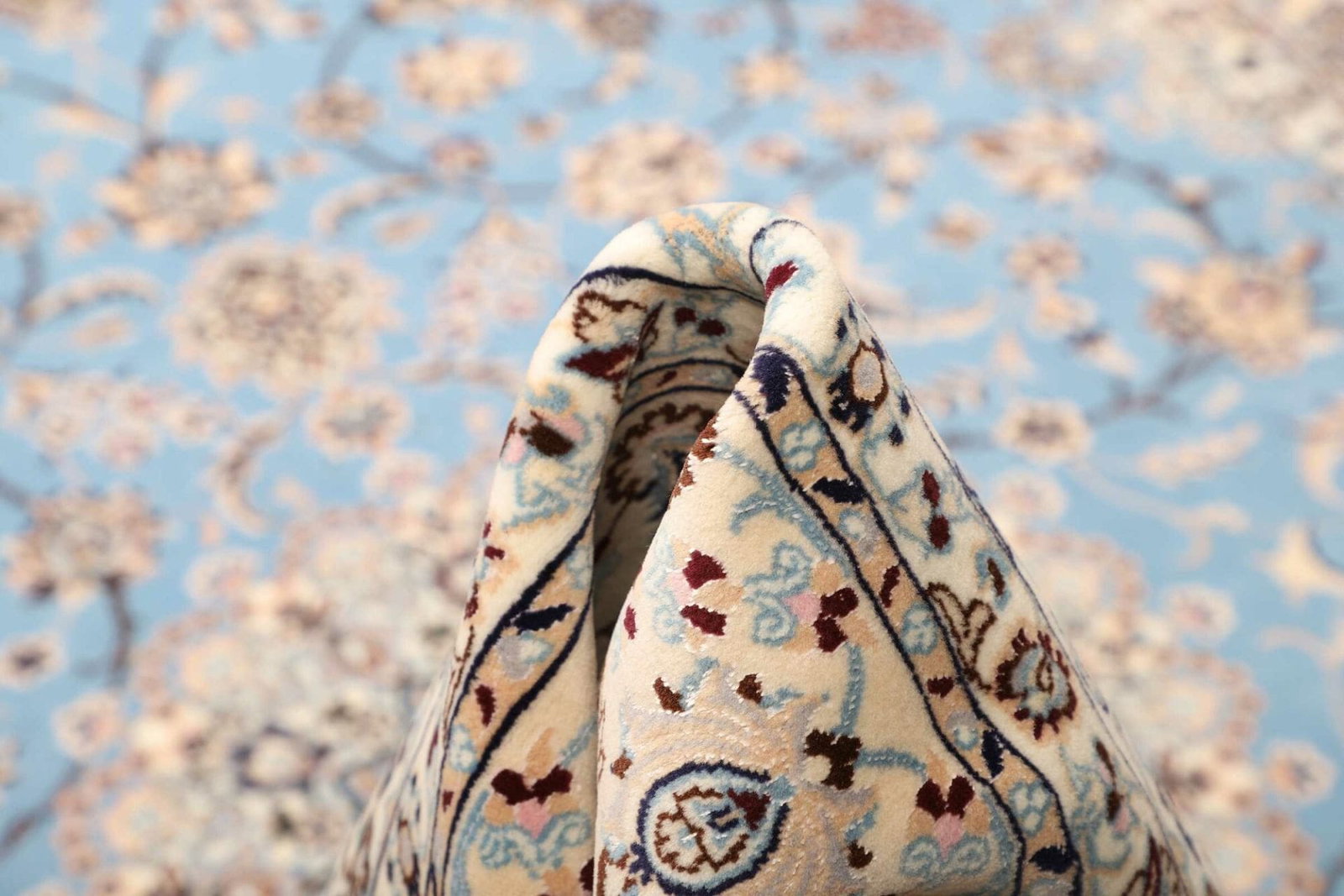 Der Nain Teppich stammt aus der gleichnamigen Stadt Nain im Iran, die für ihre lange Teppichknüpftradition bekannt ist. Nain ist im Perserteppichmarkt äußerst geschätzt, insbesondere aufgrund der Verwendung erstklassiger Materialien und der raffinierten Designs. Die Kunst des Teppichknüpfens in dieser Region geht auf mehrere Jahrhunderte zurück. Die Teppiche aus Nain sind oft mit komplexen geometrischen Mustern und floralen Elementen verziert, die die Schönheit der Natur widerspiegeln und die Liebe zur Kunst zeigen, die in jeder Faser des Teppichs spürbar ist.