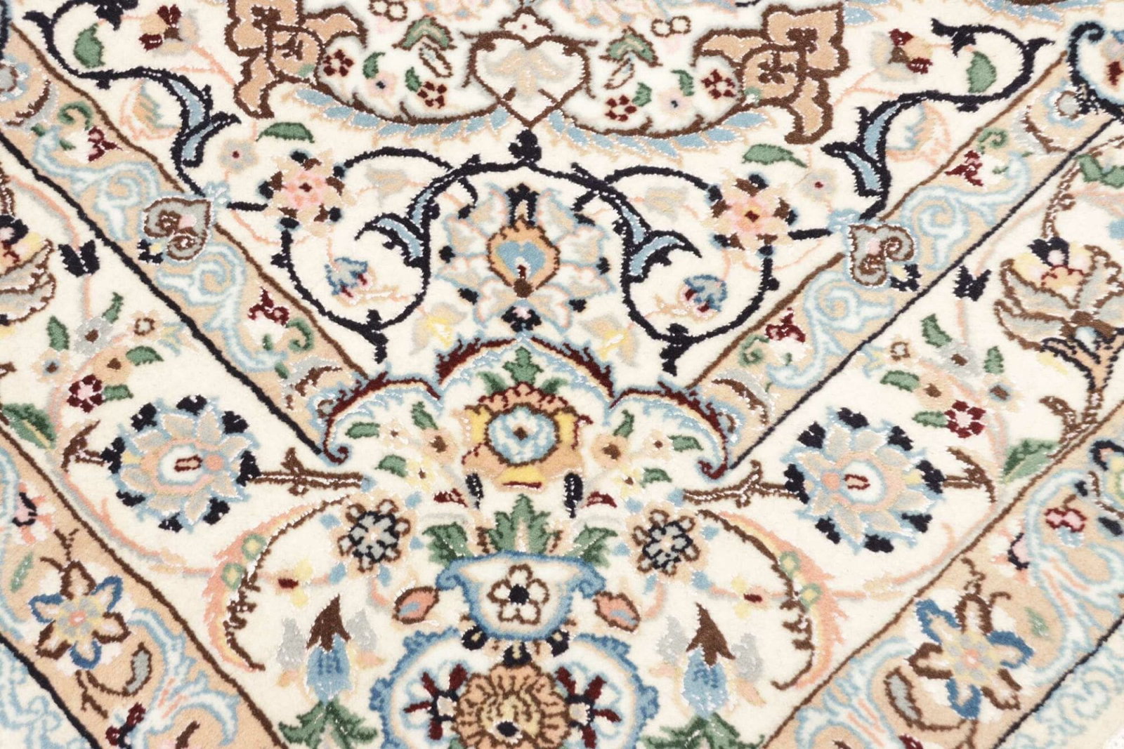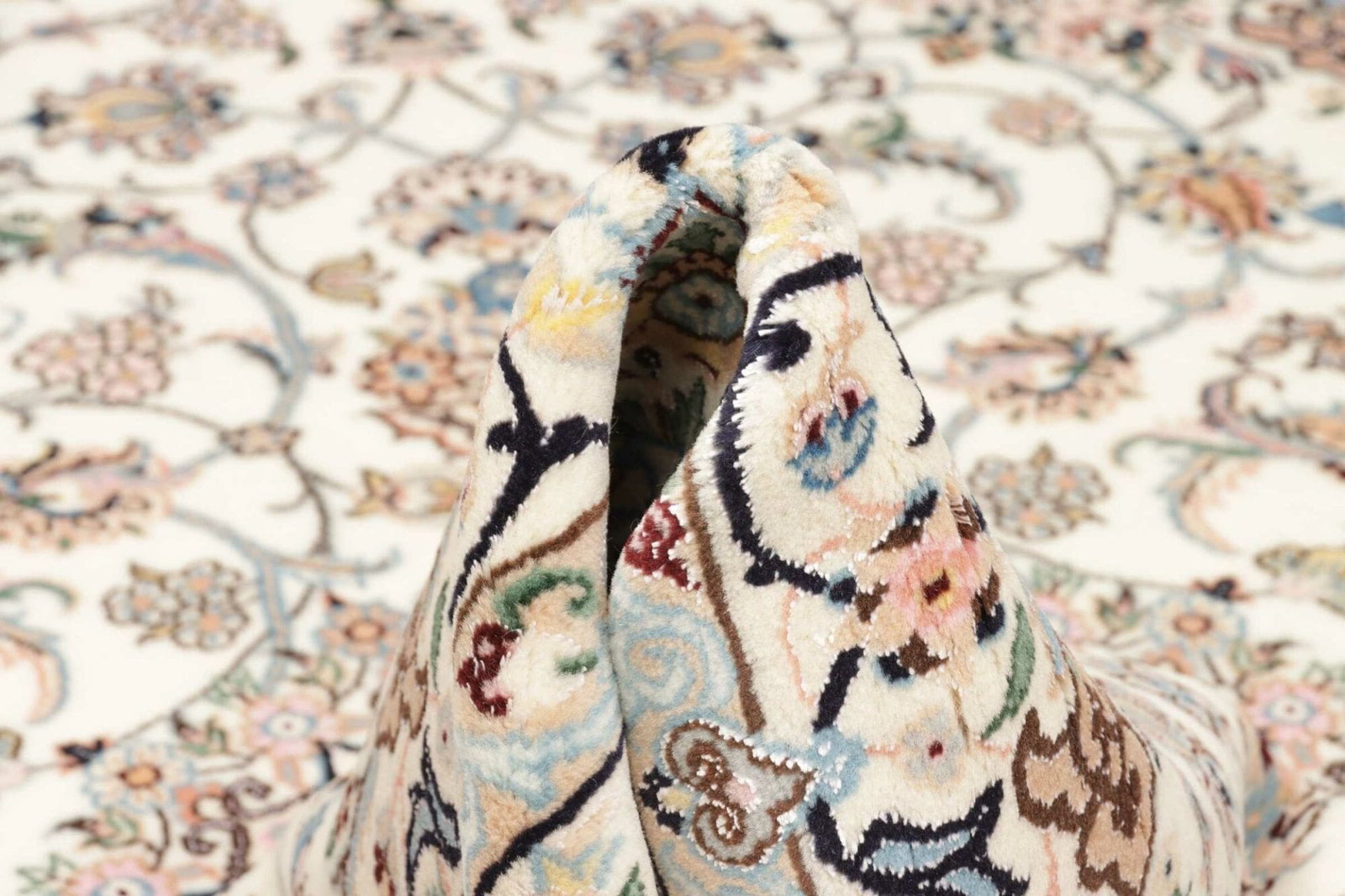 Das florale Muster des Nain Teppichs ist klassisch für die Region und zeigt die Handwerkskunst der Teppichknüpfer. Blütenranken, stilisierte Blumen und komplexe geometrische Formen nehmen in dem Design einen zentralen Platz ein. Diese Muster sind oft in sanften Farben wie Creme, Blau und Beige gehalten, die harmonisch miteinander kombiniert sind. Sie verleihen jedem Raum einen Hauch von Eleganz und zeitloser Schönheit. Durch die Verwendung von Naturfarben aus Pflanzen und mineralischen Pigmenten bleiben die Farben des Teppichs über Jahre hinweg erhalten.