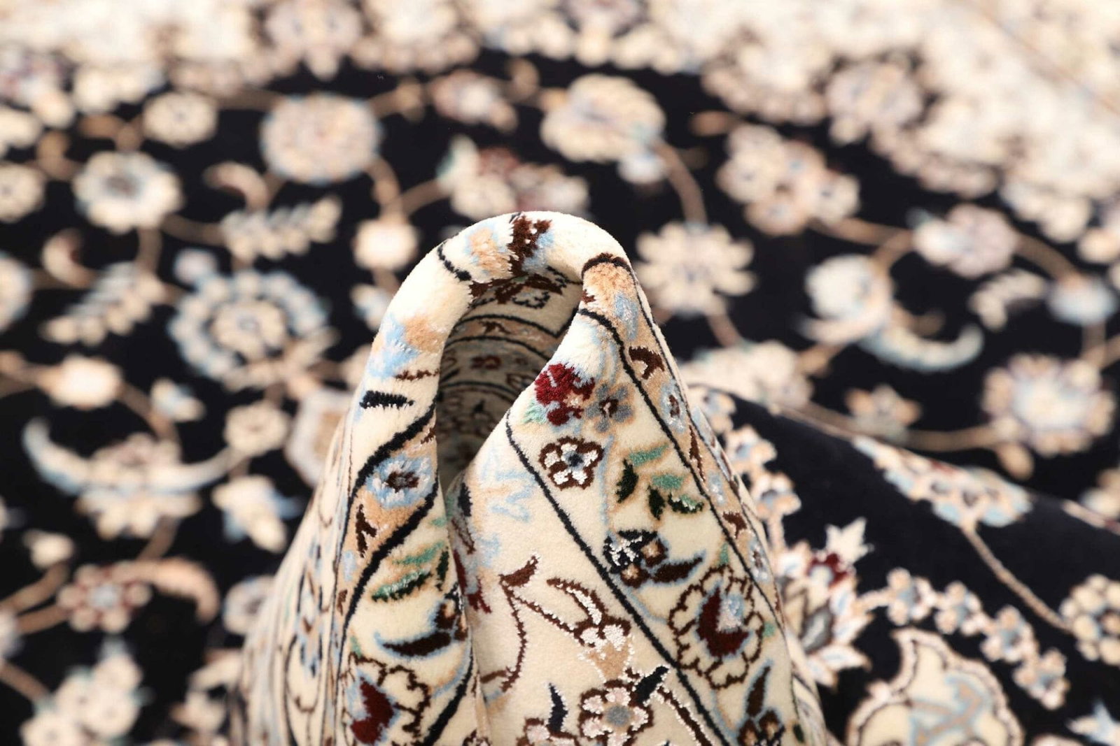 Das florale Muster des Nain Teppichs ist eines seiner auffälligsten Merkmale. Es kombiniert harmonisch verschiedene Farben und Formen, die an die üppige Natur erinnern. Solche Muster waren in der persischen Teppichkunst beliebt und symbolisieren oft das Streben nach Harmonie und Schönheit. Die detailreiche Ausarbeitung der Blumenmotive, kombiniert mit einer sanften Farbpalette, sorgt dafür, dass der Teppich zu vielfältigen Einrichtungskonzepten passt, von klassisch bis modern.