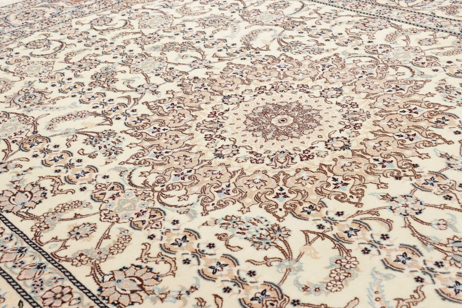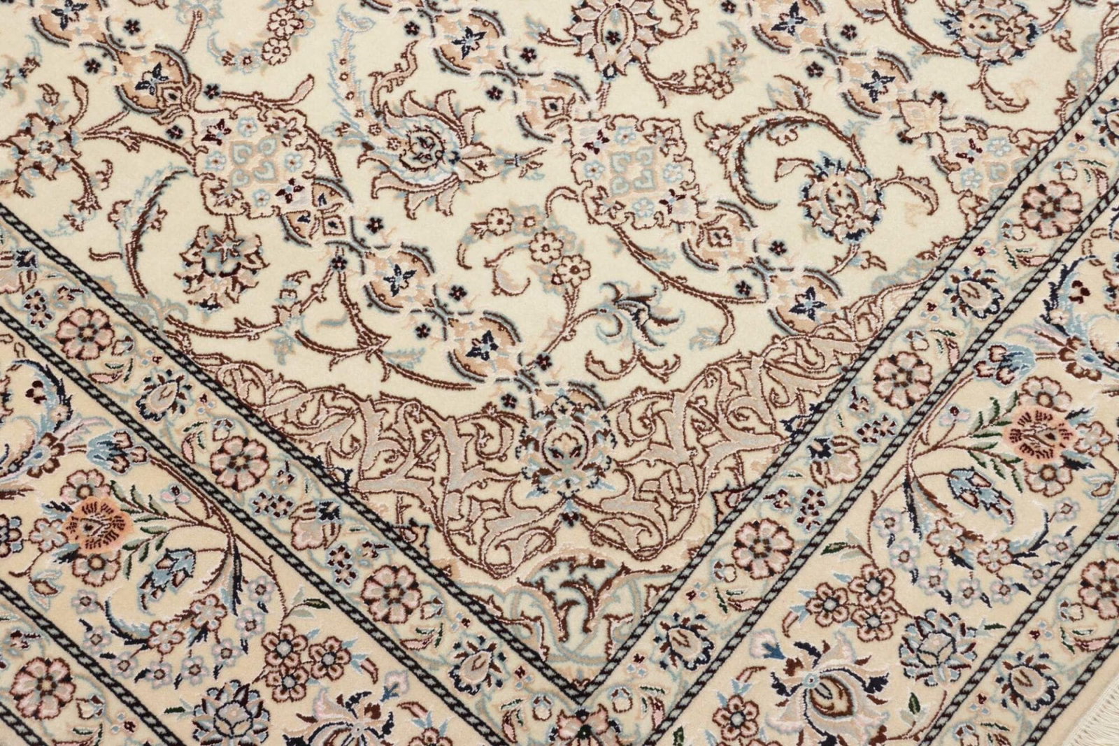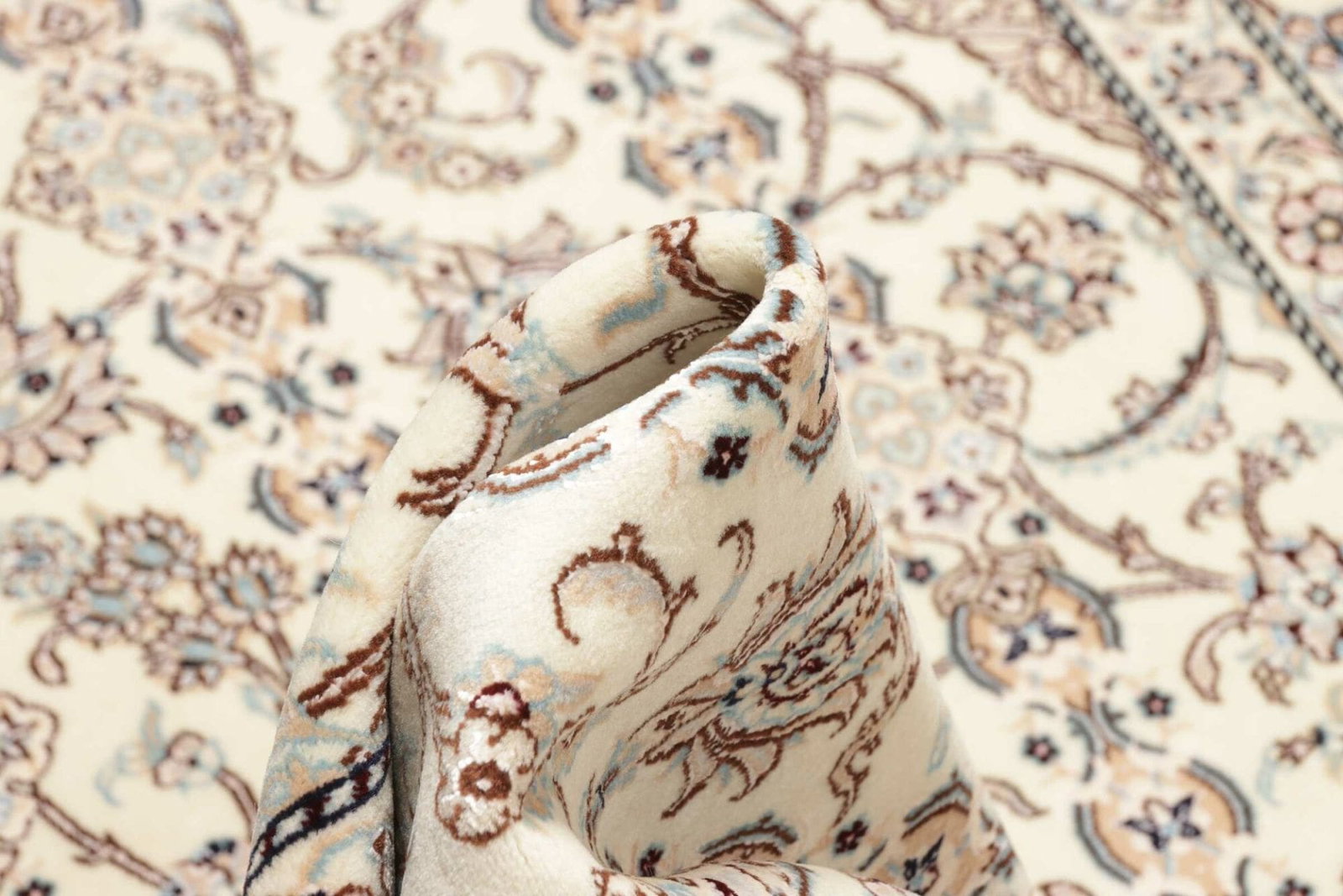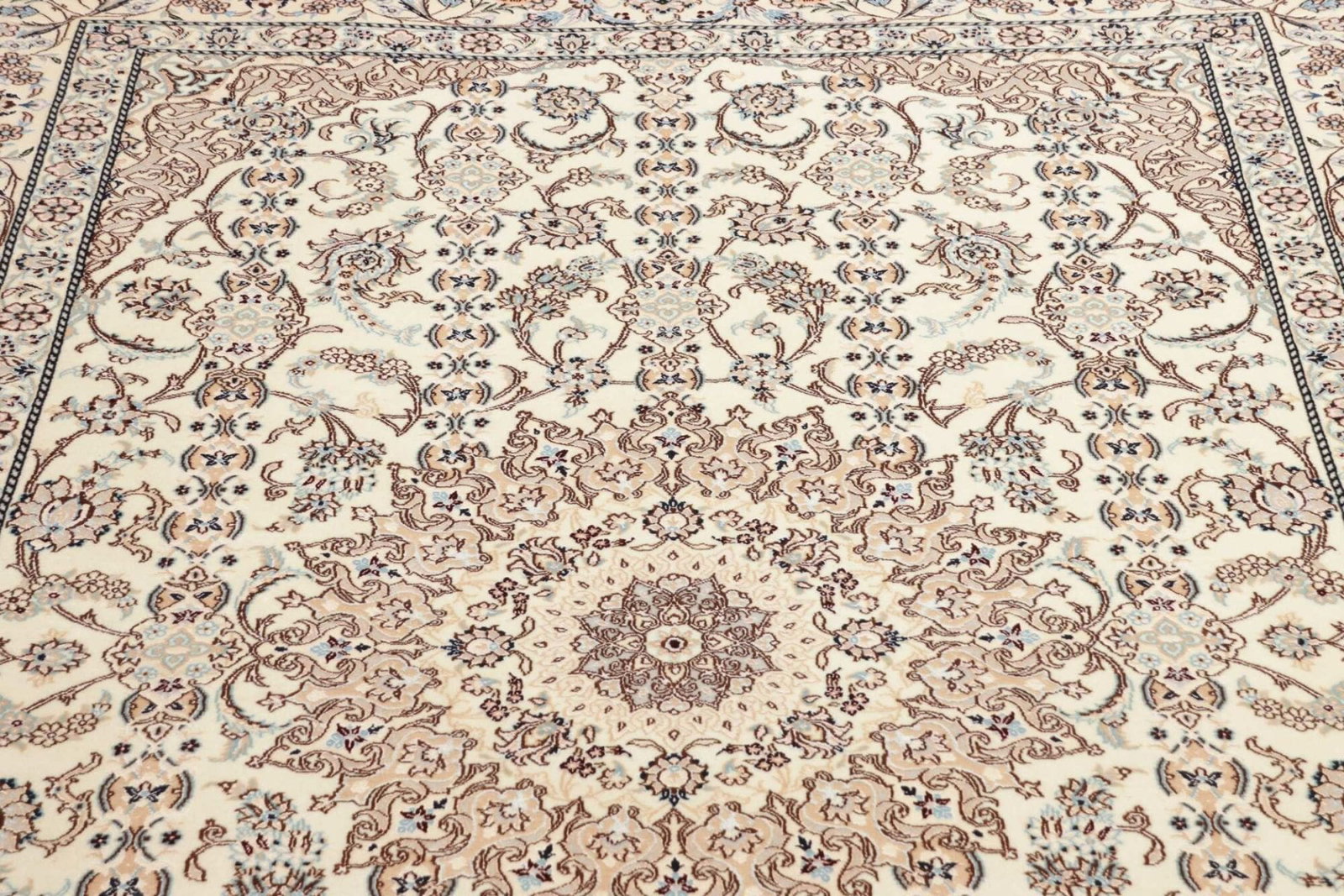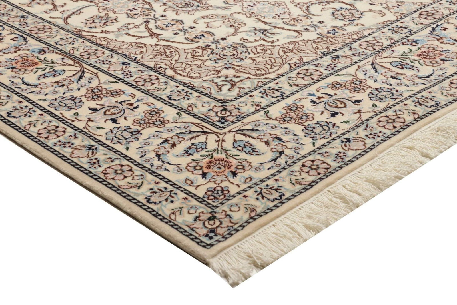 Das florale Design dieses Nain Teppichs ist besonders herausragend. Es kombiniert traditionelle persische Elemente mit modernen Akzenten, was ihn vielseitig einsetzbar macht – sei es im klassischen Wohnzimmer, im modernen Esszimmer oder sogar in einem stilvollen Büro. Die durchdachte Farbgebung und die harmonische Komposition der Muster fügen sich harmonisch in jede Einrichtung ein und verleihen jedem Raum eine besondere Atmosphäre.