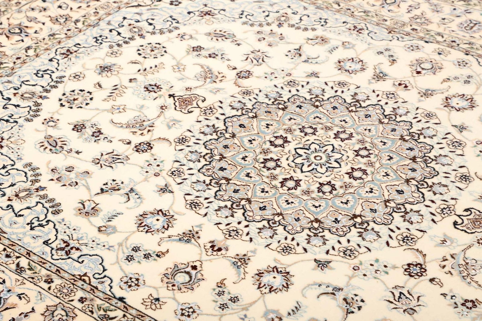 Der Nain Teppich stammt aus der gleichnamigen Stadt Nain im Iran, eine Region, die für ihre hochwertigen handgeknüpften Teppiche bekannt ist. Nain ist berühmt für seine exquisiten Teppichdesigns, die oft florale und geometrische Muster zeigen. Diese Stadt hat eine lange Tradition der Teppichproduktion, die bis ins 19. Jahrhundert zurückreicht, als die Teppichknüpfkunst in dieser Region ihren Aufschwung erlebte. Die Kunst des Teppichknüpfens wurde über Generationen hinweg von Handwerkern perfektioniert, die ihre Techniken und Designs von Ahnen an Nachfolger weitergaben. Die charakteristischen Muster und die hohe Qualität der Materialien drücken nicht nur ästhetische Werte aus, sondern auch kulturelle Bedeutung, da sie Geschichten und Traditionen der Region erzählen.