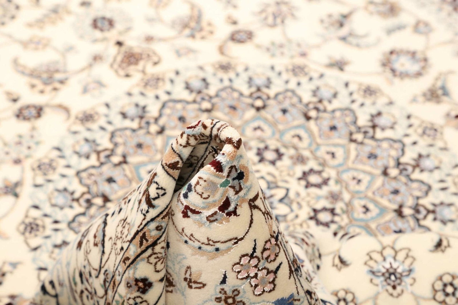 Wie viele andere Perserteppiche, wird auch der Nain Teppich aus edelsten Materialien gefertigt. Diese Teppiche bestehen in der Regel aus feiner Wolle und Seide, was ihnen eine luxuriöse Textur und Langlebigkeit verleiht. Das verwendete Material beeinflusst nicht nur die Optik, sondern auch die Strapazierfähigkeit des Teppichs. Dank der handgeknüpften Technik ist jeder Teppich ein Unikat, das Fachkenntnis und traditionelles Handwerk zu einem Meisterwerk vereint. Die hohe Knotendichte garantiert eine exzellente Qualität und sorgt dafür, dass die Farben intensiver und länger haltbar bleiben.