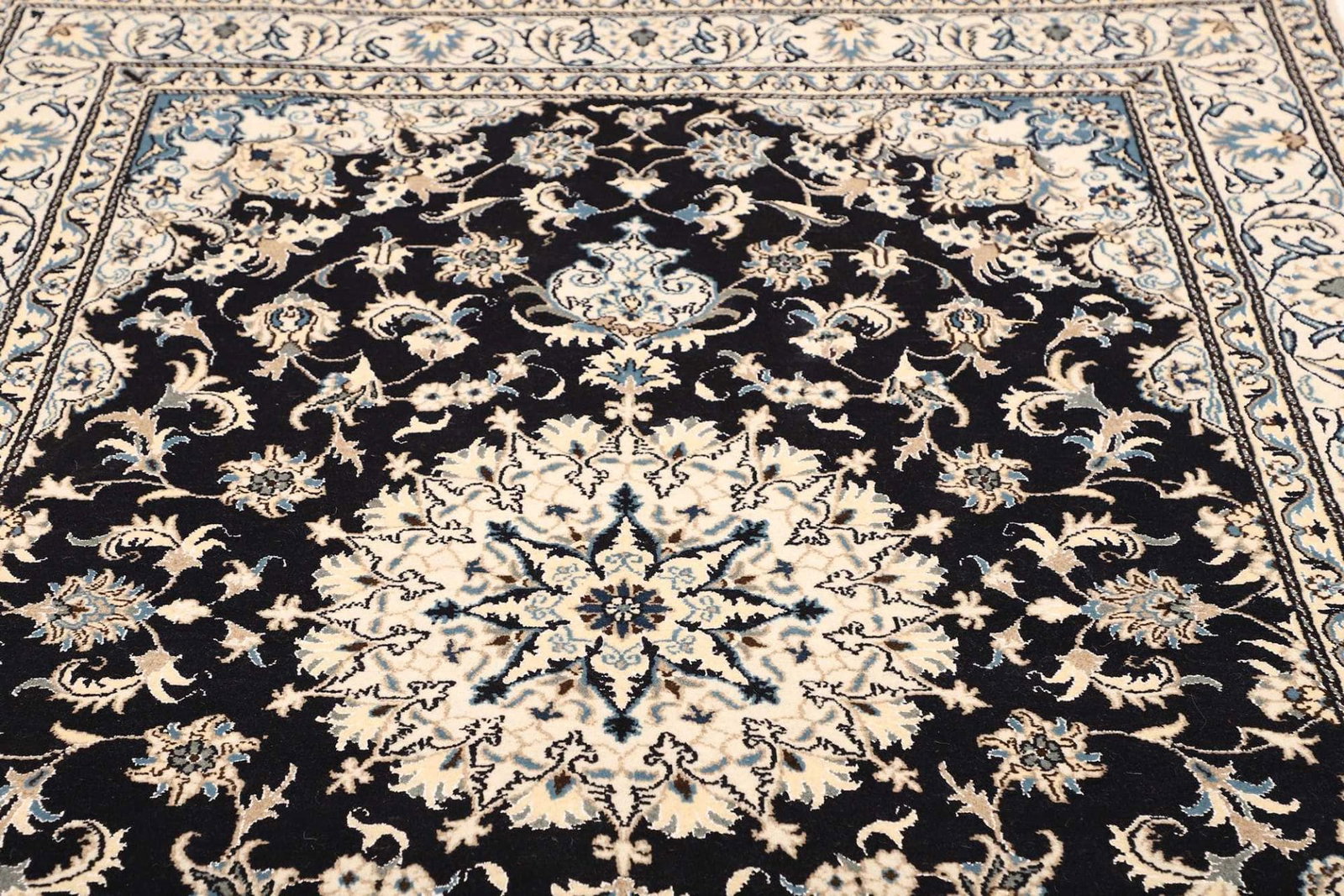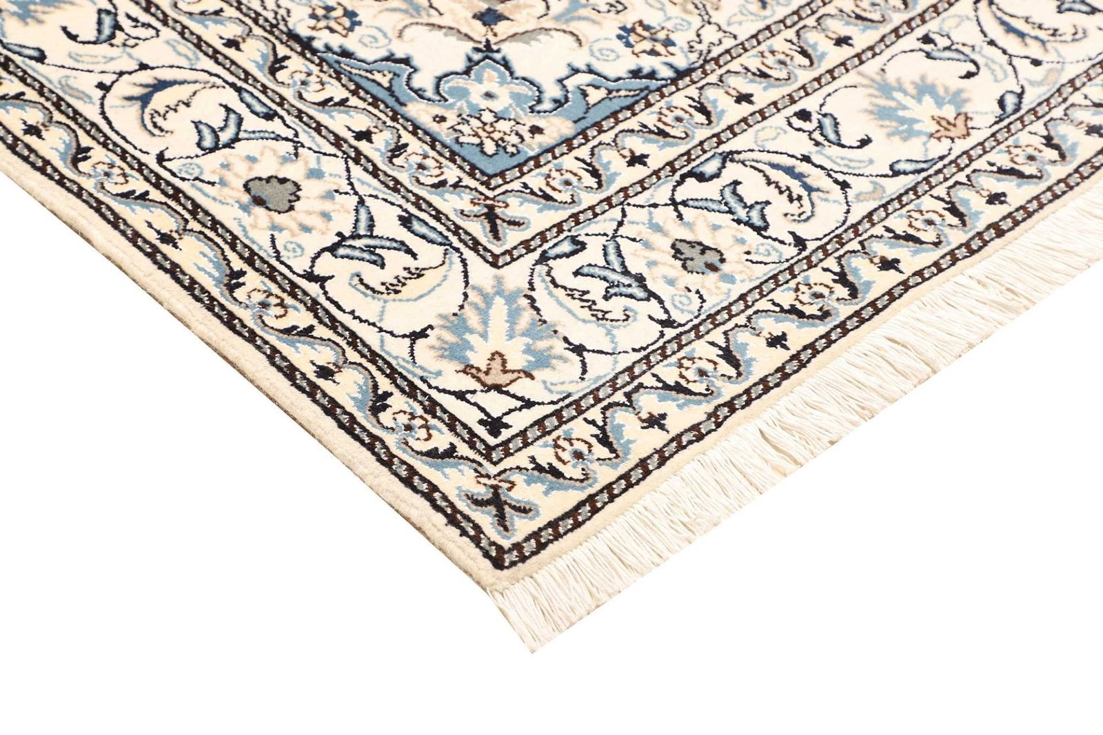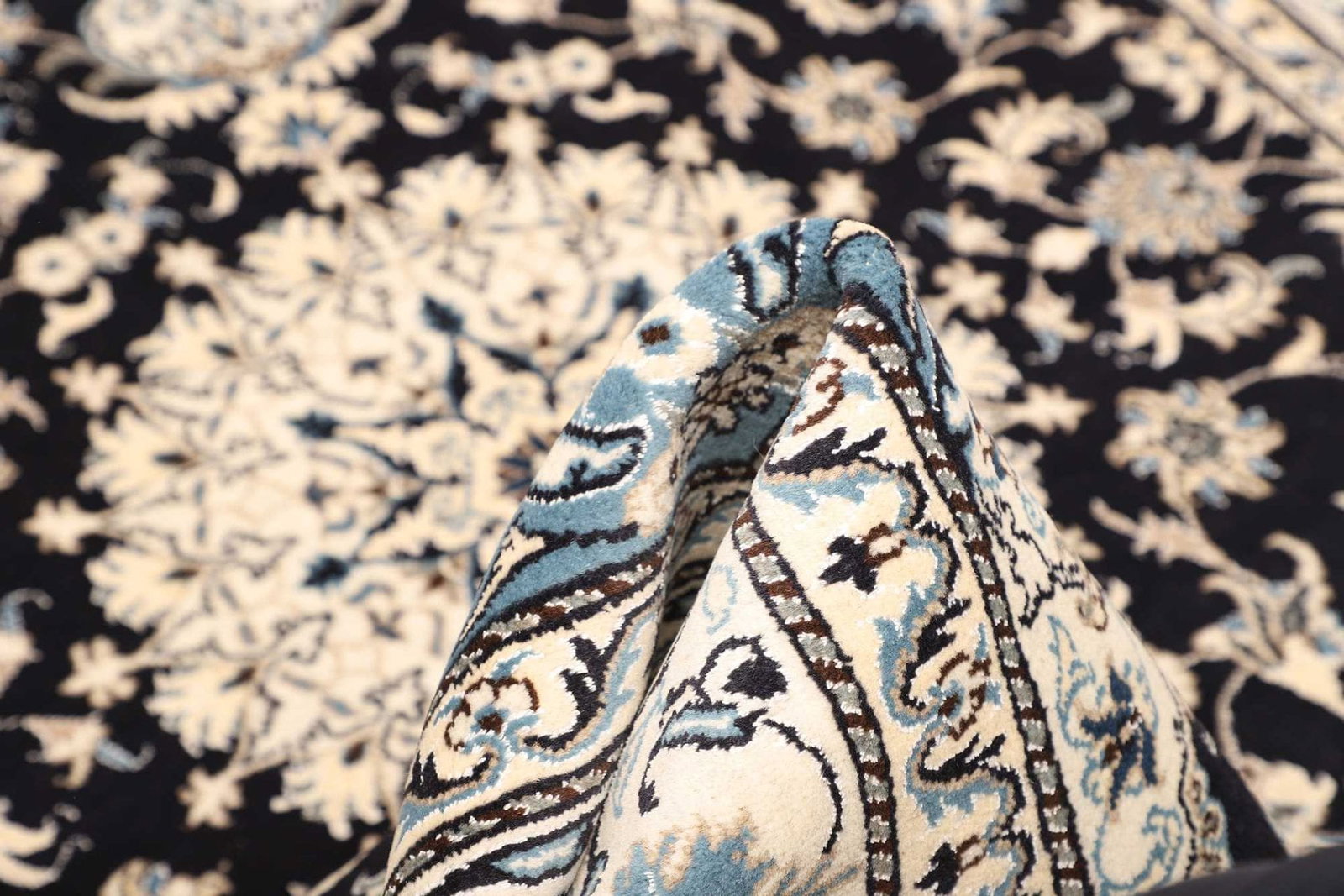 Das florale Muster dieses Nain Teppichs ist eine Hommage an die Natur und deren Schönheit. Diese Designs sind oft symbolisch und stehen für Wohlstand, Fruchtbarkeit und Harmonie. In der persischen Kultur haben florale Motive eine tiefere Bedeutung und repräsentieren den ewigen Kreislauf des Lebens. Das kunstvolle Zusammenspiel von Formen und Farben macht jeden Teppich zu einem Unikat, das nicht nur als Bodenbelag dient, sondern auch als Kunstwerk betrachtet werden kann.