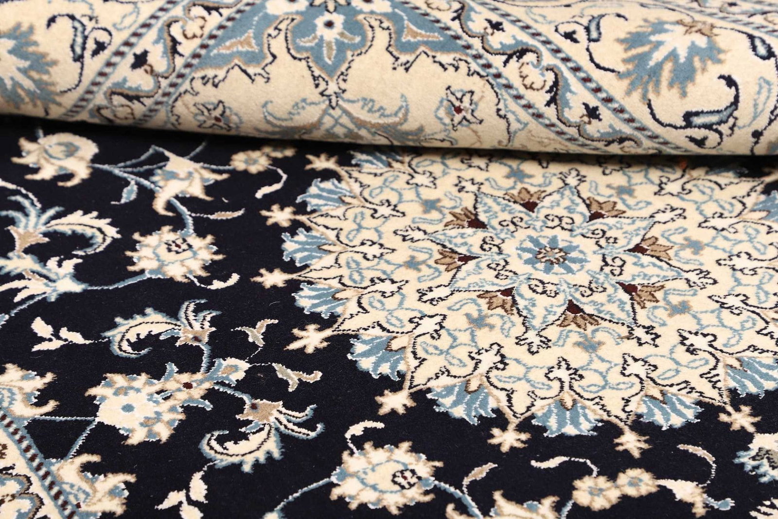 Der Nain Teppich wird aus hochwertigen Materialien hergestellt, die sowohl langlebig als auch ästhetisch ansprechend sind. Häufig wird für die Herstellung von Nain-Teppichen Schurwolle verwendet, die für ihre Weichheit und Strapazierfähigkeit bekannt ist. Die Seidenanteile, die oft in Nain Teppichen integriert sind, verleihen dem Teppich einen sanften Glanz und unterstreichen die komplexen Muster. Dieser handgeknüpfte Teppich besticht durch seine hohe Knotendichte, die ein feines und detailliertes Design ermöglicht. Diese Knotendichte zeugt nicht nur von der Qualität des Teppichs, sondern auch von der Geduld und dem Geschick der Weber, die jedes Stück bis ins kleinste Detail perfektionieren.