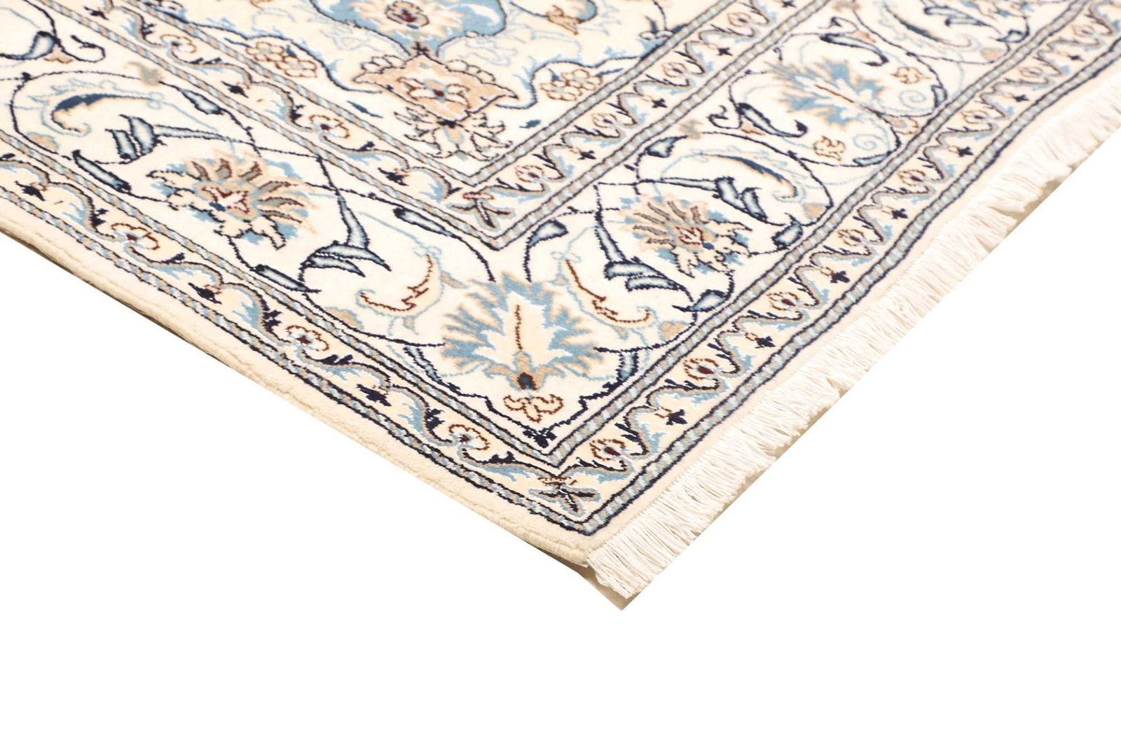 Der handgeknüpfte Nain Teppich ist ein kunstvolles Beispiel für die traditionelle Teppichkunst aus Iran. Dieser exquisite Perserteppich besticht durch seine floralen Muster und die hochwertigen Materialien, die für seine Herstellung verwendet wurden. Mit einer hohen Knotendichte und der sorgfältigen Verarbeitung präsentiert sich dieser Teppich als ein eindrucksvolles Stück für jedes Zuhause.