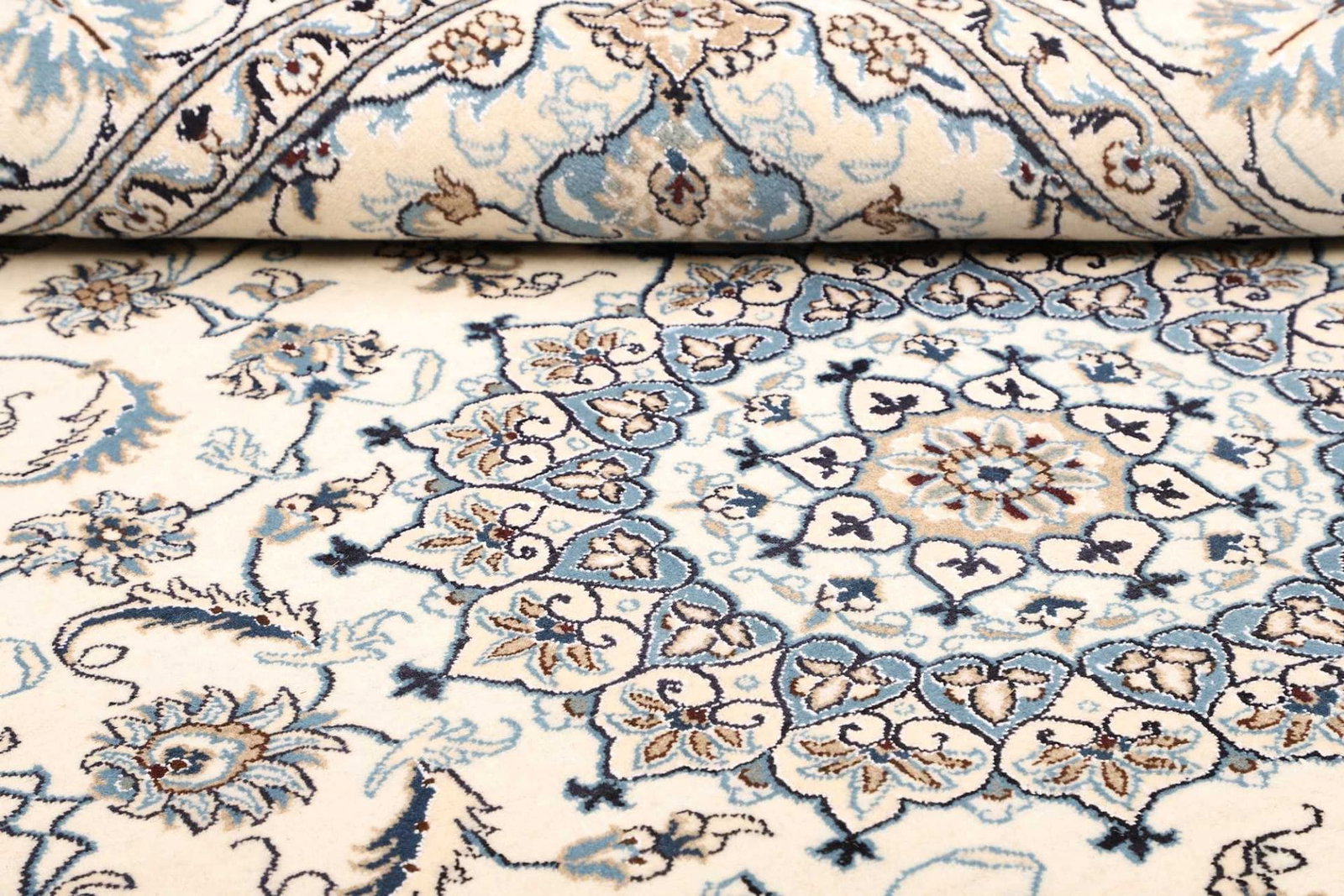 Der Nain Teppich wird aus feinstem Wolle und Seide hergestellt, was ihm nicht nur ein luxuriöses Aussehen verleiht, sondern auch eine außergewöhnliche Strapazierfähigkeit. Die Kombination von Wolle und Seide sorgt für einen weichen, geschmeidigen Flor, der gleichzeitig robust genug ist, um den Anforderungen des täglichen Gebrauchs standzuhalten. Die Handarbeit, die in jeden Teppich fließt, sorgt für eine Qualität, die maschinell hergestellte Teppiche nicht erreichen können. Die Knotendichte, die bei Nain Teppichen besonders hoch ist, stellt sicher, dass der Teppich über viele Jahre hinweg seine Schönheit behält, während die sorgfältige Knotentechnik die Feinheit der Muster unterstreicht.