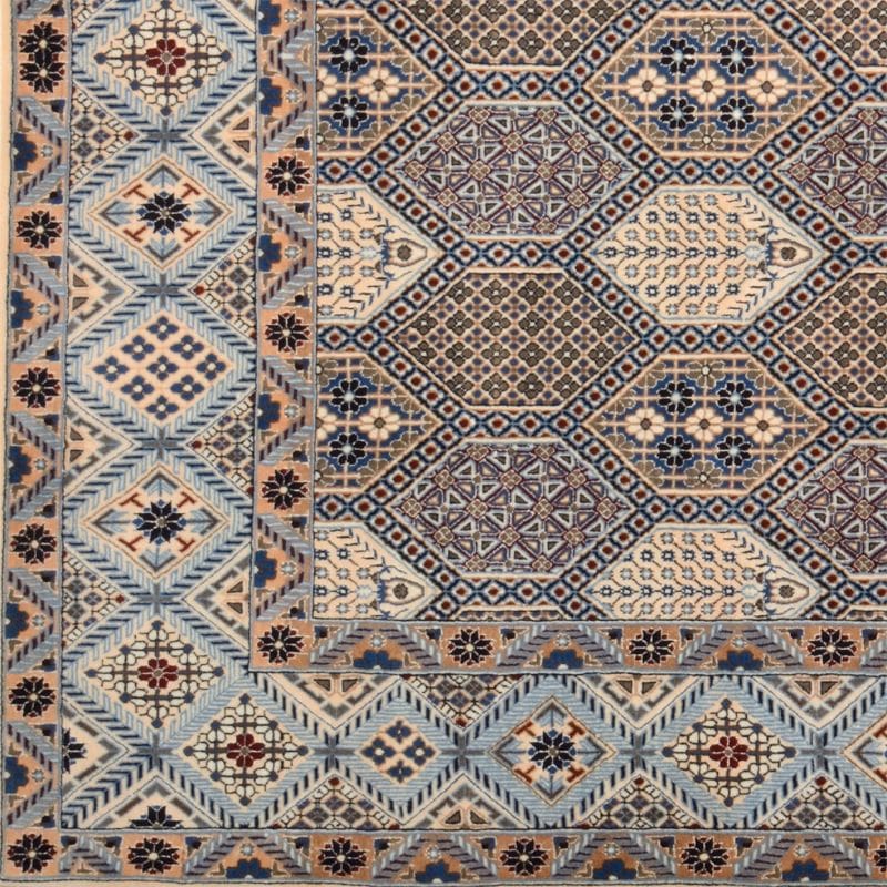 Der Teppich ist handgeknüpft und stammt aus den traditionellen Werkstätten der Region Nain im Iran. Nain-Teppiche zeichnen sich durch ihre hohe Knotendichte aus, die oft zwischen 300.000 und 700.000 Knoten pro Quadratmeter liegt. Diese exquisite Knotentechnik sorgt nicht nur für eine extreme Detailgenauigkeit in den Designs, sondern auch für eine langlebige und robuste Struktur. Die Materialien, die bei der Herstellung verwendet werden, sind in der Regel eine Mischung aus Wolle und Seide, die einen luxuriösen Glanz und ein weiches Gefühl vermittelt. Dieses Material macht den Teppich besonders widerstandsfähig und leicht zu reinigen, was ihn zu einer idealen Wahl für stark frequentierte Räume macht.