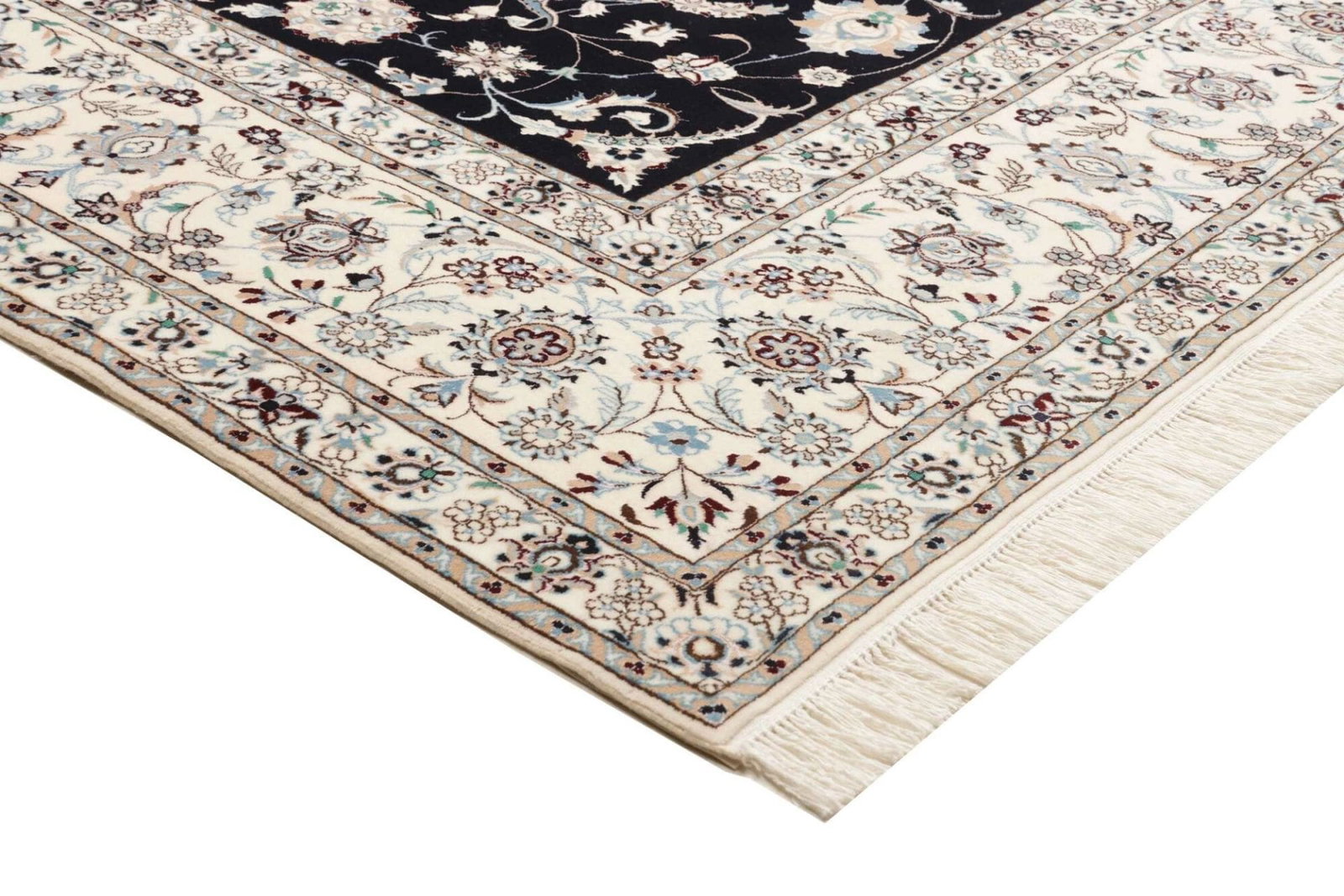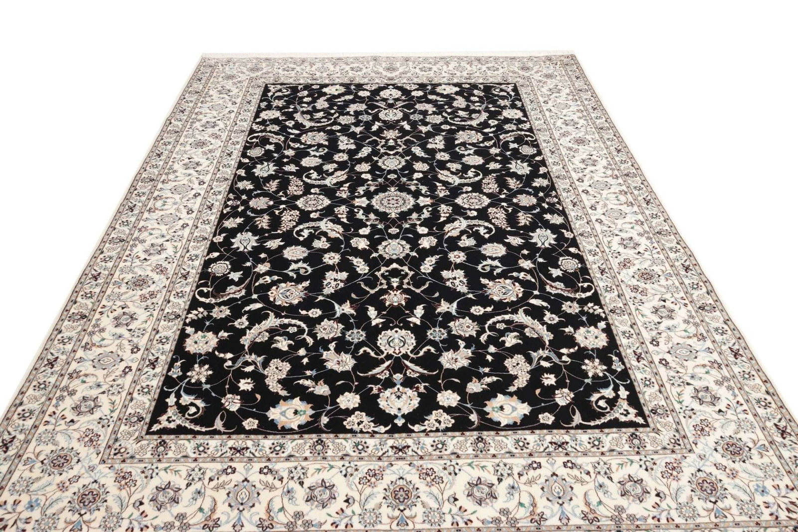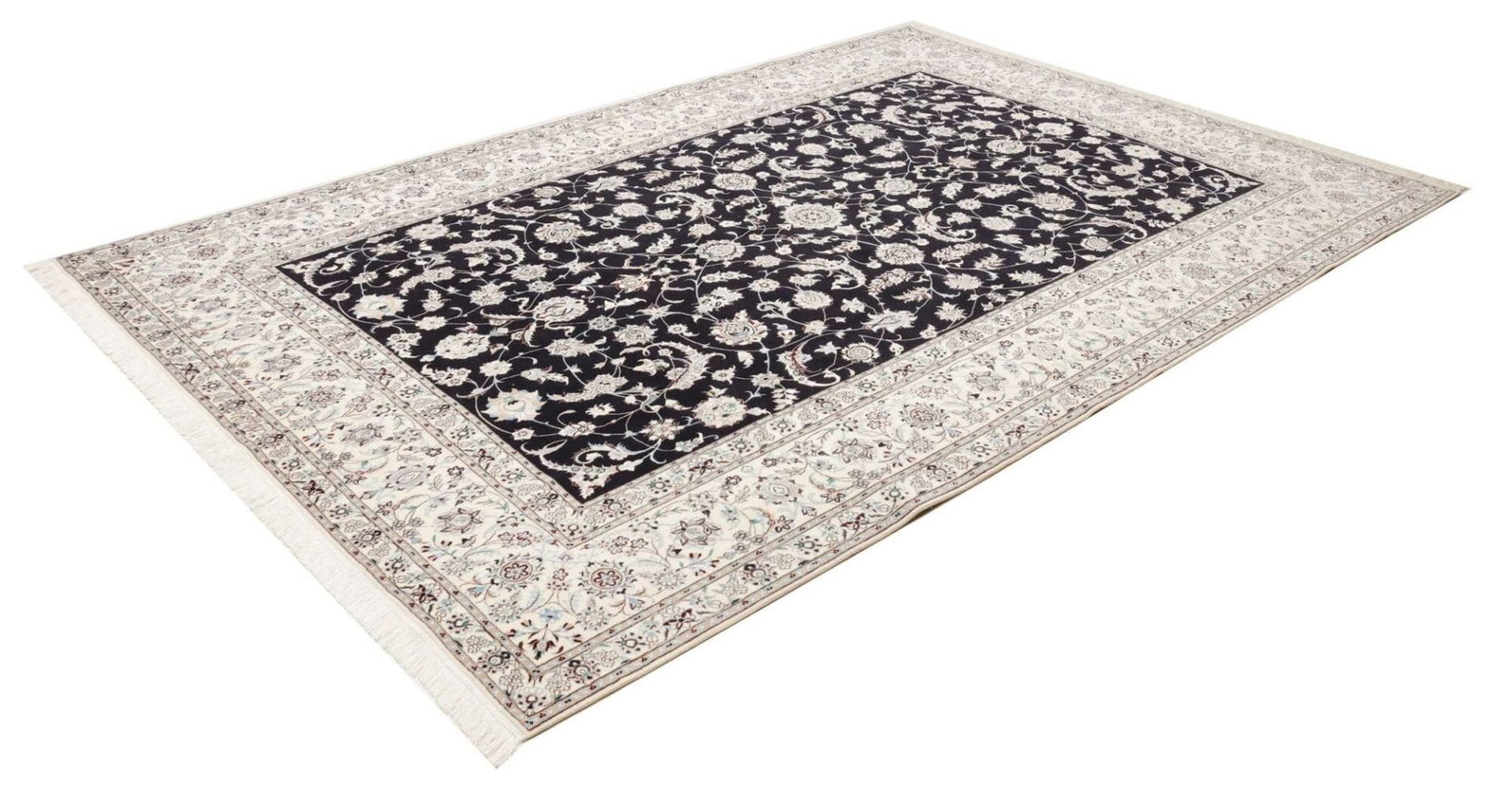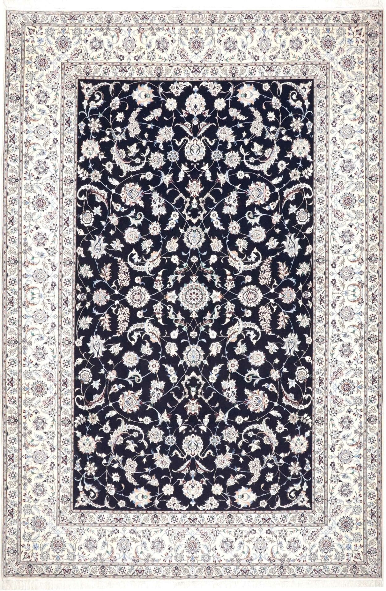 13646$Ursprünglicher Preis war: 13646$12250$Aktueller Preis ist: 12250$Nain Teppich | Knotendichte: ca. 900.000 Knoten/m² | Material: 100% Schurwolle (Flor), 100% Baumwolle (Kette) | Größe: 208 x 307 cm | In ausgezeichnetem Zustand | Herkunft: Iran | Handgeknüpft | Elegante florale Musterung mit königsblauem Akzent