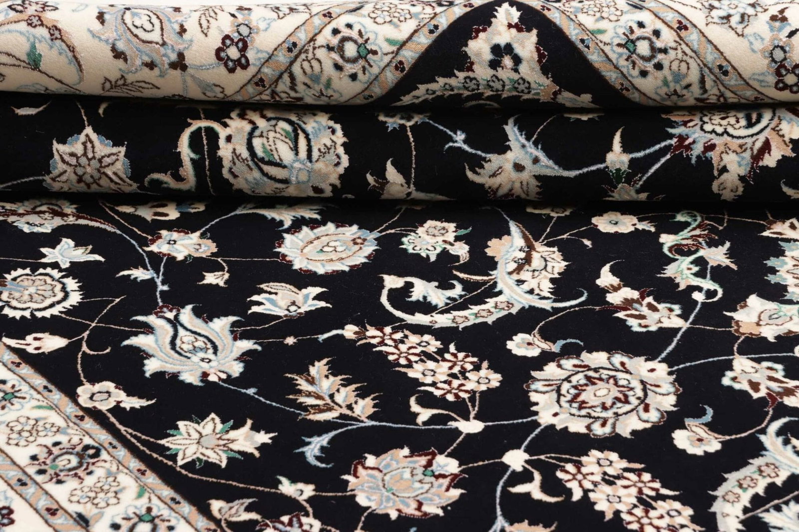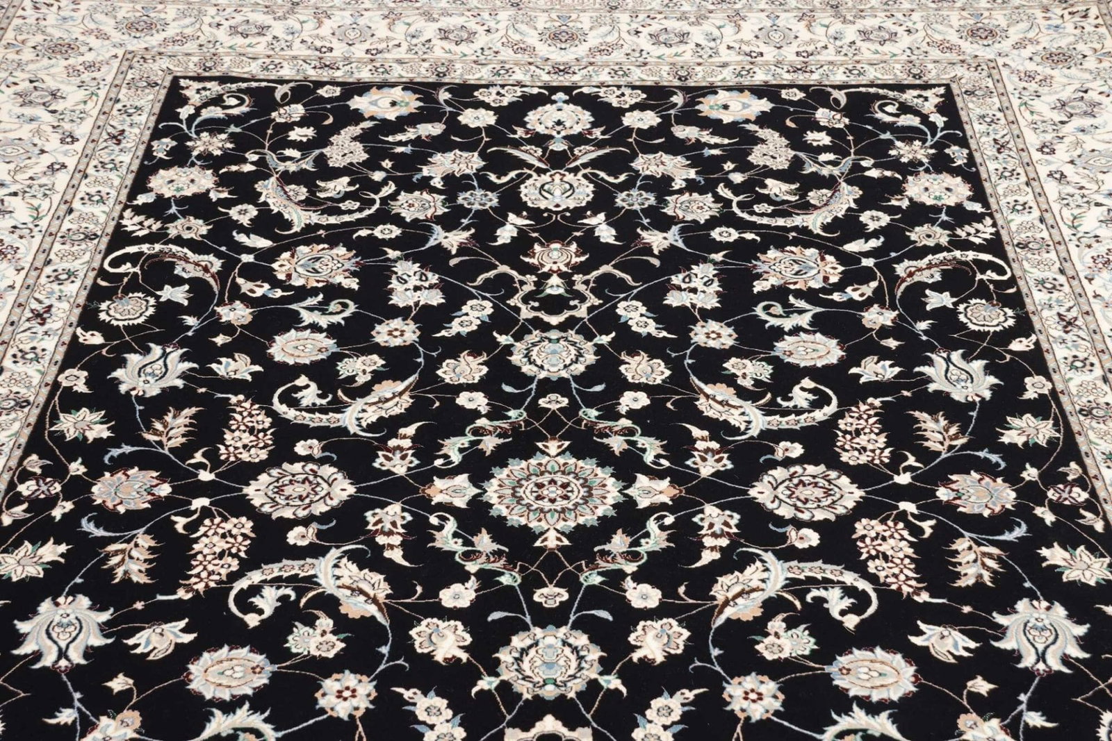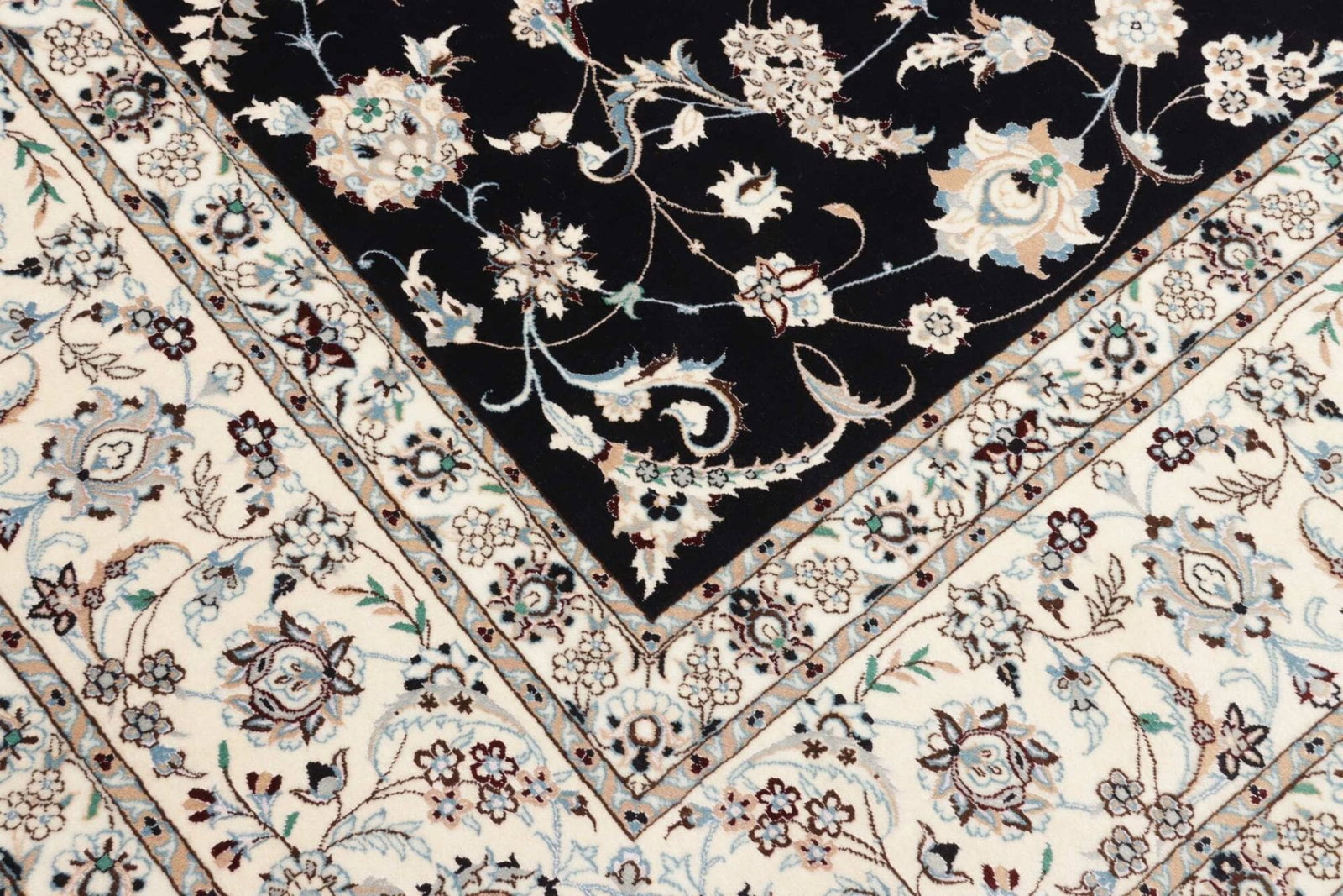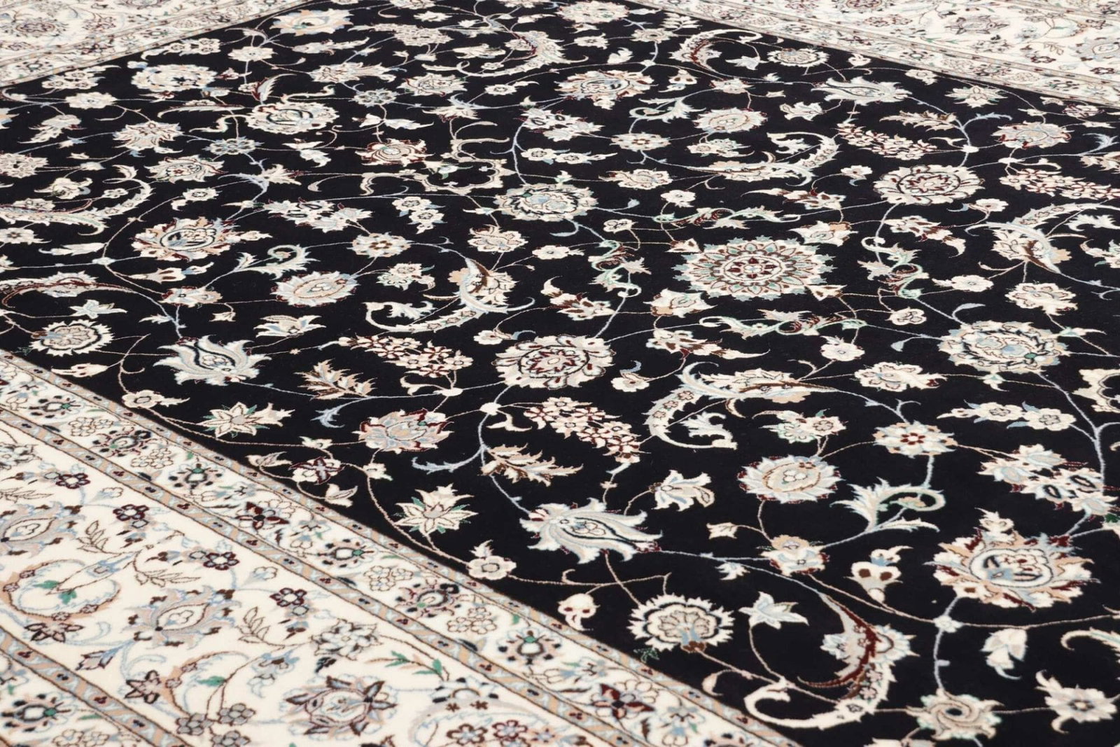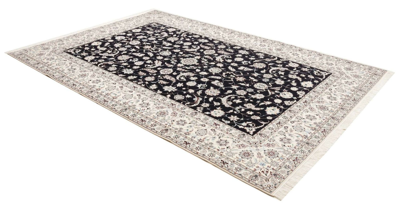 13646$Ursprünglicher Preis war: 13646$12250$Aktueller Preis ist: 12250$Nain Teppich | Knotendichte: ca. 900.000 Knoten/m² | Material: 100% Schurwolle (Flor), 100% Baumwolle (Kette) | Größe: 208 x 307 cm | In ausgezeichnetem Zustand | Herkunft: Iran | Handgeknüpft | Elegante florale Musterung mit königsblauem Akzent