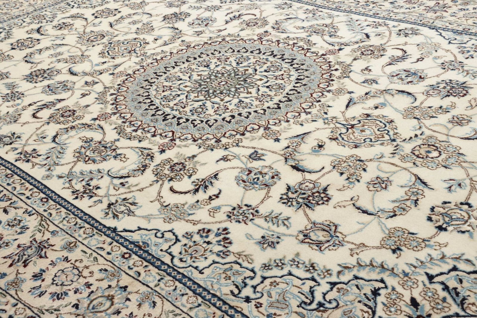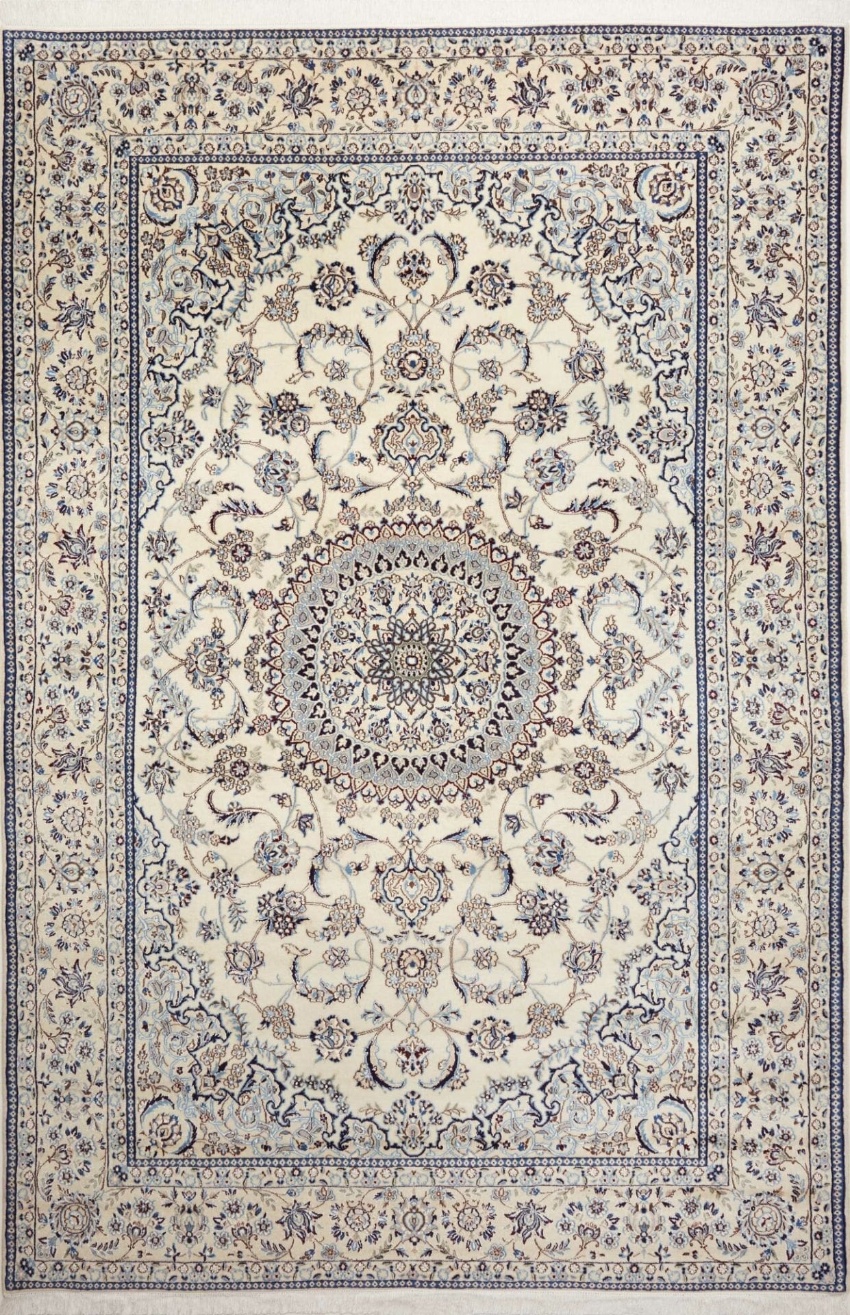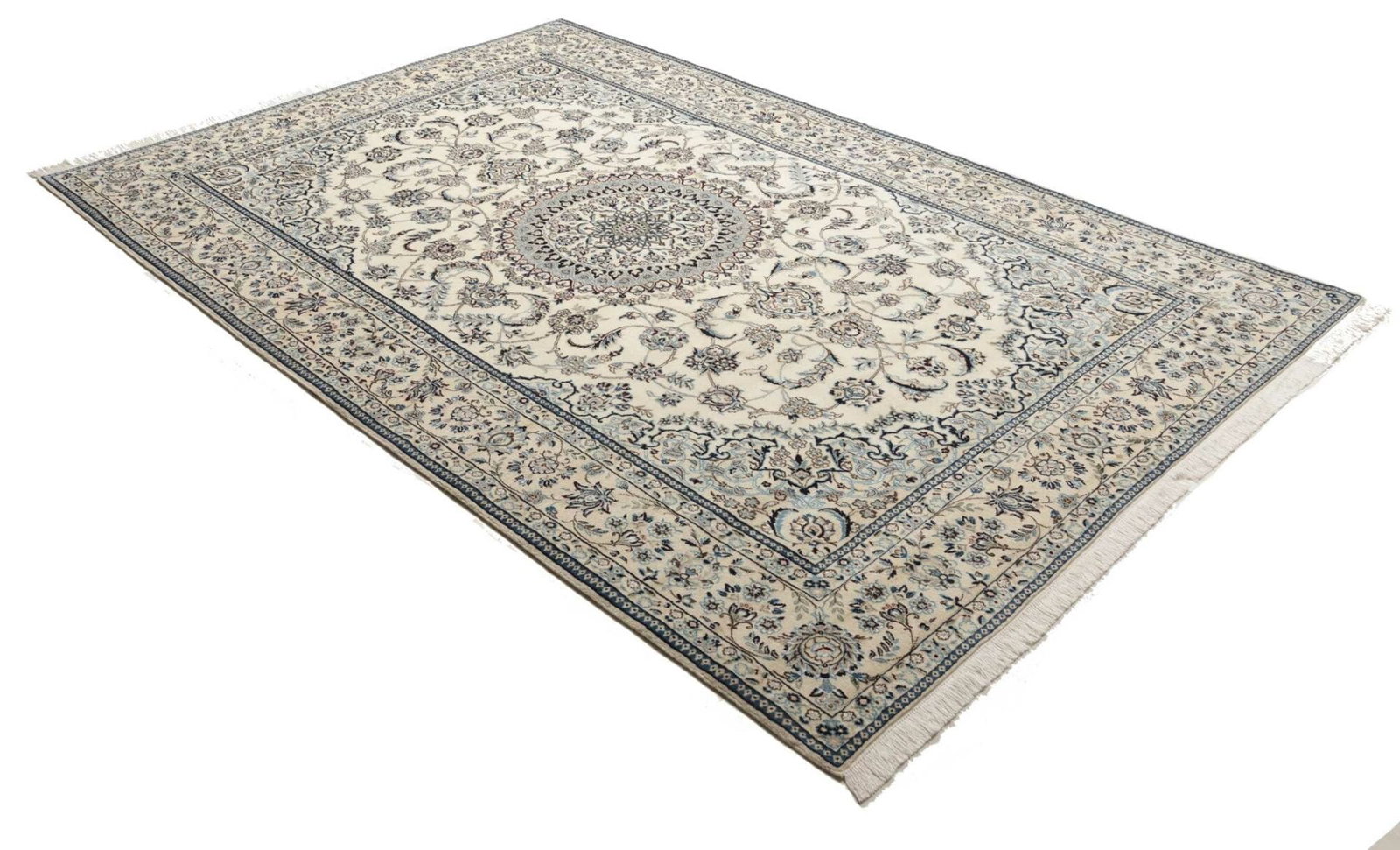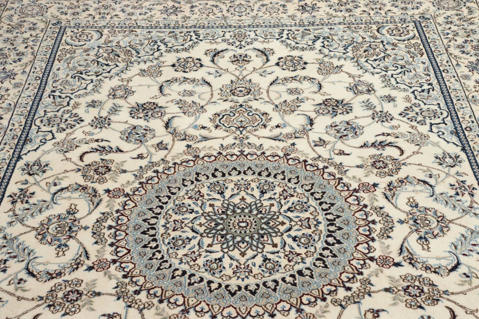 6227$Ursprünglicher Preis war: 6227$5559$Aktueller Preis ist: 5559$Nain Teppich | Knotendichte: ca. 500.000 Knoten/m² | Material: 100% Schurwolle (Flor), 100% Baumwolle (Kette) | Größe: 207 x 304 cm | Handgeknüpft | Ursprung: Iran | Muster: Klassische florale Motive in hellem Grundton und königsblau