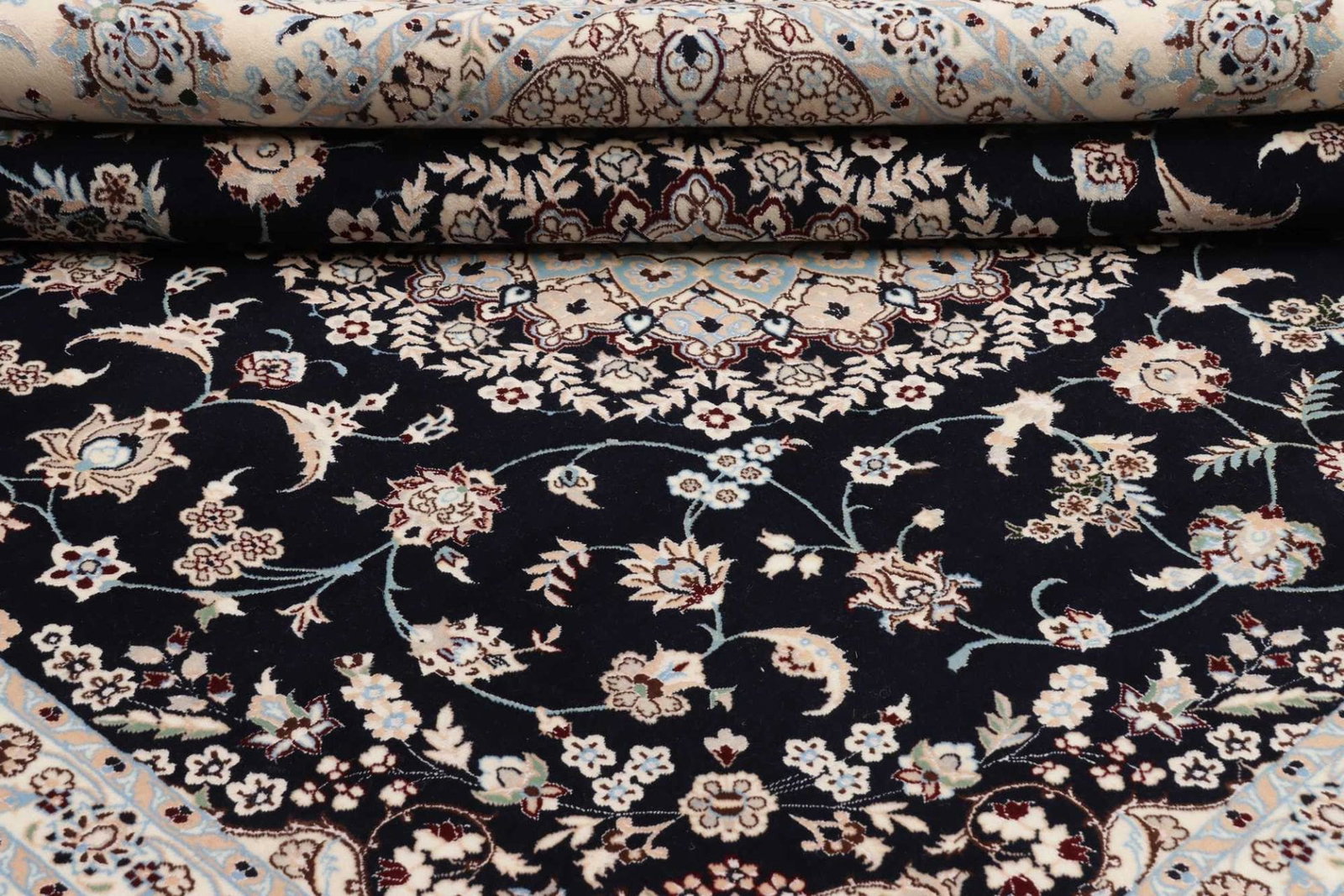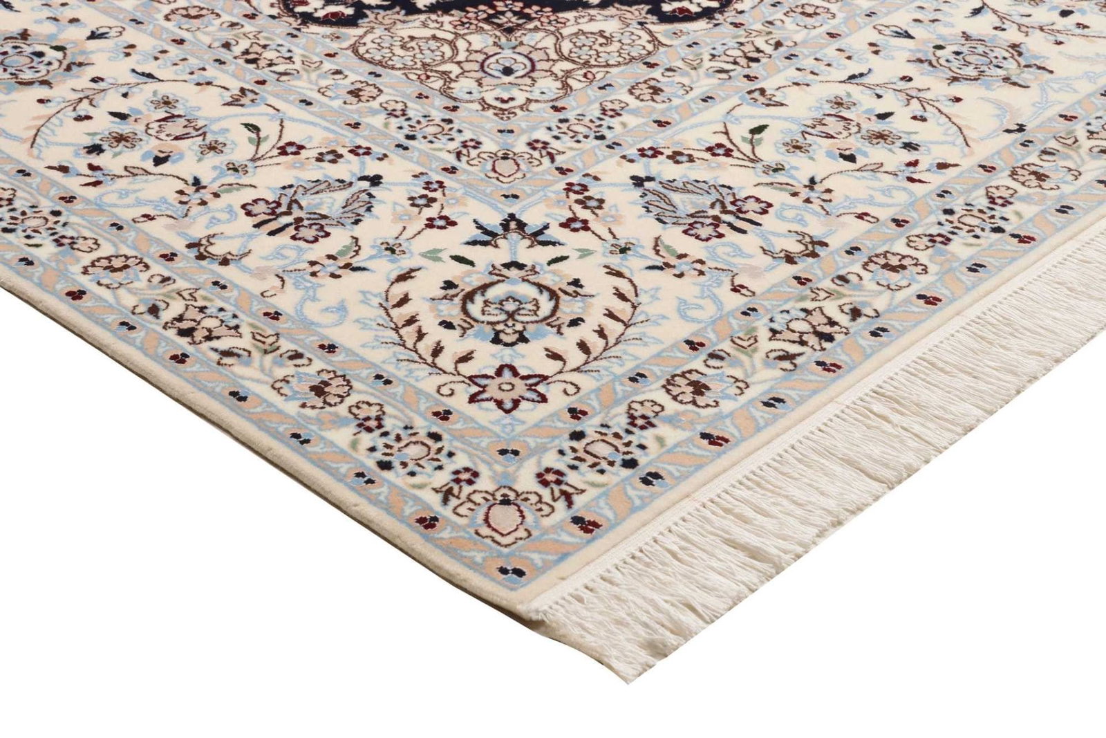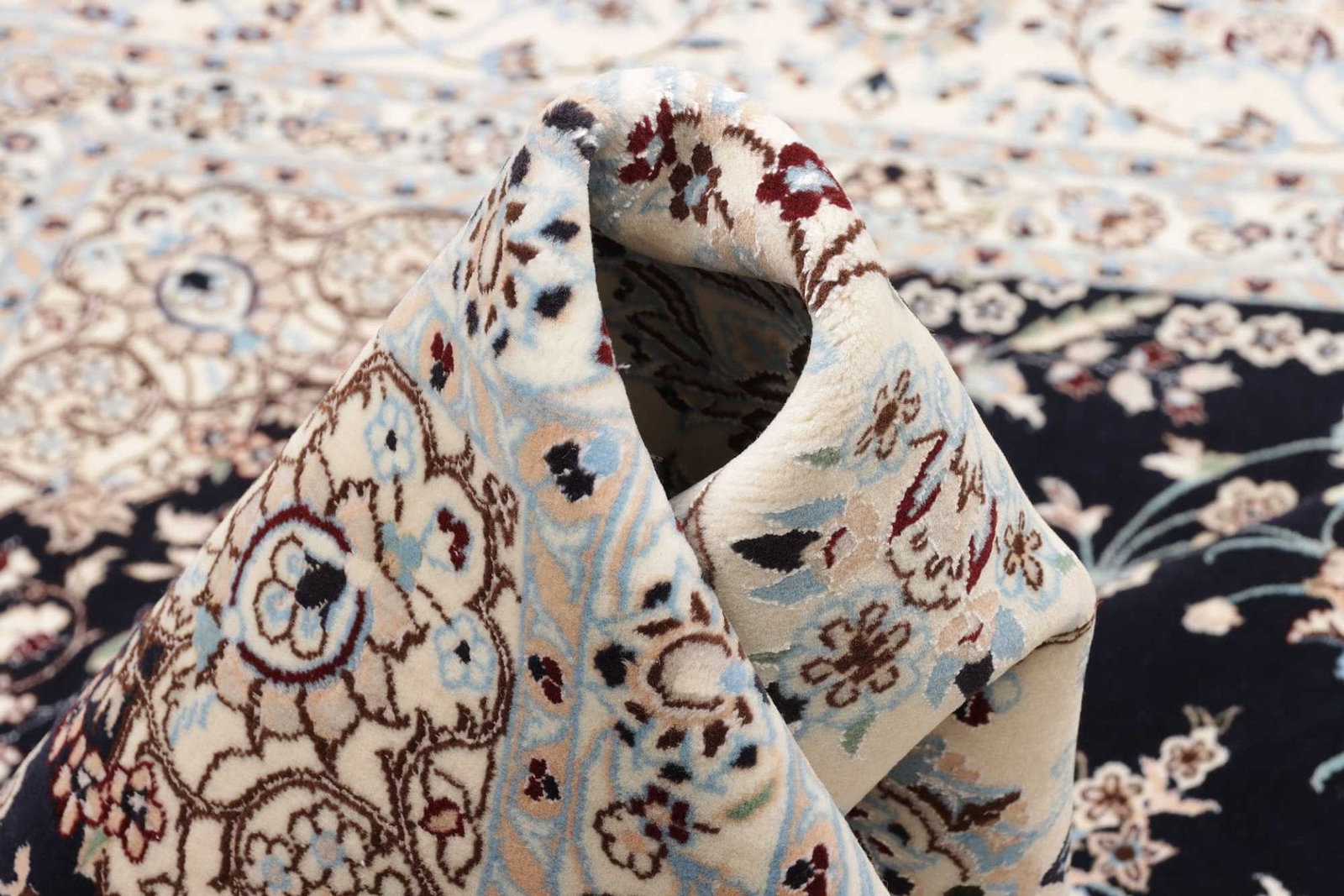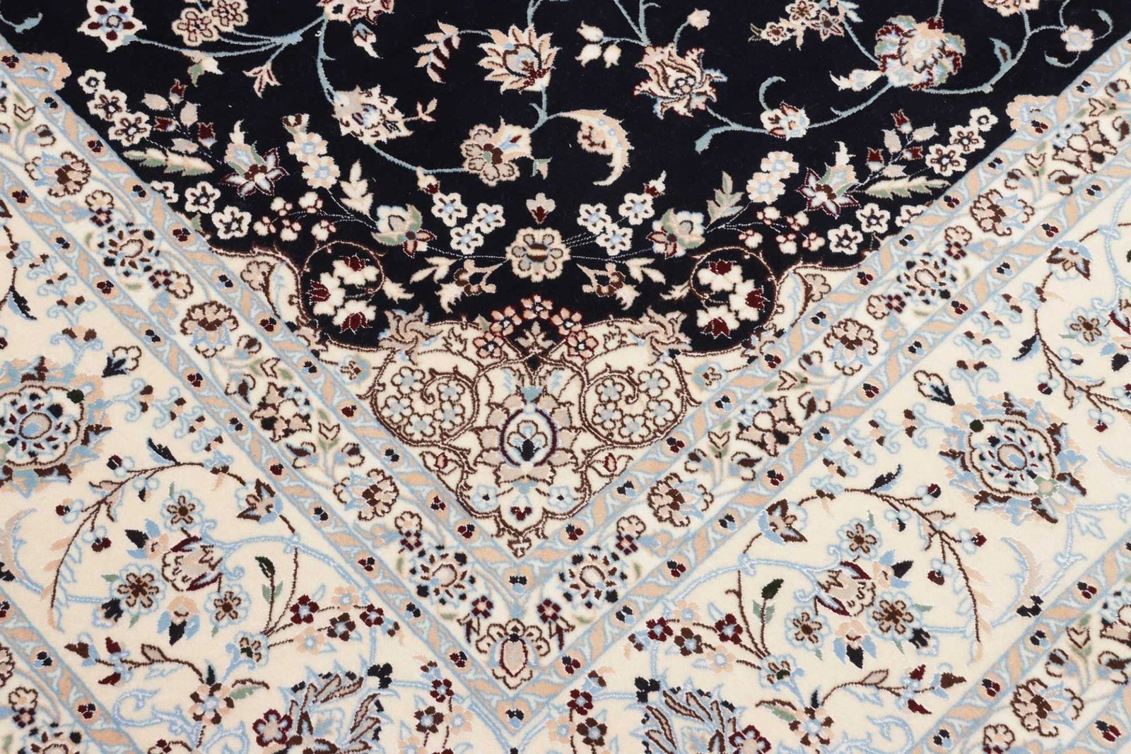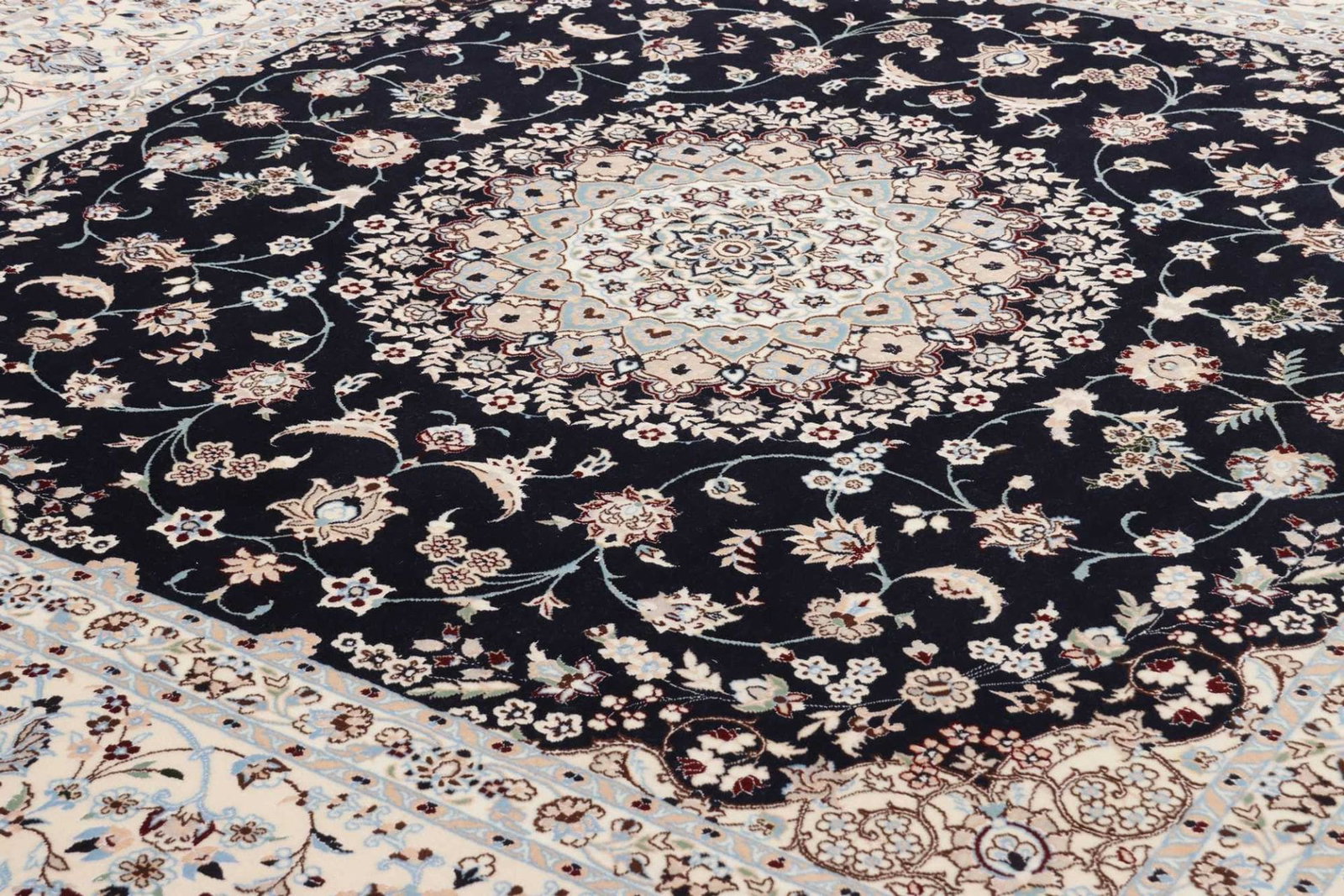 Dieser Teppich stammt aus der Region Nain im Iran, die für ihre exzellenten Teppichknüpftraditionen bekannt ist. Nain ist eine Stadt mit einer langen Geschichte in der Teppichfertigung, die bis ins 19. Jahrhundert zurückreicht. Die Teppiche aus Nain sind berühmt für ihre feinen Materialien, präzisen Knüpftechniken und eleganten Designs, die oft florale und geometrische Muster zeigen. Die Tradition des Teppichknüpfens in dieser Region spiegelt die kulturellen und künstlerischen Einflüsse wider, die über Jahrhunderte in der Stadt gewachsen sind.