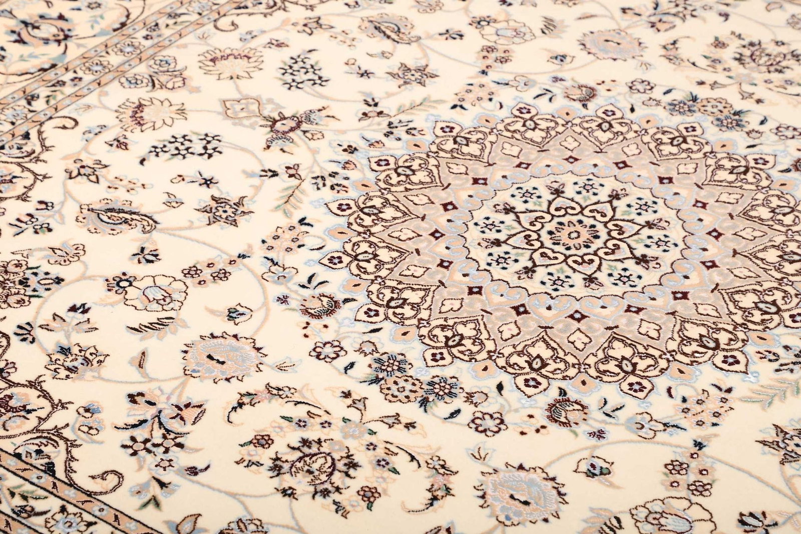 Das florale Muster dieses Nain Teppichs ist besonders eindrucksvoll und verleiht jedem Raum Eleganz. Die Blumenmuster sind oft von der Natur inspiriert und spiegeln die Schönheit der iranischen Landschaft wider. Die Farbtöne sind sorgfältig abgestimmt, um eine harmonische Atmosphäre zu schaffen.