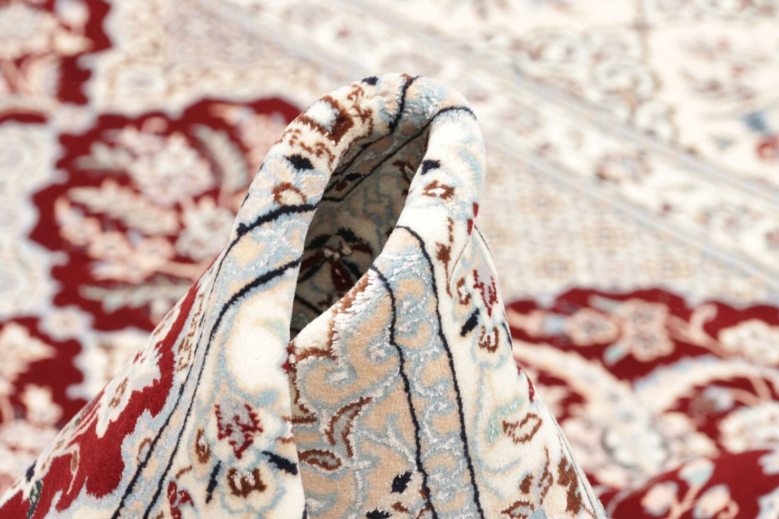 Der Nain Teppich ist mit hochwertigen Materialien gefertigt, die für ihre Langlebigkeit und ihren Komfort bekannt sind. Die Verwendung von feiner Wolle und oft auch Seide sorgt nicht nur für ein weiches Gefühl unter den Füßen, sondern verleiht dem Teppich auch einen einmaligen Glanz. Die Knotendichte dieses handgeknüpften Meisterwerks ist besonders hoch, was für eine außergewöhnliche Detailgenauigkeit in den floralen Mustern sorgt. Jeder Knüpfstich wird in sorgfältiger Handarbeit ausgeführt, was die Einzigartigkeit und die hervorragende Qualität jedes einzelnen Teppichs unterstreicht.