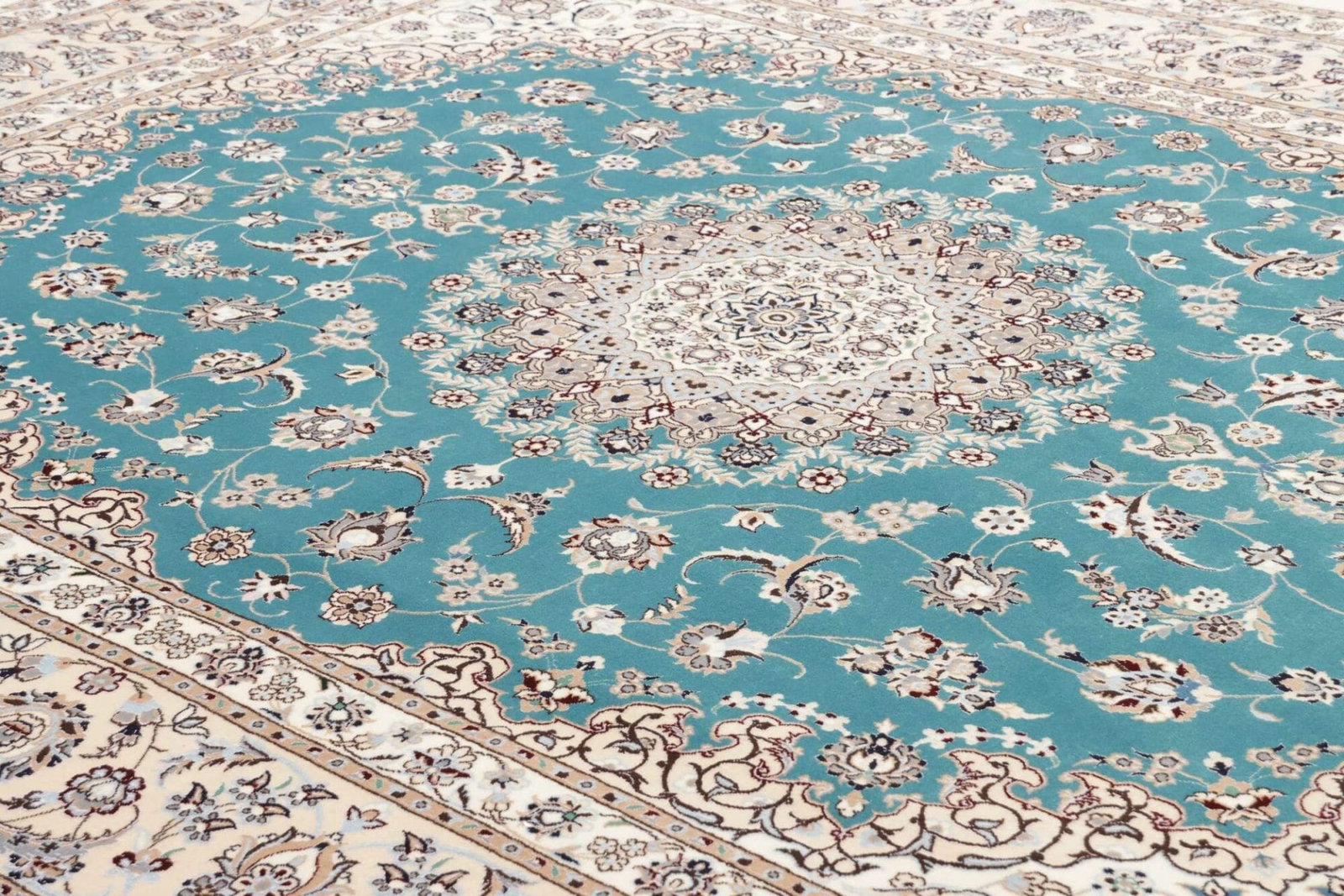 Der Nain Teppich stammt aus der gleichnamigen Stadt Nain im Iran, bekannt für ihre exzellente Teppichproduktion. Diese Region hat eine lange Tradition in der Teppichweberei, die bis ins 18. Jahrhundert zurückreicht. Nain-Teppiche zeichnen sich durch ihre feinen Materialien und ihre exquisiten Designs aus. Traditionell werden sie von Hand und häufig nach alten Mustern geknüpft, die oft florale Elemente und ornamentale Motive beinhalten. Die Teppichknüpfer in Nain legen großen Wert auf Detailgenauigkeit und ästhetische Harmonie, wodurch jeder Teppich zu einem einzigartigen Kunstwerk wird.