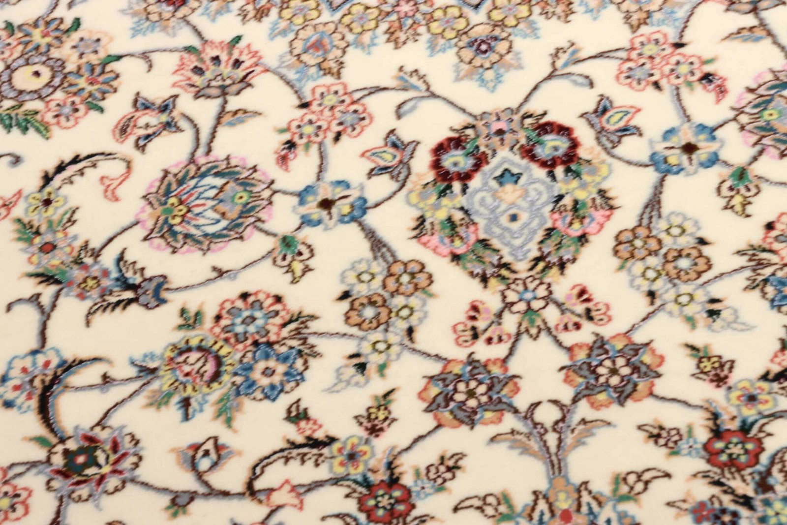 Das florale Design dieses Nain Teppichs ist sowohl ansprechend als auch zeitlos. Die lebendigen Farben und die geschickte Anordnung der Blüten und Blätter erzeugen eine harmonische und beruhigende Atmosphäre in jedem Raum. Die floralen Motive können Symbolik und kulturellen Bezug haben, die oft mit Harmonie und Natur assoziiert werden. Diese Teppiche sind nicht nur dekorativ, sondern tragen auch dazu bei, eine einladende Umgebung zu schaffen.