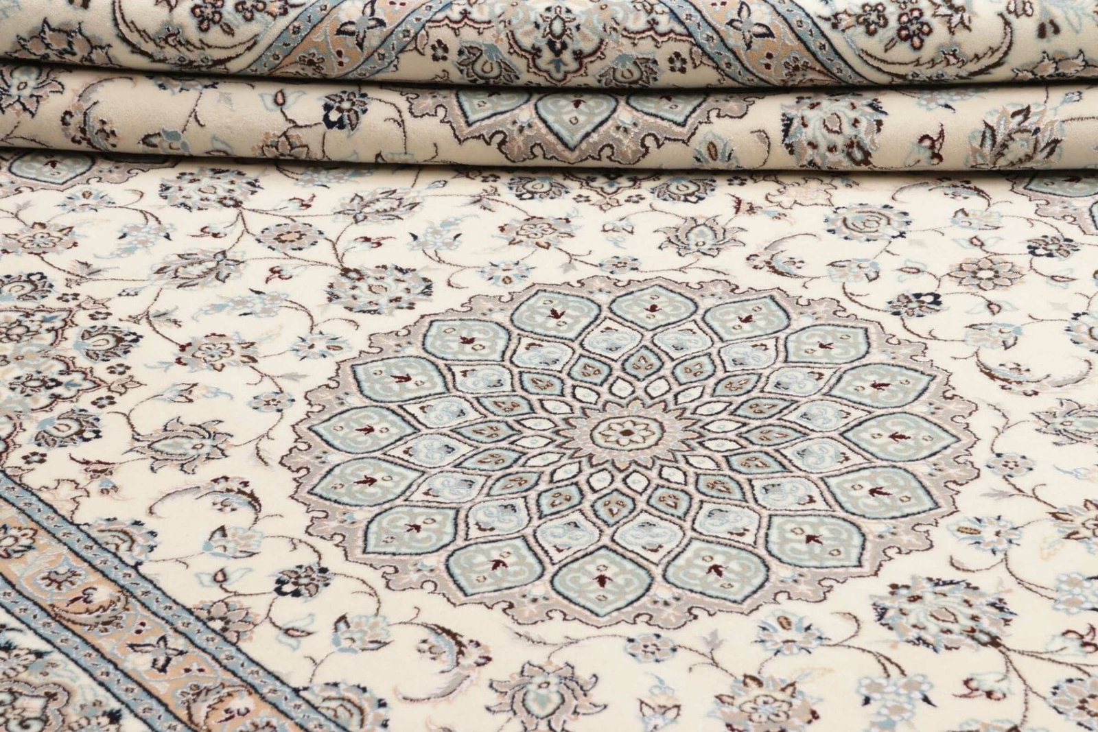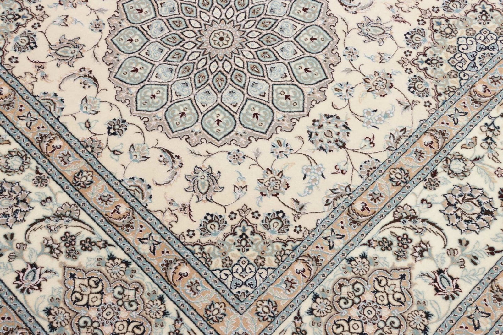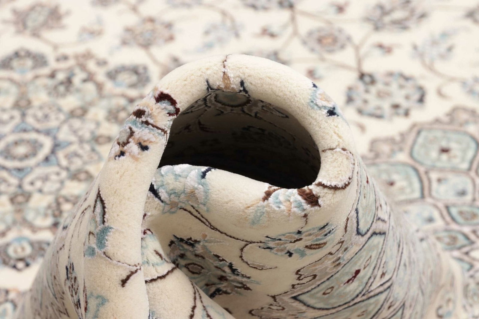 Der Nain Teppich wird aus feinstem Wolle und hochwertiger Seide gefertigt, was ihm eine unvergleichliche Weichheit und luxuriöse Optik verleiht. Die verwendete Wolle ist bekannt für ihre Strapazierfähigkeit, während die Seide für einen subtilen Glanz sorgt, der das florale Muster lebendig werden lässt. Handgeknüpft in traditioneller Teppichknüpftechnik, weist dieser Teppich eine hohe Knotendichte auf, die ihm sowohl einen robusten Charakter als auch eine unglaublich detaillierte Darstellungsweise der Muster verleiht. Die sorgfältige Auswahl der Materialien und die exakte Ausführung machen den Nain Teppich nicht nur zu einem Kunstwerk, sondern auch zu einem funktionalen Wohnaccessoire.