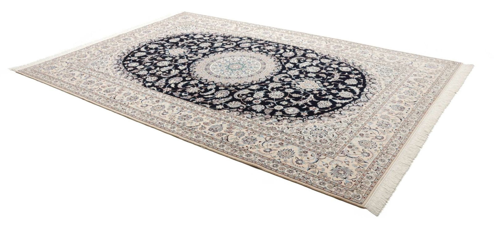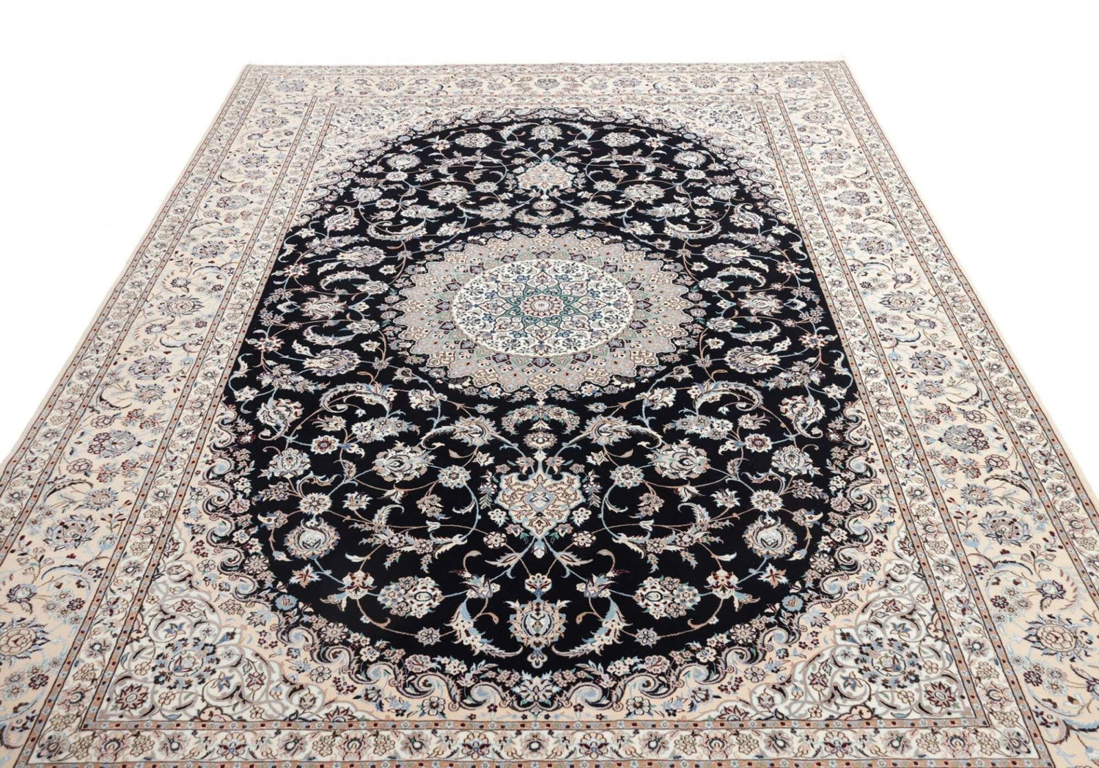 15258$Ursprünglicher Preis war: 15258$12945$Aktueller Preis ist: 12945$Nain Teppich | Knotendichte: ca. 900.000 Knoten/m² | Material: 100% Schurwolle (Flor), 100% Baumwolle (Kette) | Größe: 223 x 320 cm | Zustand: Exklusiv und handgeknüpft | Herkunft: Iran | Muster: Klassische florale Motive in hellen und königsblauen Tönen