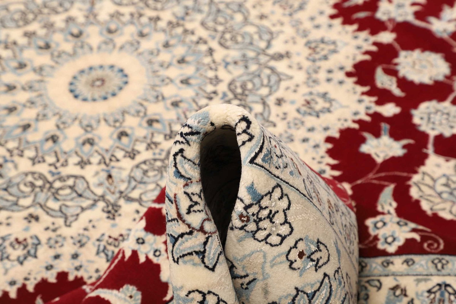 Die Fertigung des Nain Teppichs erfolgt aus hochwertigen Materialien, insbesondere aus Wolle und Seide. Die Wolle bietet nicht nur eine beeindruckende Langlebigkeit, sondern verleiht dem Teppich auch eine angenehme Weichheit. Seide wird oft für die floralen Details verwendet, wodurch ein subtiler Glanz entsteht, der das Gesamtbild des Teppichs aufwertet. Dank der handgeknüpften Technik ist jede Faser einzigartig und verleiht dem Teppich Charakter. Die Knotendichte ist bei Nain Teppichen besonders hoch, was ihnen eine dichte und plüschige Oberfläche verleiht, die sowohl ästhetisch ansprechend als auch strapazierfähig ist.