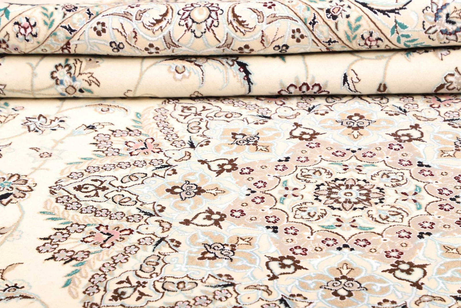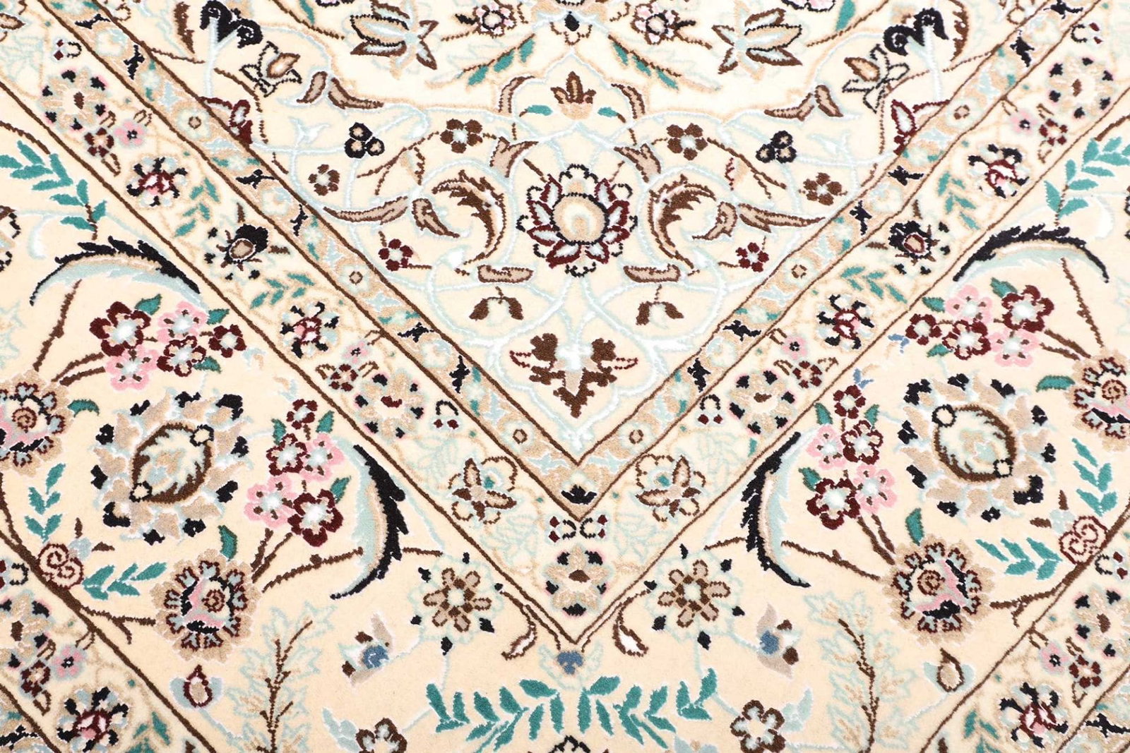 Die floralen Muster dieses Nain Teppichs sind nicht nur schön anzusehen, sie tragen auch eine symbolische Bedeutung. Blumen und Pflanzen sind oft Symbole für Fruchtbarkeit, Liebe und die Verbindung zur Natur in der persischen Kultur. Bei der Gestaltung eines Nain Teppichs legen die Knüpfer großen Wert darauf, die Natur nachzuempfinden und in die TEXTILKUNST zu integrieren.