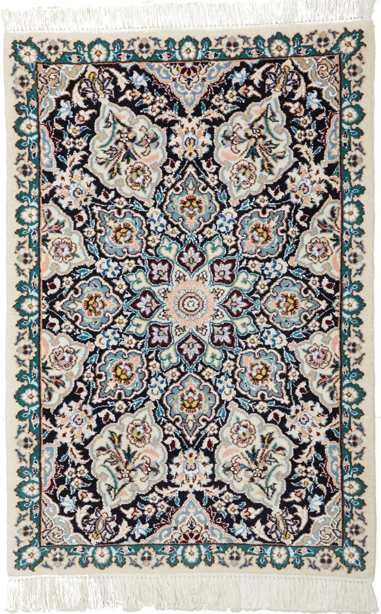 566$Ursprünglicher Preis war: 566$421$Aktueller Preis ist: 421$Handgeknüpfter Nain Teppich | Knotendichte: 500.000 Knoten/m² | Material: 100% Schurwolle (Flor), 100% Baumwolle (Kette) | Größe: 63 x 90 cm | Höhe: ca. 10-12 mm | Herkunft: Iran | Exklusive florale Musterung in hellem Grundton mit königsblauen Akzenten