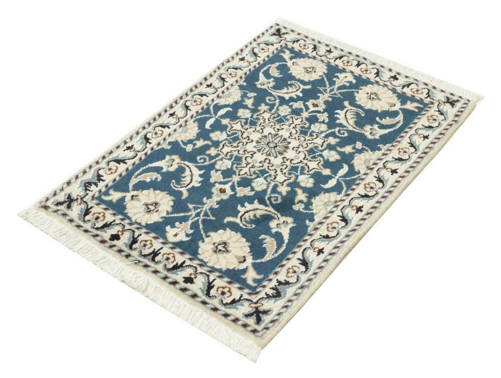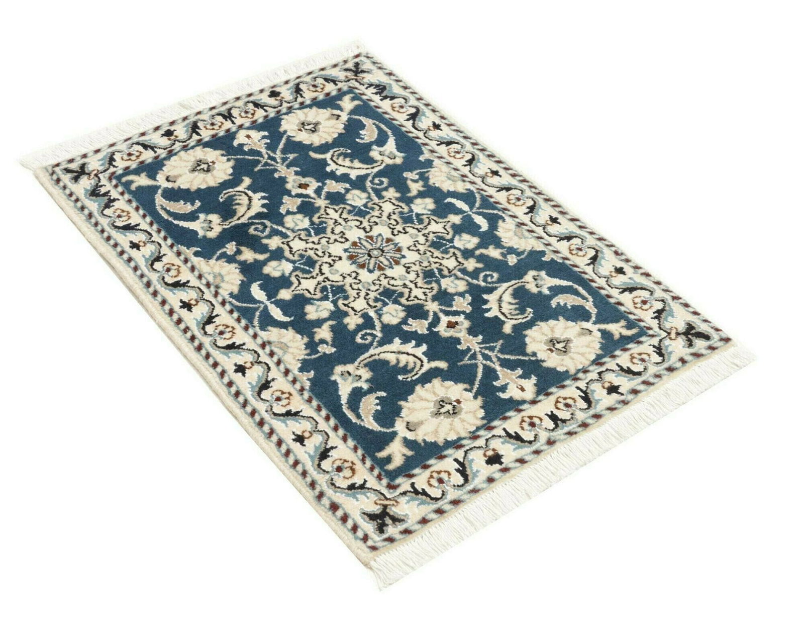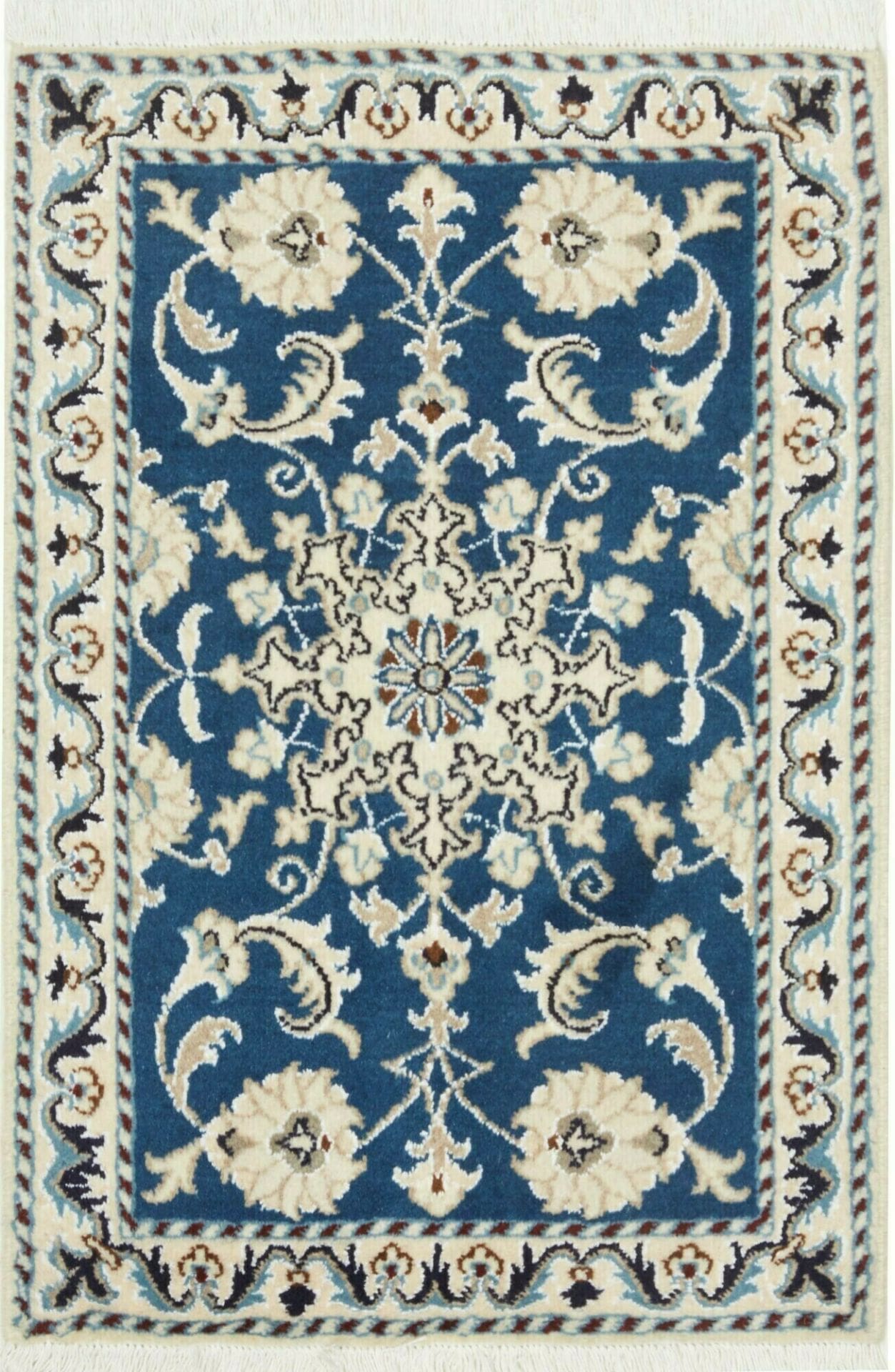 Handgeknüpfter Nain Teppich | Knotendichte: ca. 200.000 Knoten/m² | Material: 100% Schurwolle im Flor, 100% Baumwolle in der Kette | Größe: 63 x 90 cm | Herkunft: Iran | Höhe: ca. 10-12 mm | Exklusive florale Musterung in hellem Grundton mit königsblauen Akzenten