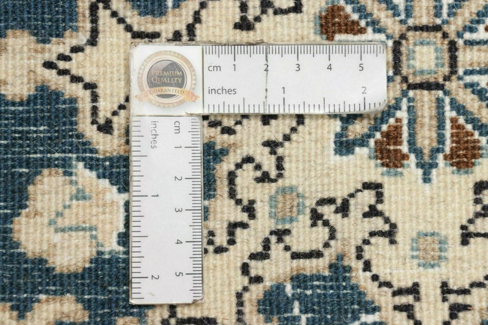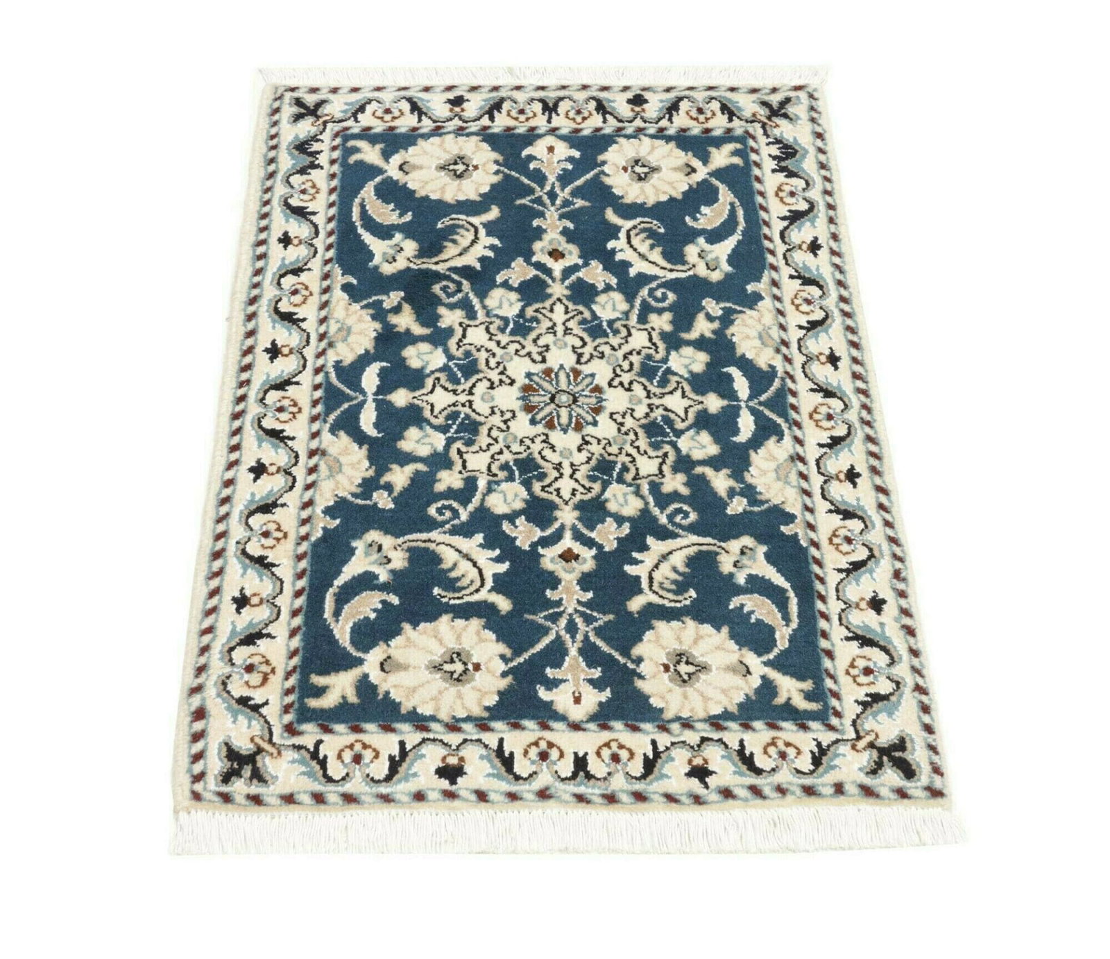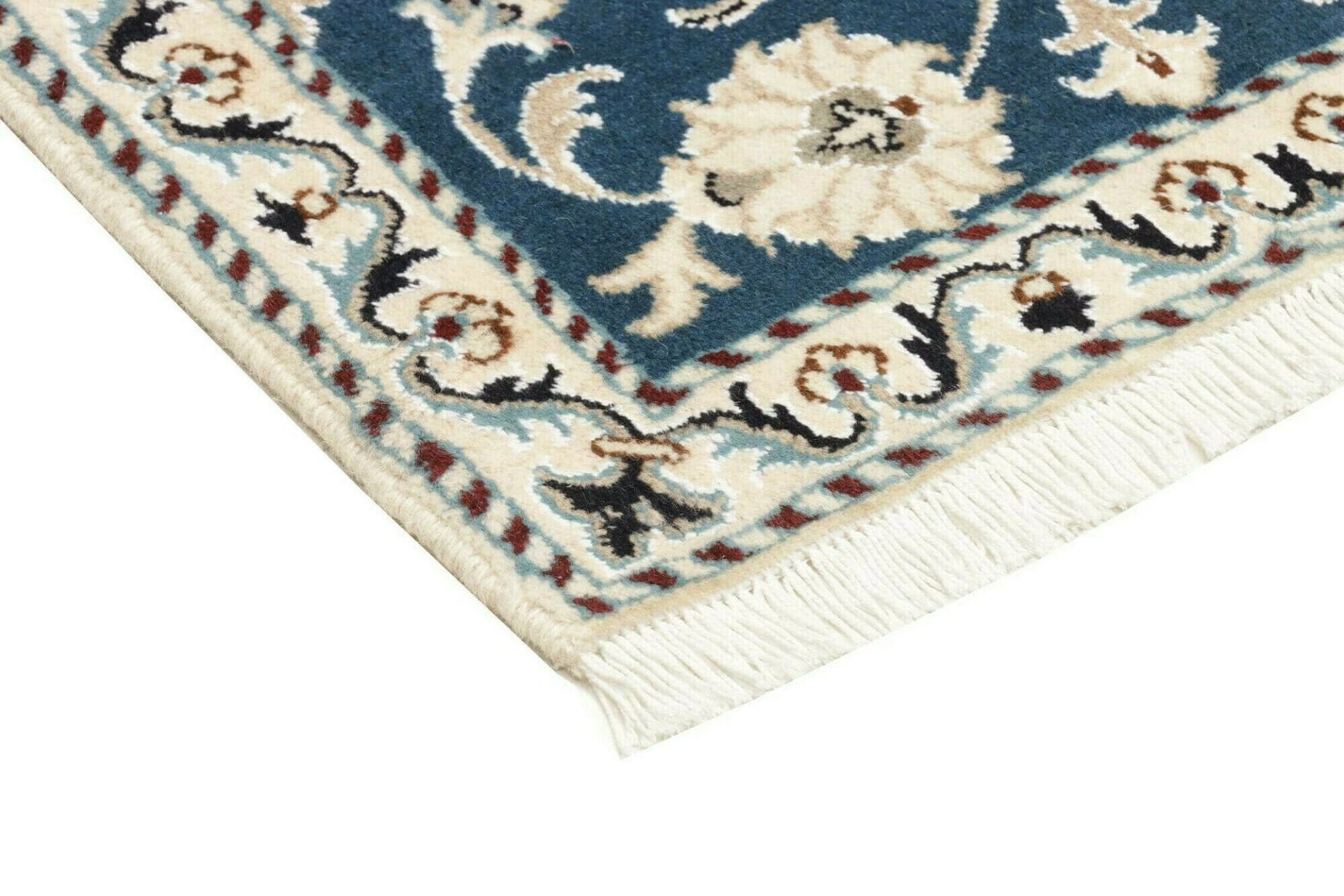 Handgeknüpfter Nain Teppich | Knotendichte: ca. 200.000 Knoten/m² | Material: 100% Schurwolle im Flor, 100% Baumwolle in der Kette | Größe: 63 x 90 cm | Herkunft: Iran | Höhe: ca. 10-12 mm | Exklusive florale Musterung in hellem Grundton mit königsblauen Akzenten