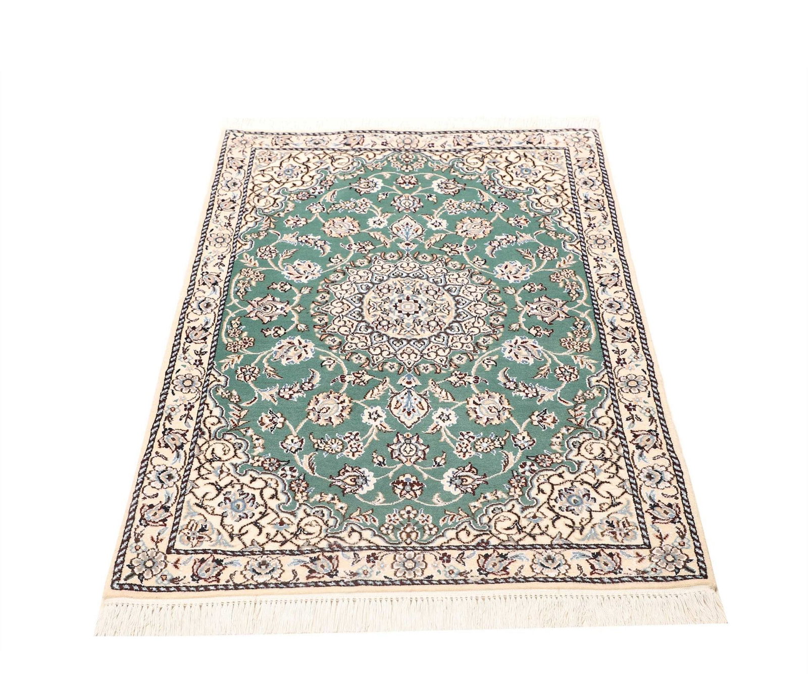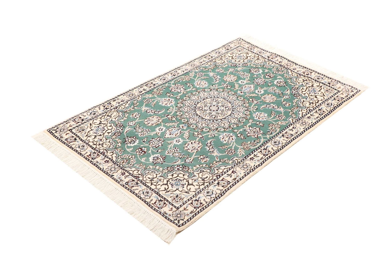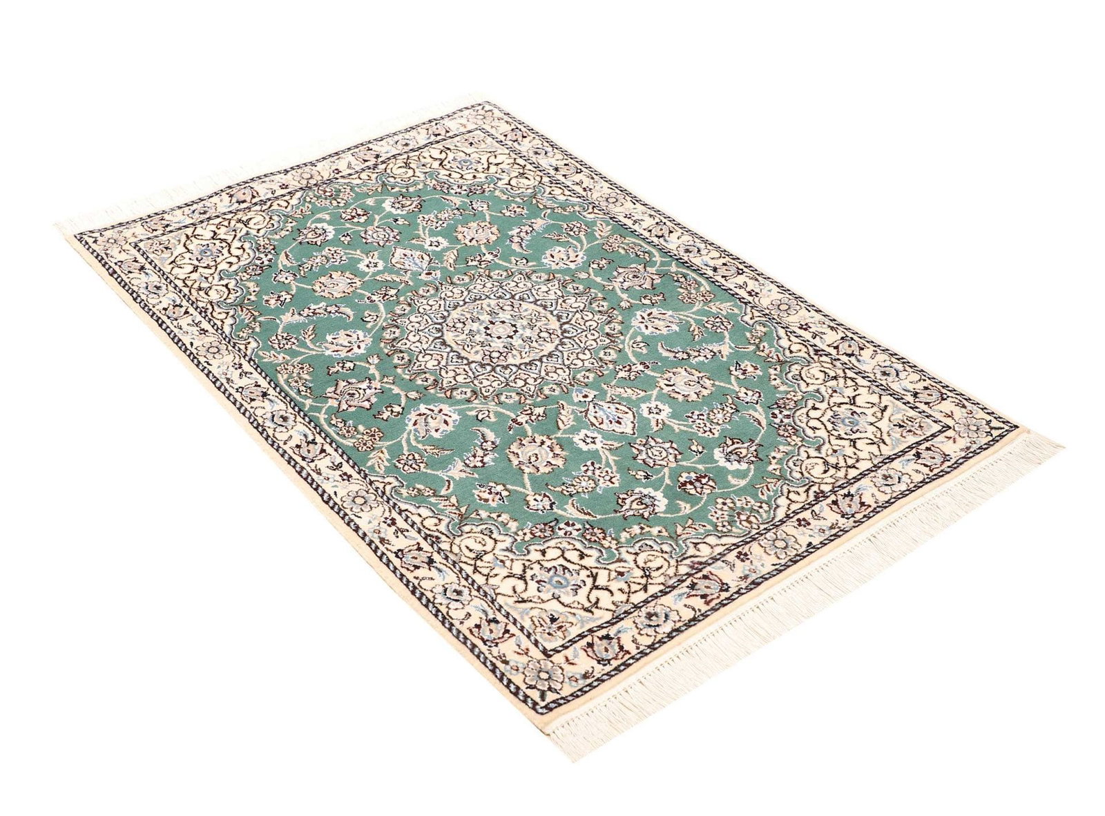 Handgeknüpfter Nain Teppich | Knotendichte: ca. 500.000 Knoten/m² | Material: 100% Schurwolle (Flor), 100% Baumwolle (Kette) | Größe: 83×120 cm | Höhe: ca. 10-12 mm | Herkunft: Iran | Exklusive florale Musterung mit königsblauen Akzenten