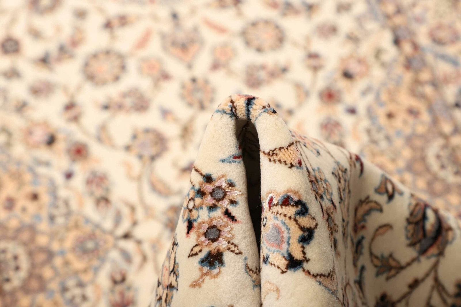 Das florale Muster, das diesen Nain Teppich ziert, ist ein wunderbares Beispiel für die Kunstfertigkeit der Teppichknüpfer. Die oft reichen Details und geschwungenen Linien sind nicht nur ein visueller Genuss, sondern tragen auch eine tiefere symbolische Bedeutung. Florale Muster stehen in vielen Kulturen für Wachstum, Leben und die Schönheit der Natur.