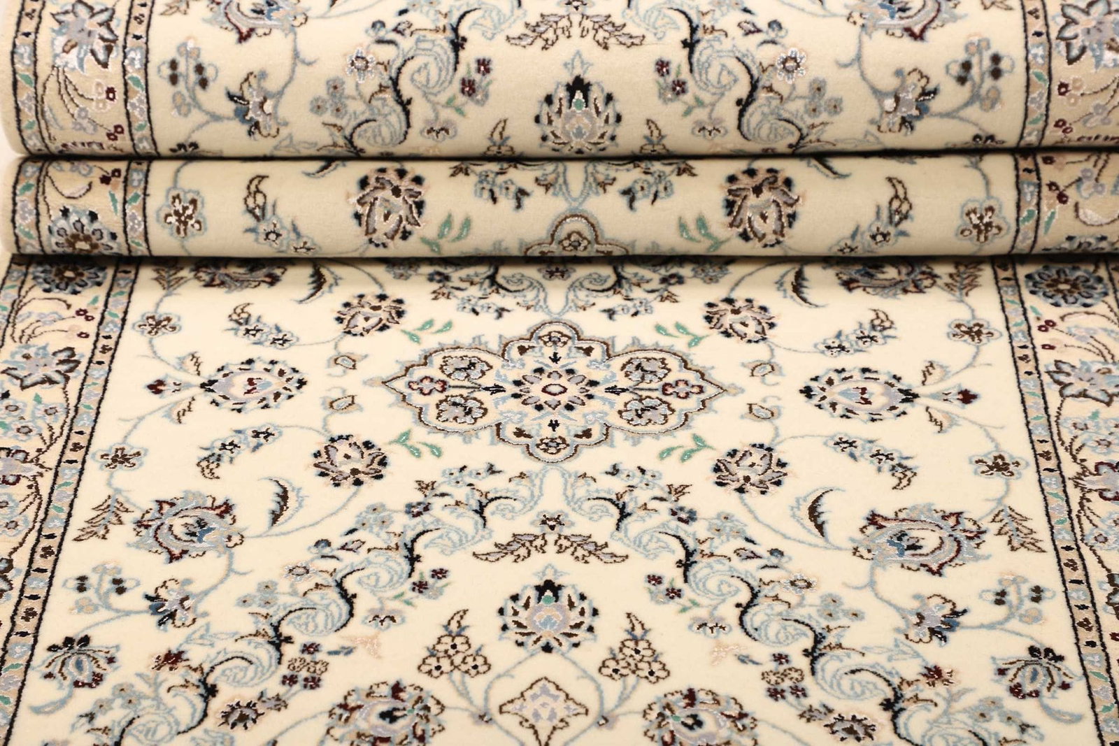 Die Teppiche aus Nain sind traditionell aus hochwertiger Wolle und Seide gefertigt, was ihnen eine luxuriöse Textur und eine hohe Haltbarkeit verleiht. Die Knotendichte dieser Teppiche ist bemerkenswert hoch, was bedeutet, dass sie sehr detailreich sind und eine lange Lebensdauer haben. Handgeknüpft von erfahrenen Teppichknüpfern, zeigt jeder Teppich die Fähigkeiten und das Handwerk, das von Generation zu Generation weitergegeben wird. Diese manuelle Verarbeitung sorgt nicht nur für eine langlebige Qualität, sondern auch für die Individualität jedes Teppichs – kein Stück gleicht dem anderen.