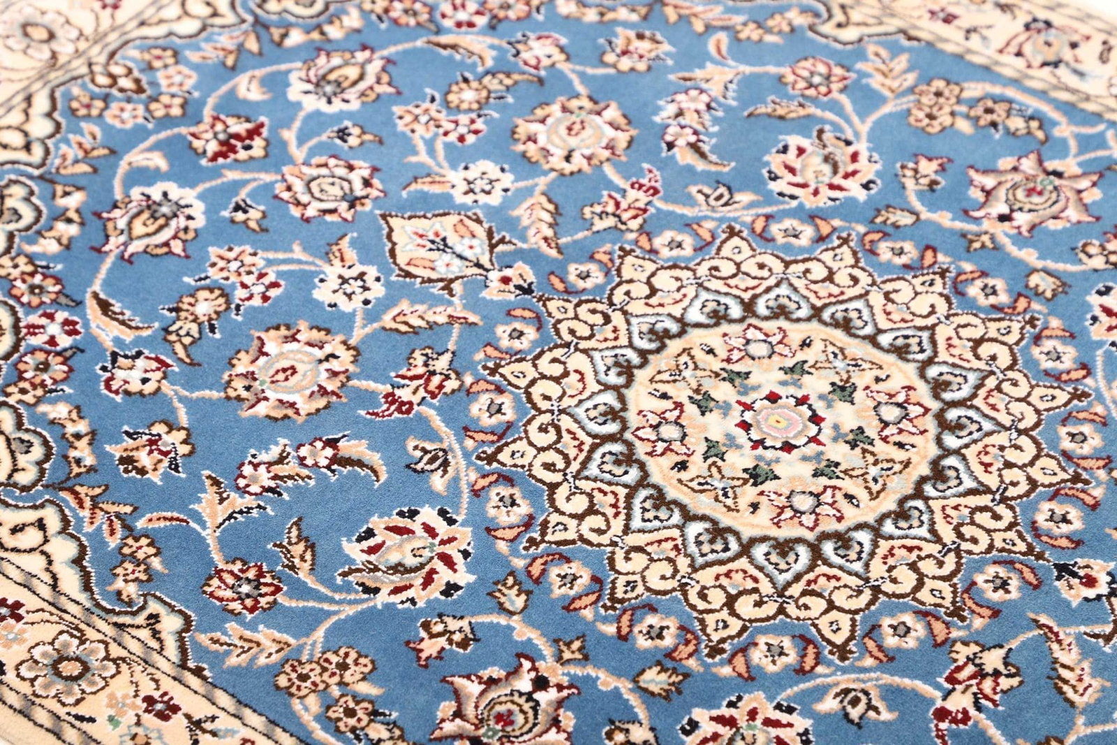Typische Farben für Nain Teppiche sind zarte Blau- und Cremetöne, die mit sanften Erdtönen kombiniert werden. Diese Farbpalette sorgt für eine angenehme Atmosphäre und passt sich mühelos an die vorhandene Einrichtung an.