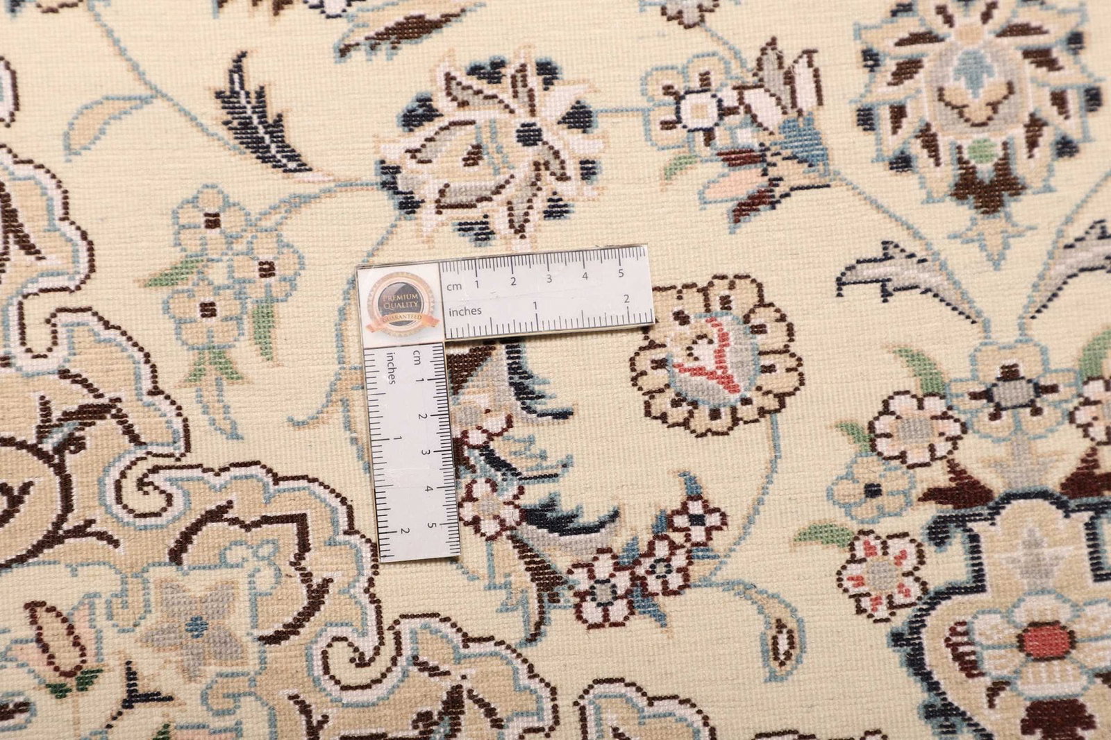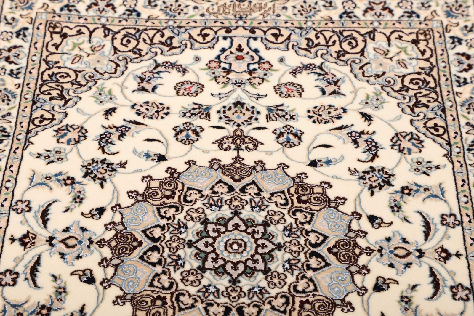 Dieser Nain Teppich wird aus hochwertigen Materialien hergestellt, die für ihre Langlebigkeit und ihren luxuriösen Look bekannt sind. Perserteppiche sind traditionell aus Wolle und Seide gefertigt. Die Verwendung dieser Naturfasern verleiht dem Teppich nicht nur eine angenehme Haptik, sondern sorgt auch dafür, dass die Farben lebendig und strahlend bleiben. Die Knotendichte dieses Teppichs ist bemerkenswert hoch, was bedeutet, dass er eine große Detailtreue aufweist und sehr widerstandsfähig ist gegen Abnutzung und das Verblassen der Farben, wodurch der Teppich auch nach vielen Jahren noch so gut wie neu erscheint.