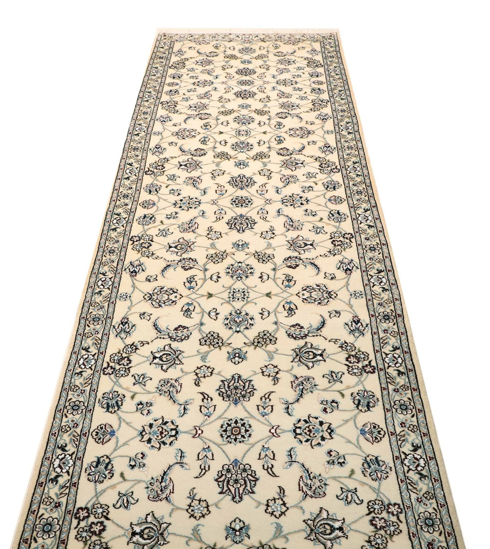 2831$Ursprünglicher Preis war: 2831$2542$Aktueller Preis ist: 2542$Nain Teppich | Knotendichte: ca. 500.000 Knoten/m² | Material: 100% Schurwolle (Flor), 100% Baumwolle (Kette) | Größe: 93 x 332 cm | Herkunft: Iran | Zustand: Handgeknüpft, exklusive Qualität | Muster: Klassische florale Motive in hellen und königsblauen Tönen