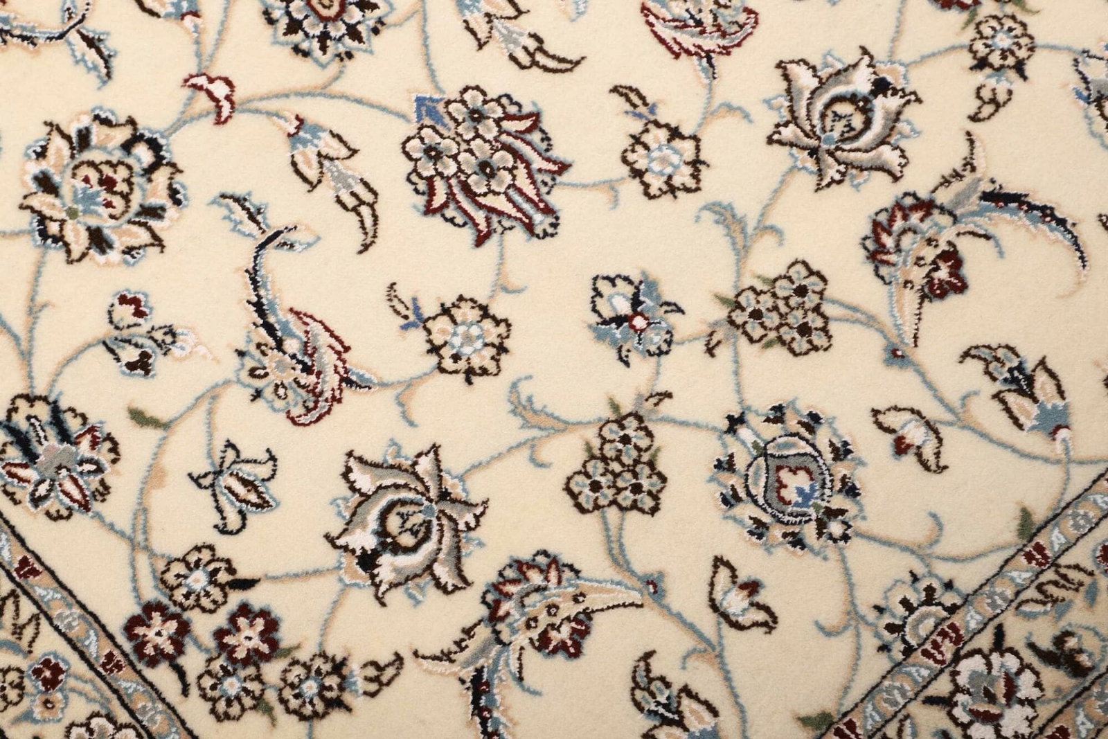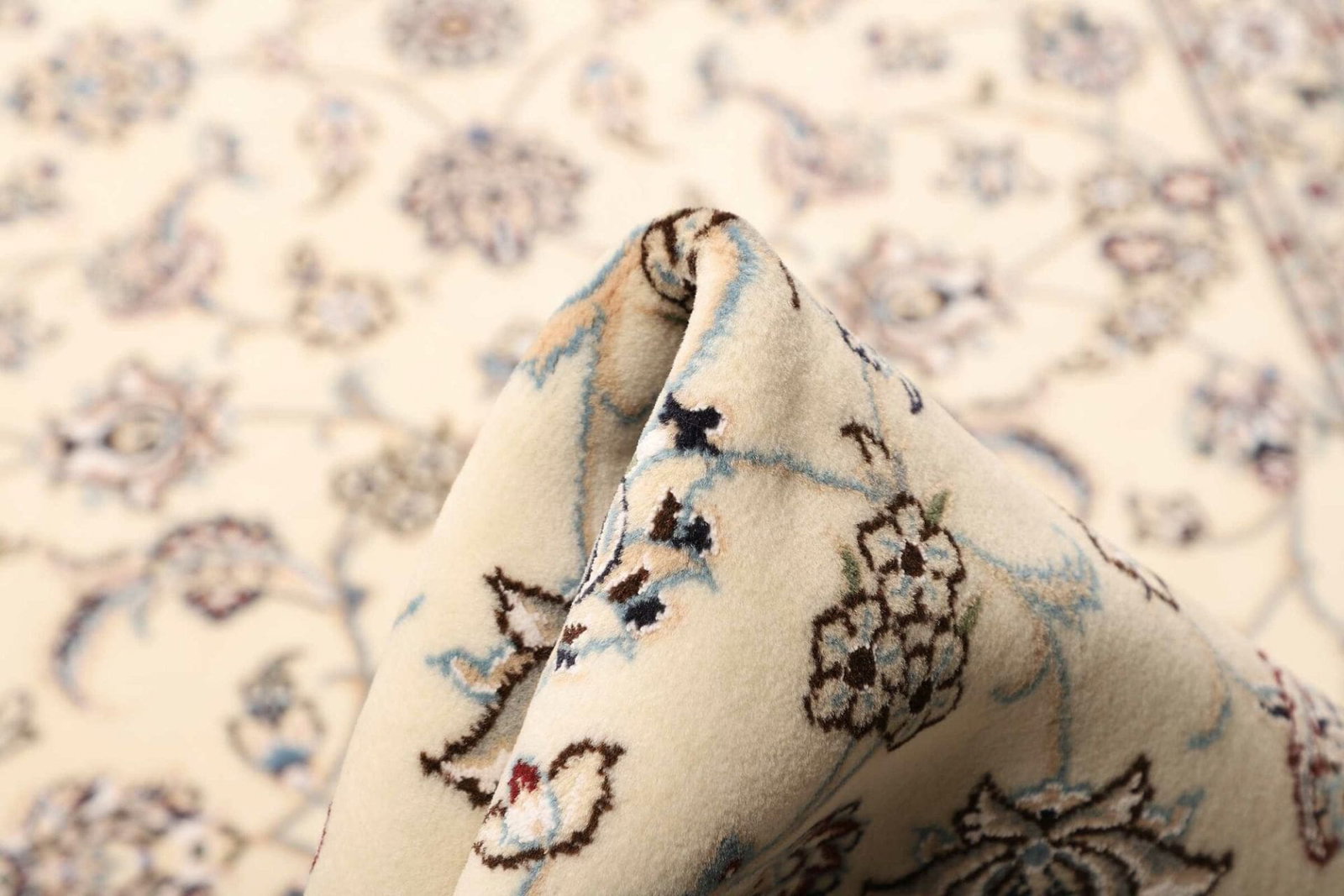 Der Nain Teppich wird aus hochwertigen Materialien hergestellt, die für ihre Langlebigkeit und Weichheit bekannt sind. Die Verwendung von Wolle und Seide trägt dazu bei, dass die Farben lebendig und die Muster klar und detailliert sind. Die Knotentechnik, bei der jeder Knoten mit Sorgfalt und Präzision gefertigt wird, sorgt für eine hohe Knotendichte, die dem Teppich nicht nur ein luxuriöses Aussehen verleiht, sondern auch seine Widerstandsfähigkeit garantiert. Handgeknüpfte Teppiche sind bekannt für ihre überlegene Qualität, und dieser Nain Teppich ist da keine Ausnahme. Er besitzt eine bemerkenswerte Festigkeit, die auch bei täglichem Gebrauch besteht.