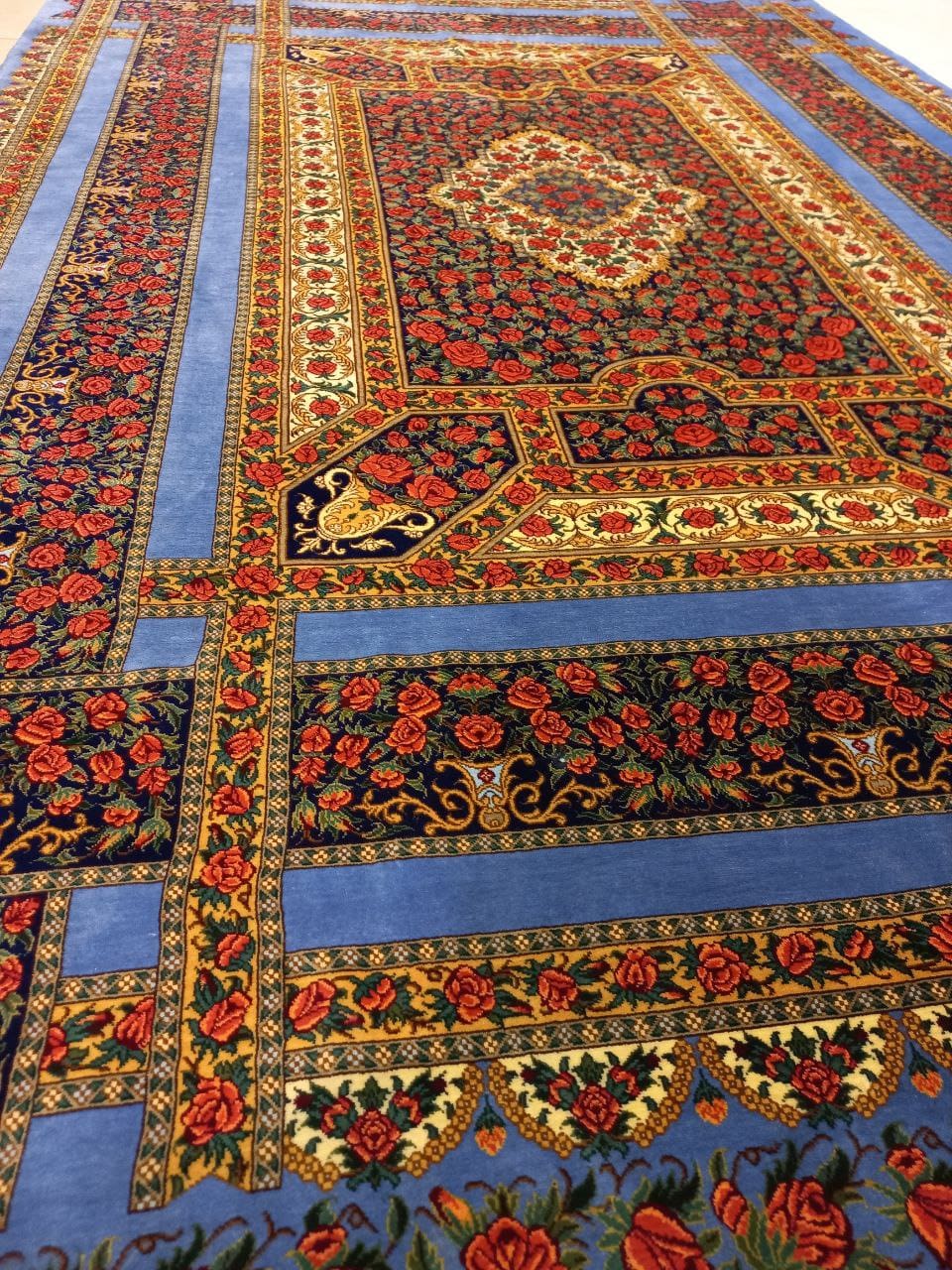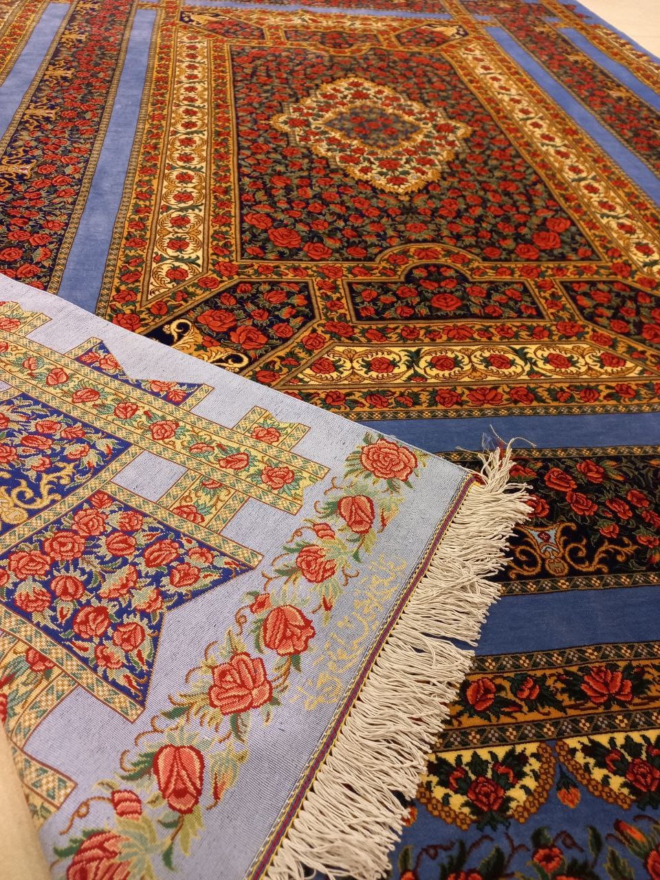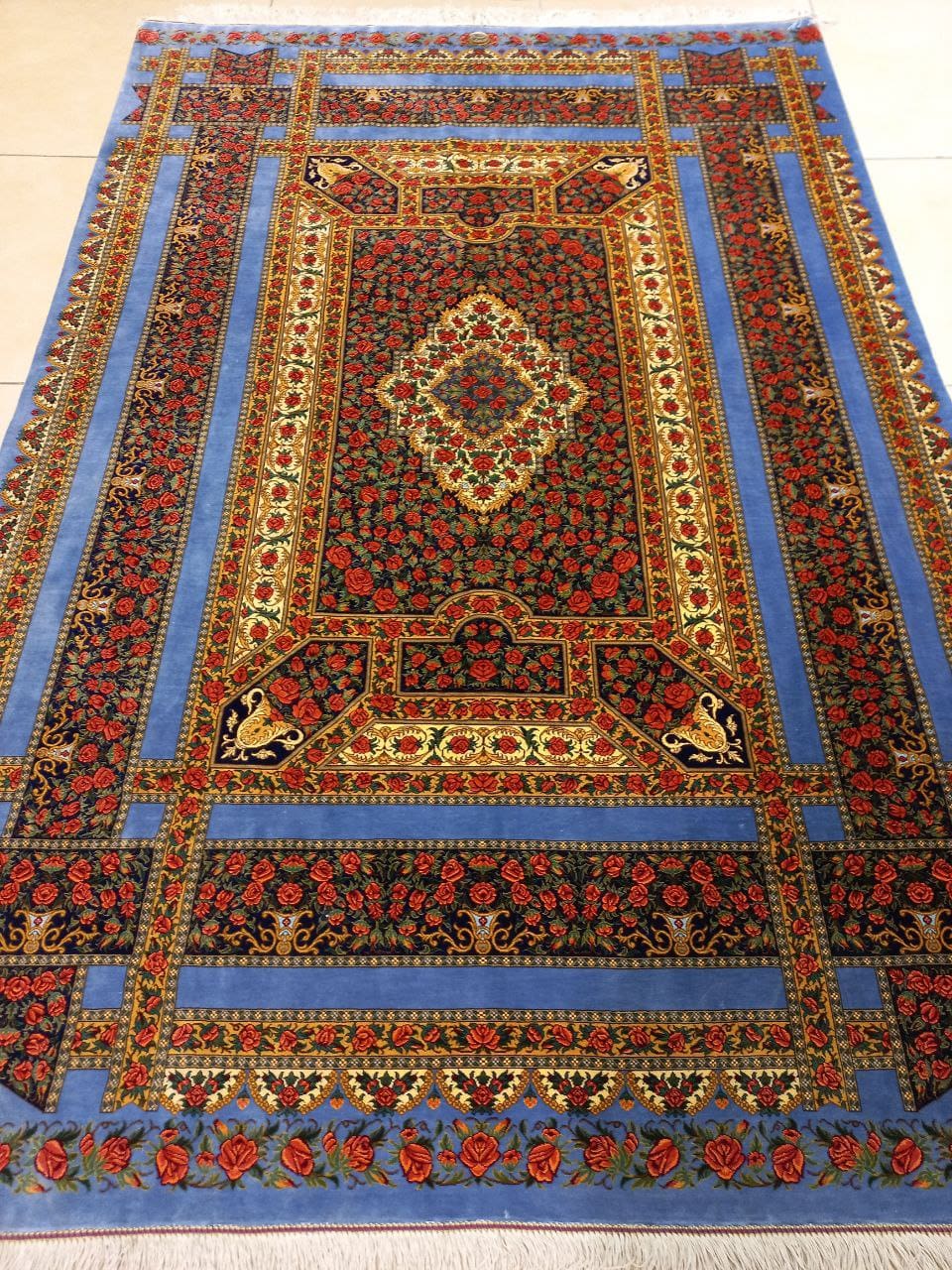 Die Farbkombination Rot–Blau gehört zu den wertvollsten und klassischsten Ausführungen im persischen Seidenteppich-Design. Das kräftige Rot betont das Toranj-Medaillon, während edle Blautöne die Eckornamente hervorheben – eine zeitlose Komposition, die in jeder Beleuchtung intensiv schimmert.