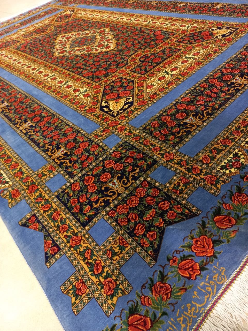 200 × 135 cm | Handgeknüpfter Rahmani Ghom Seidenteppich „Blue Edition – Rose Classic – Lachak Toranj“ | ca. 2,70 m² | Knotendichte: 70 Raj (≈ 1.198.050 Knoten/m² ≈ 11.980 Knoten / 10×10 cm) | Gesamtknoten: 3.234.735 | Arbeitsstunden: 5.175 h | Design: Klassisches Rosenmotiv mit Lachak & Toranj (Ecken & Medaillon) | Farben: Rot & Blau | Herkunft: Qom, Iran | Hersteller: Rahmani Carpet | Material: Flor 100 % Naturseide, Kette & Schuss 100 % Seide | Knüpftechnik: Offset Warp, symmetrisch | Gewicht: ca. 5,8 kg | Dauer: 16–17 Monate | Zustand: Neu | Wir sind offizieller Partner von Rahmani in Europa & liefern weltweit versichert | Maßanfertigungen in allen Farben und Größen möglich | Mehr über unsere Partnerschaft mit Rahmani: Teppichbazar AT 👉 Link
