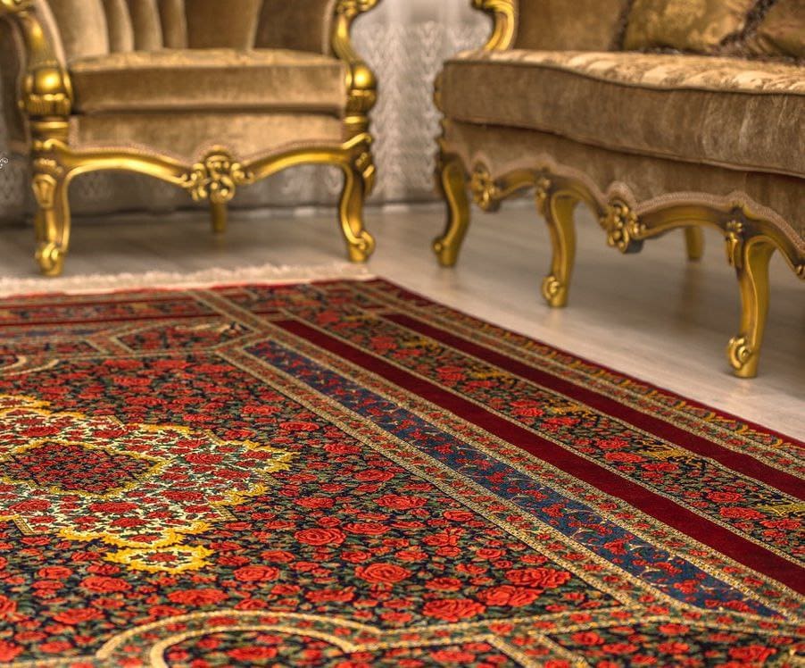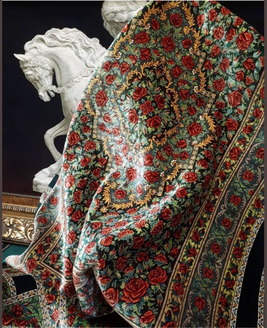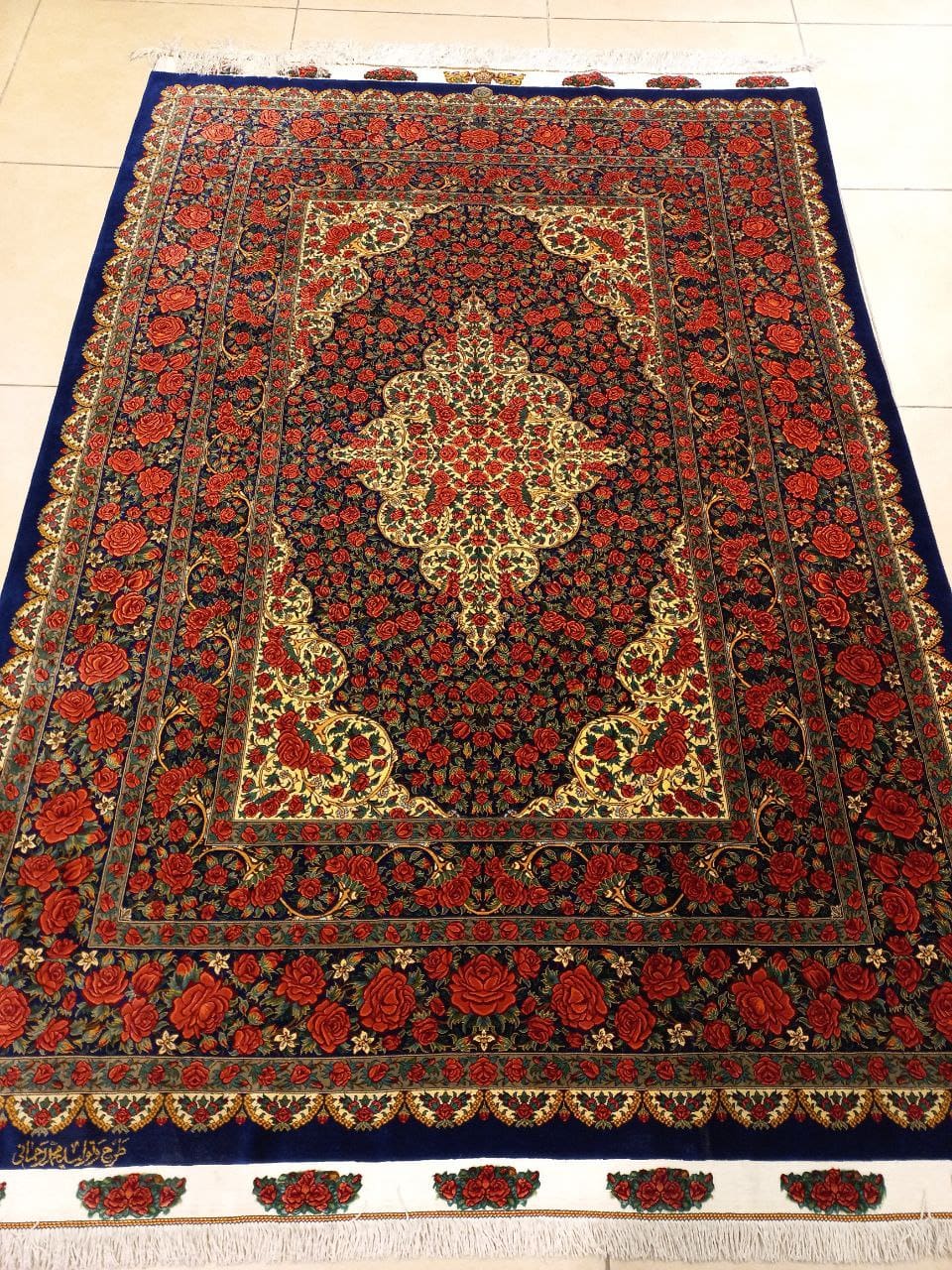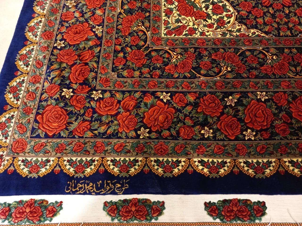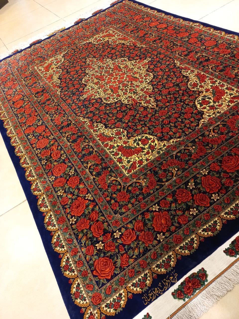 200 × 135 cm | Handgeknüpfter Rahmani Ghom Seidenteppich „Rose Classic – Lachak Toranj“ | ca. 2,70 m² | Knotendichte: 70 Raj (≈ 1.198.050 Knoten/m² ≈ 11.980 Knoten / 10×10 cm) | Gesamtknoten: 3.234.735 | Arbeitsstunden: 5.175 h | Design: Klassisches Rosenmotiv mit Lachak & Toranj (Ecken & Medaillon) | Farben: Rot & Blau | Herkunft: Qom, Iran | Hersteller: Rahmani Carpet | Material: Flor 100 % Naturseide, Kette & Schuss 100 % Seide | Knüpftechnik: Offset Warp, symmetrisch | Gewicht: ca. 5,8 kg | Dauer: 16–17 Monate | Zustand: Neu | Wir sind offizieller Partner von Rahmani in Europa & liefern weltweit versichert | Maßanfertigungen in allen Farben und Größen möglich | Mehr über unsere Partnerschaft mit Rahmani: Teppichbazar AT 👉 Link