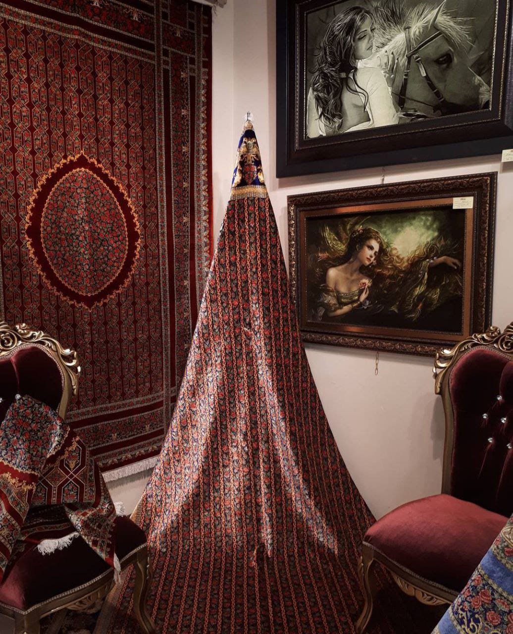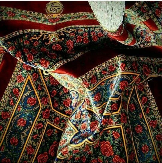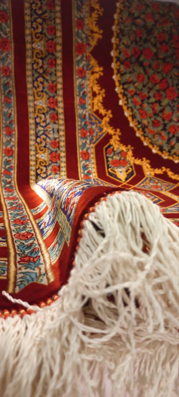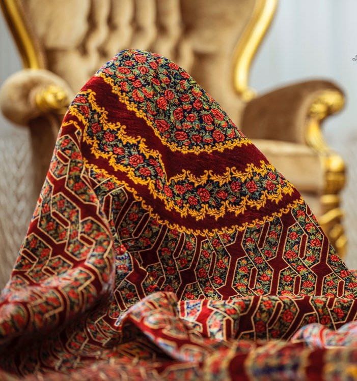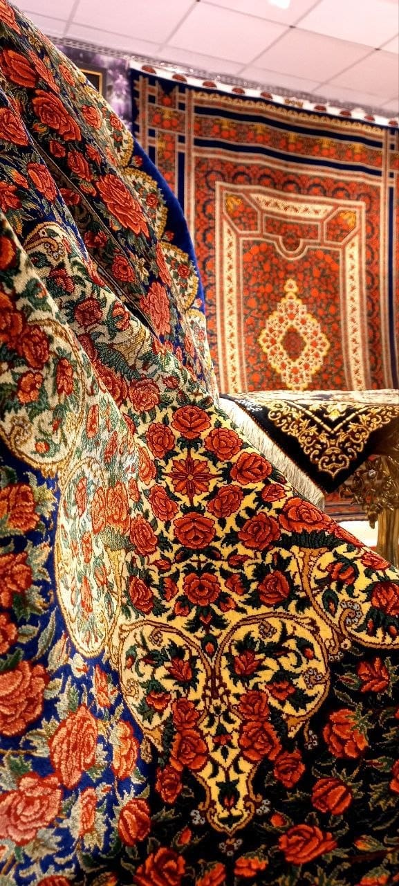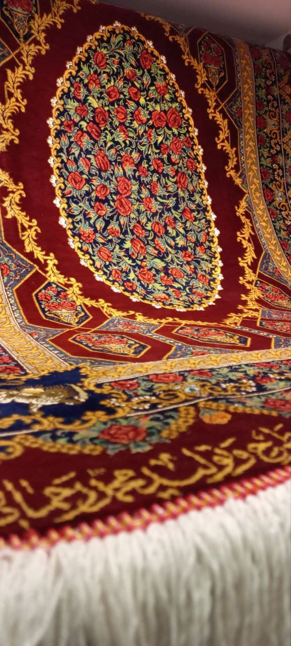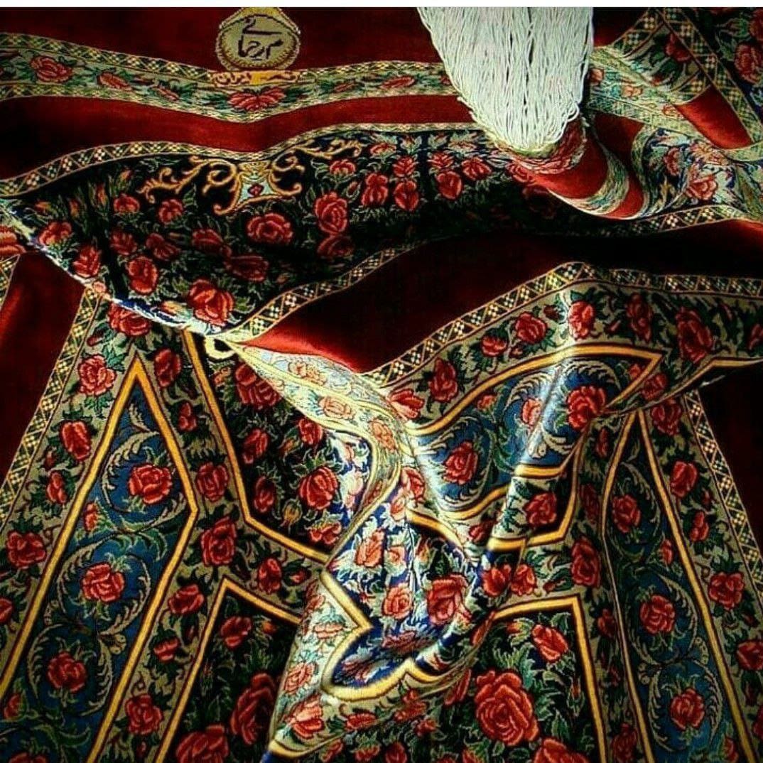 Die Farbkombination Rot–Blau gehört zu den wertvollsten und klassischsten Ausführungen im persischen Seidenteppich-Design. Das kräftige Rot betont das Toranj-Medaillon, während edle Blautöne die Eckornamente hervorheben – eine zeitlose Komposition, die in jeder Beleuchtung intensiv schimmert.